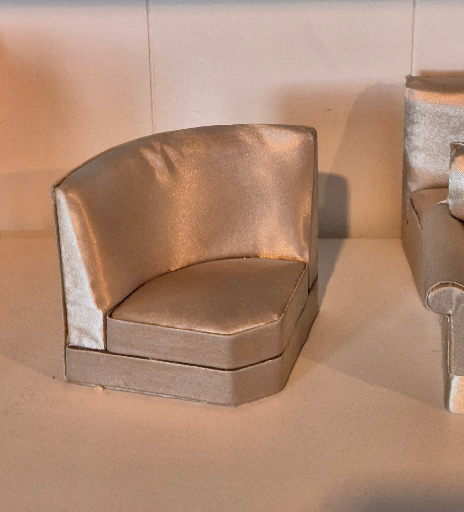 Stor pæn 1:12 hjørnesofa i champagne nuance satin. Udmærket stand.