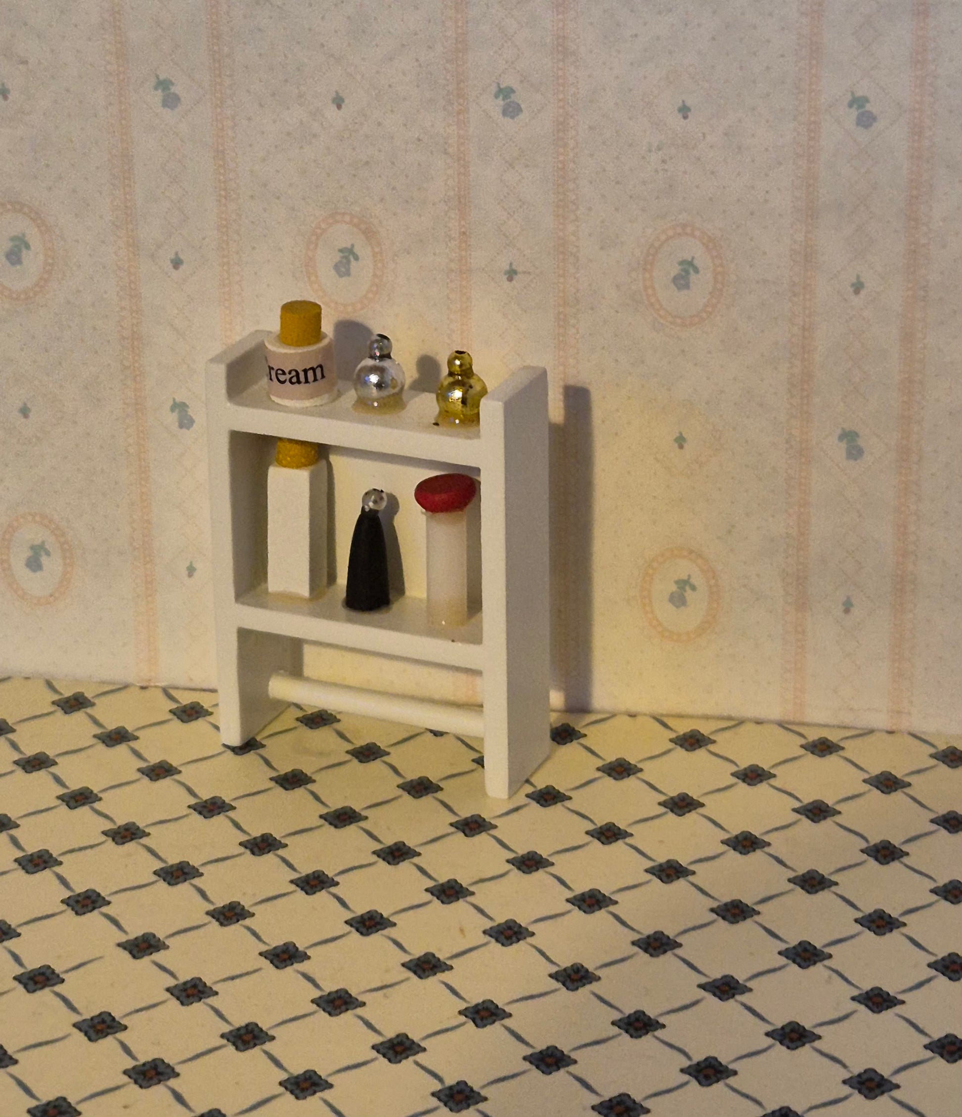 Pæn 1:12 hylde med badeværelse tilbehør. Der mangler et håndklæde ellers udmærket stand.