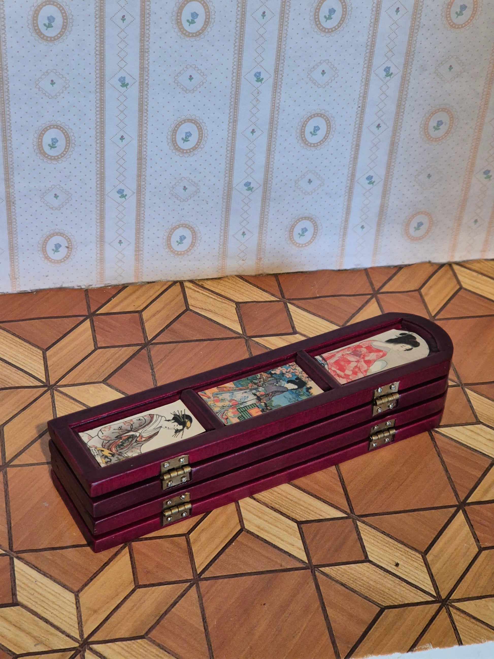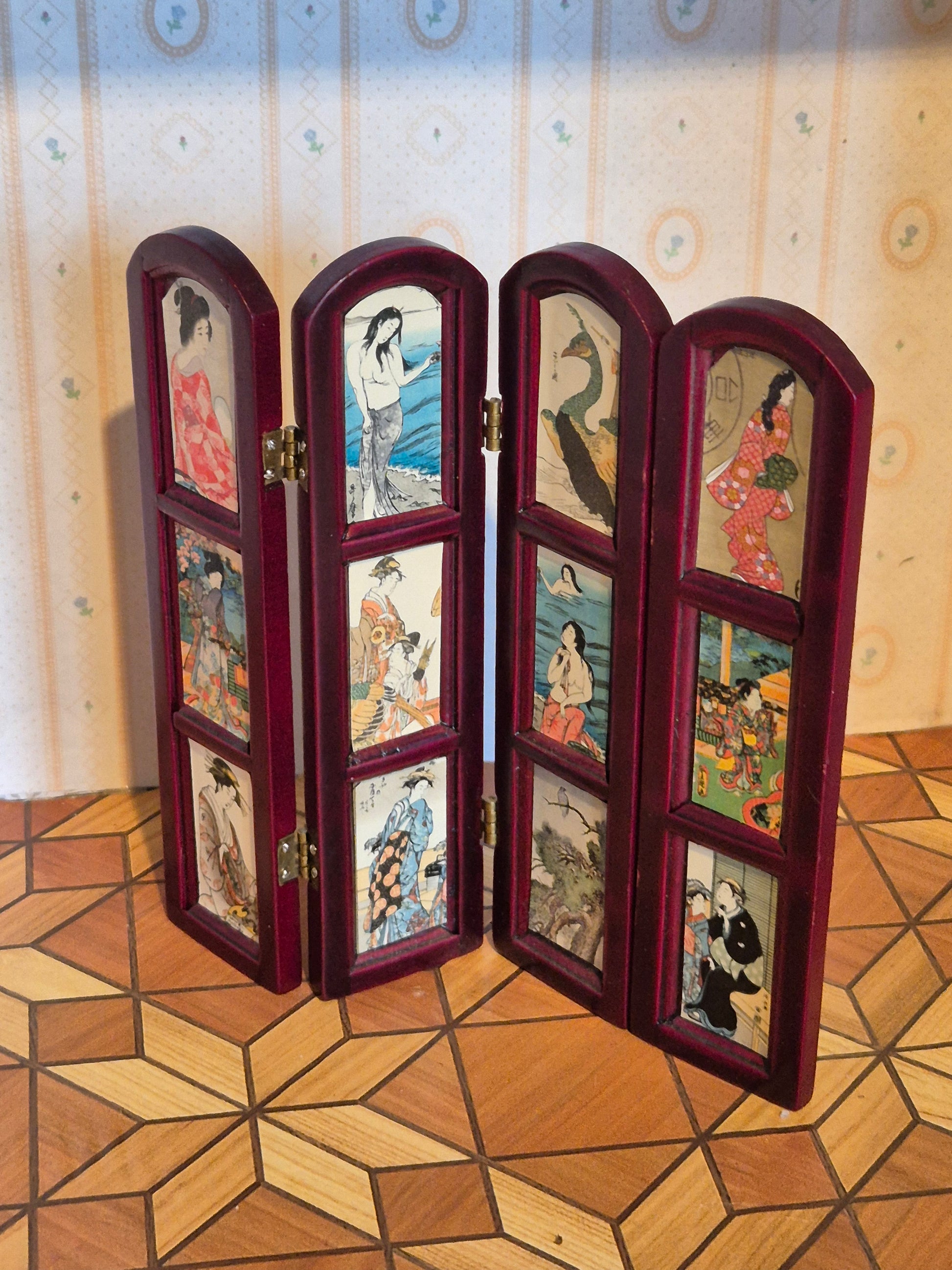 Pæn skærm, foldevæg i rødbrun nuance, der er blevet renoveret med kinesiske billeder. Ser pænt ud. Udmærket stand