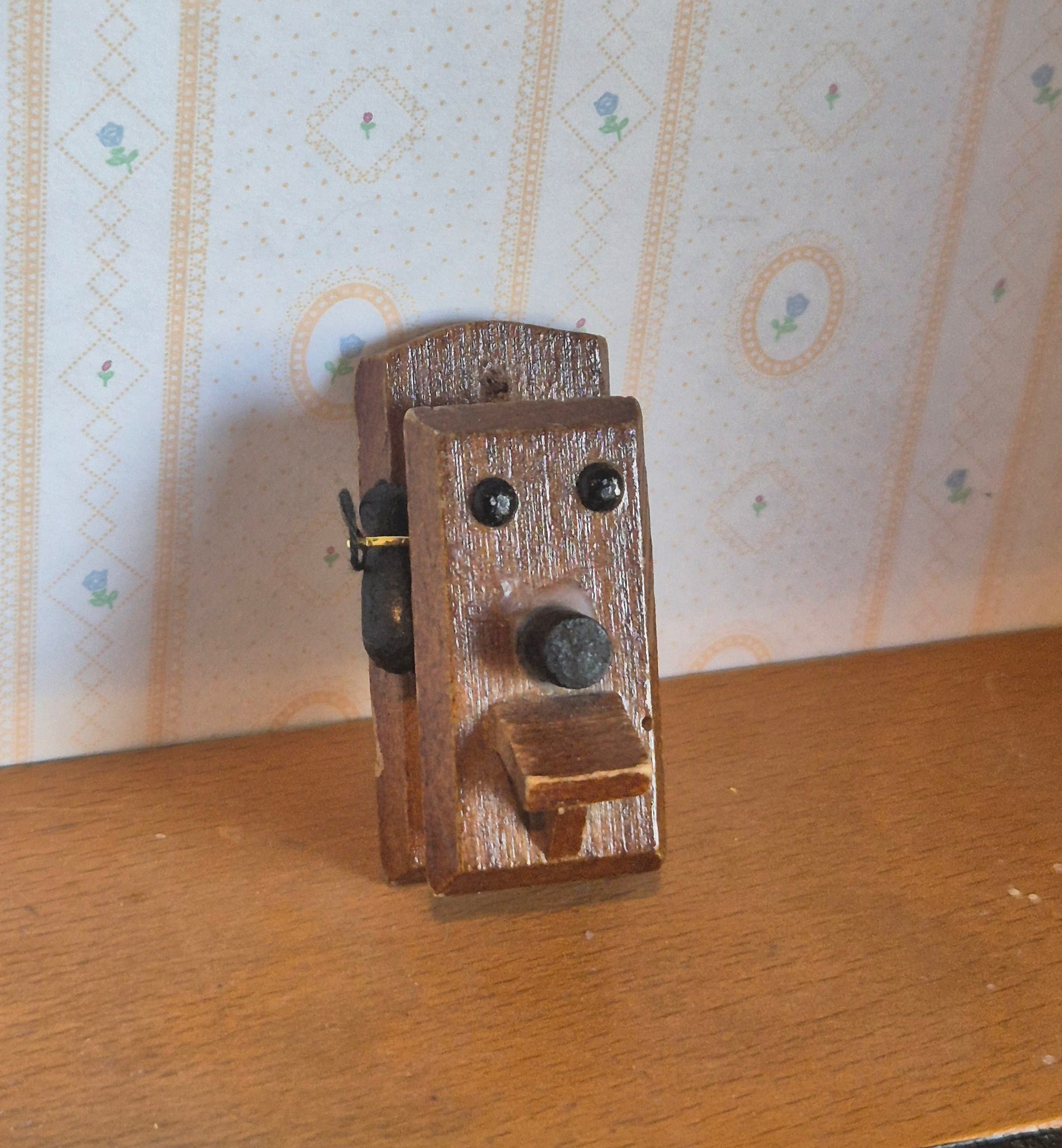1:12 telefon af brunt træ. Udmærket stand dog med lidt lim og mangler telefonsnoren.