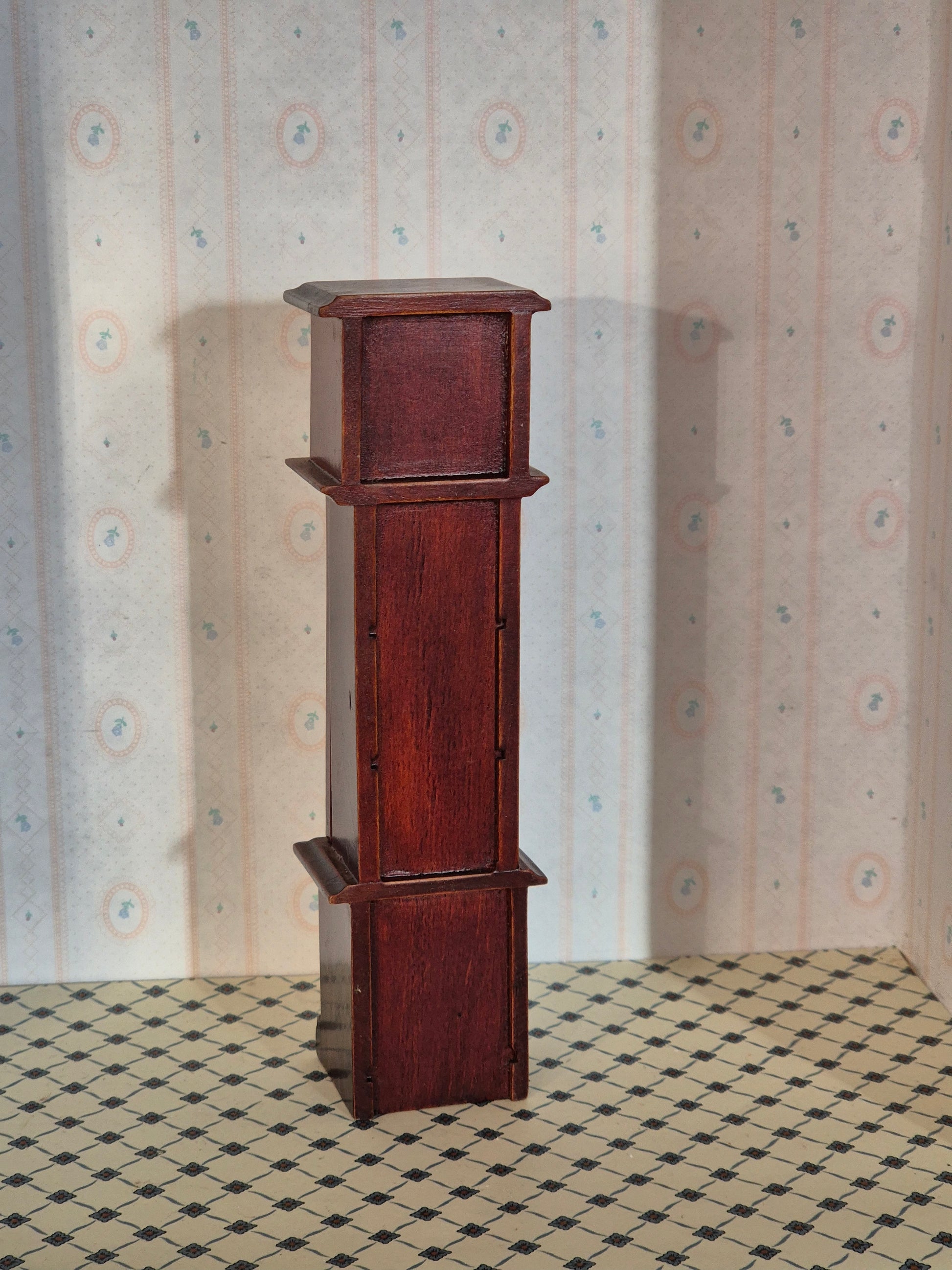 Pænt 1:12 standerur, bedstefar ur, af træ. Der er lidt patina og brugsspor - men standen er pæn. Der er hylder bag lågen.