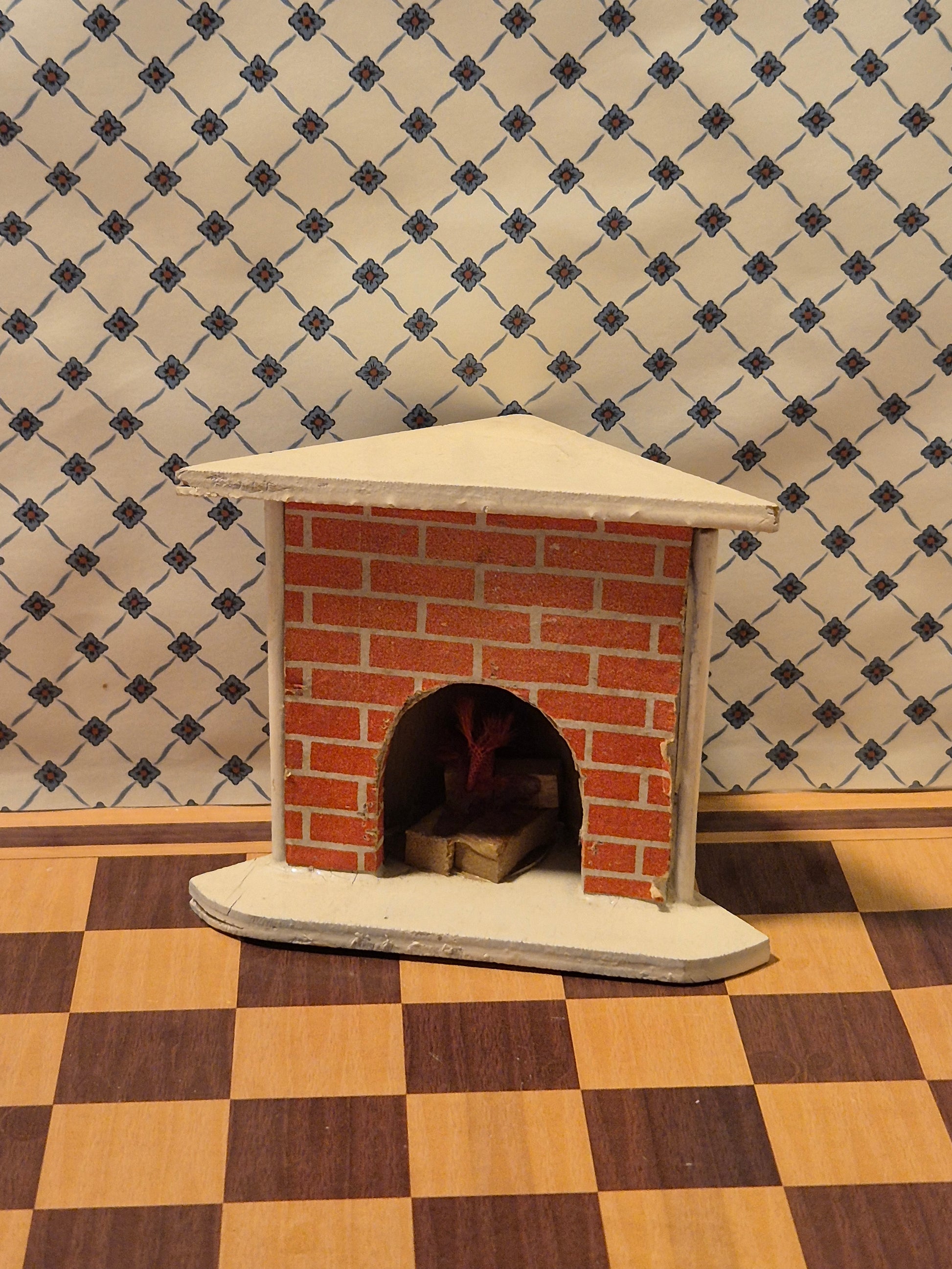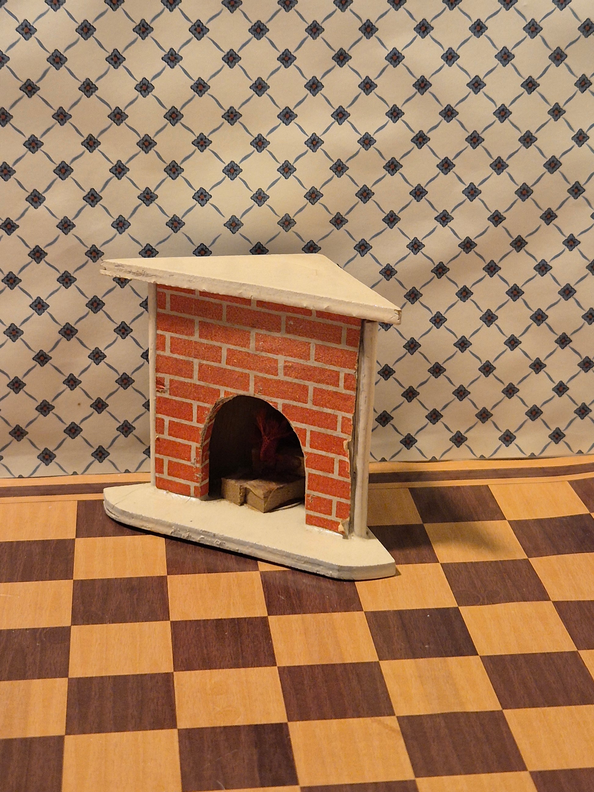 Vintage hjørnepejs eller kamin 1:16. Den er af træ med patina og brugsspor