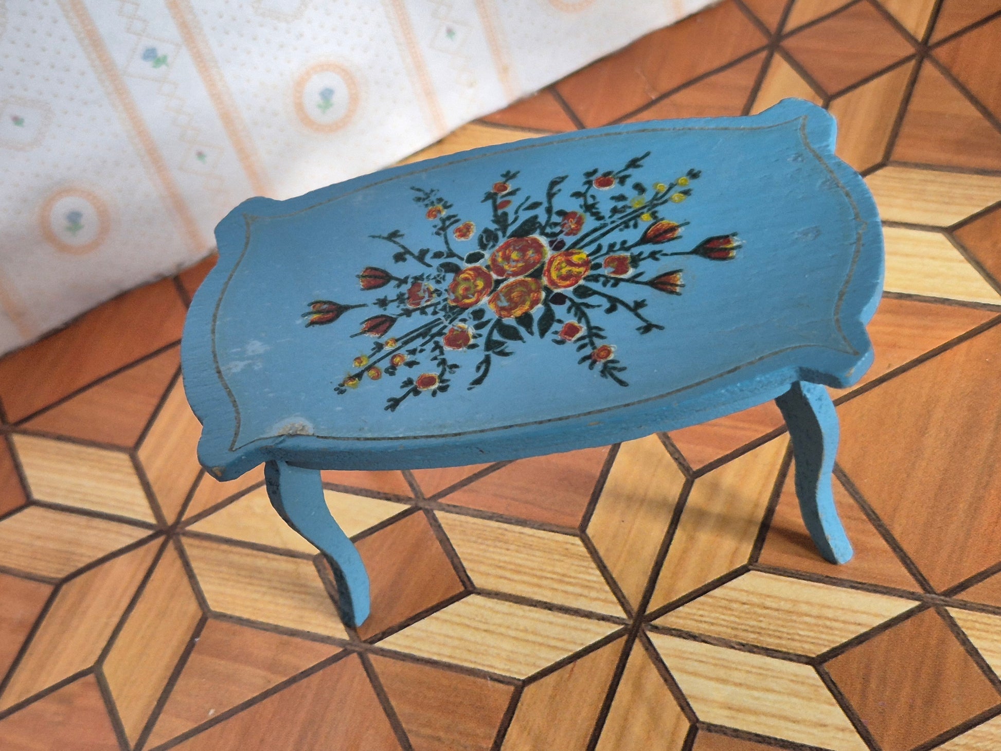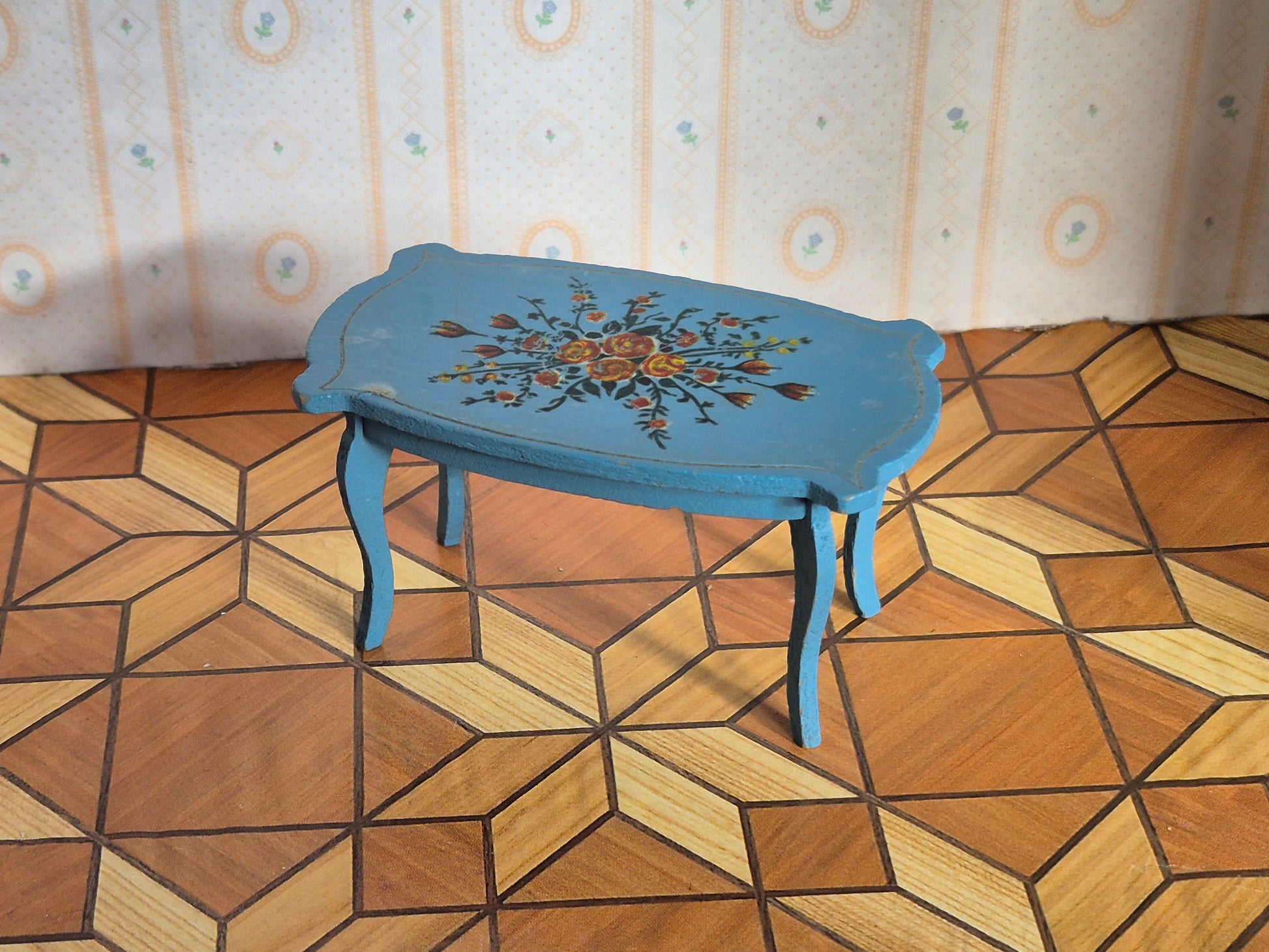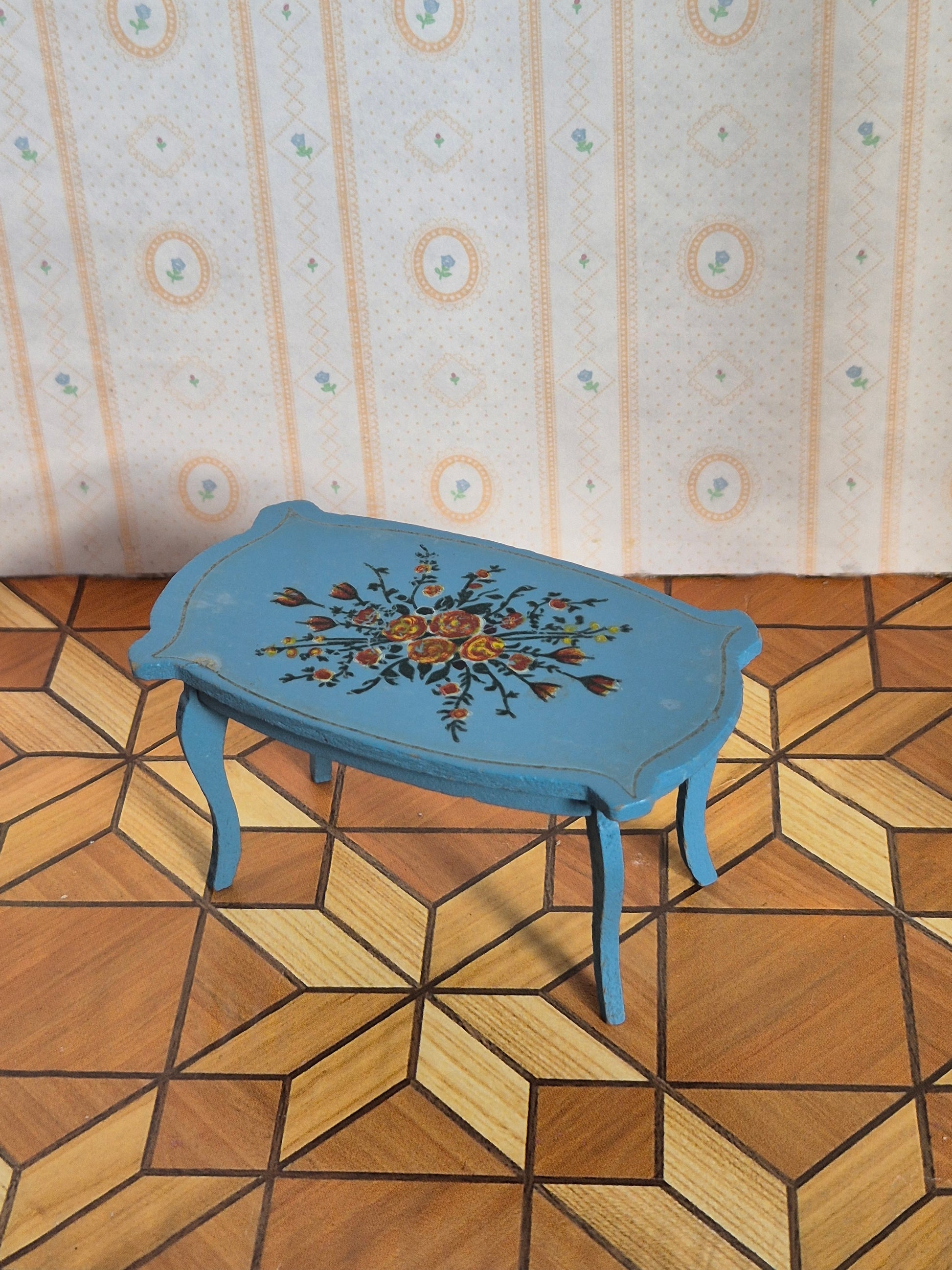 Fint lyseblåt almue bord med blomstermotiv af det danske mærke Lisa af Danmark. God stand med patina