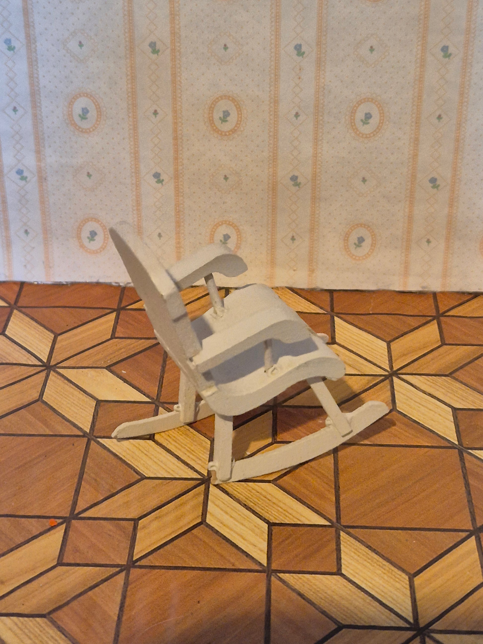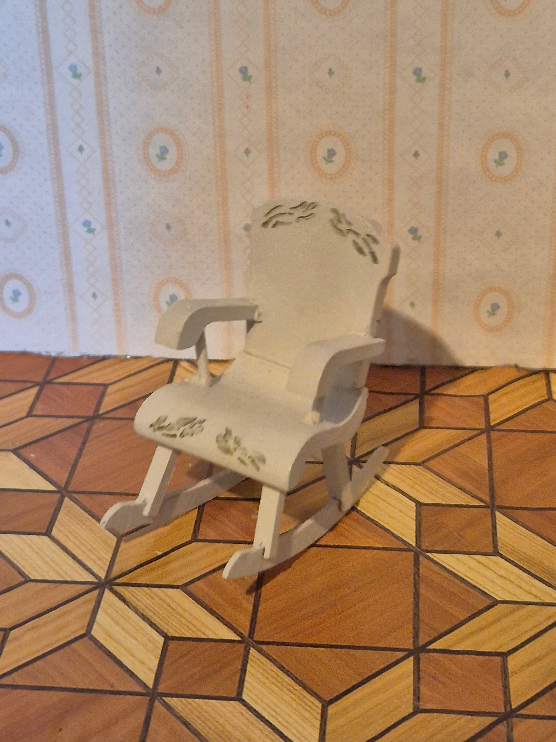 Ældre gyngestol af træ i hvid rokoko stil med gyldne detaljer. Den er af mærket Lisa af Danmark. En af mederne er knækket, på bagsiden. Der er patina.