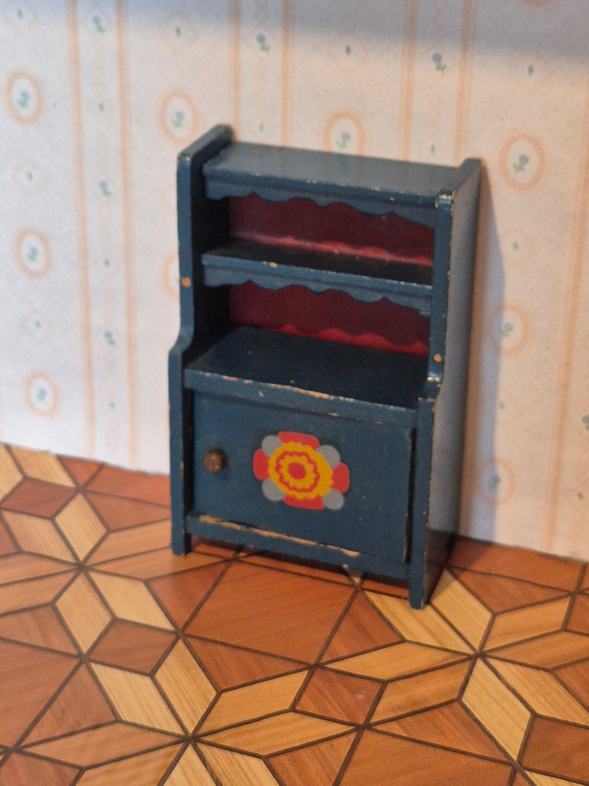 Ældre mørkeblåt skab med hylder og låge af Lisa af Danmark. Der er patina og brugsspor