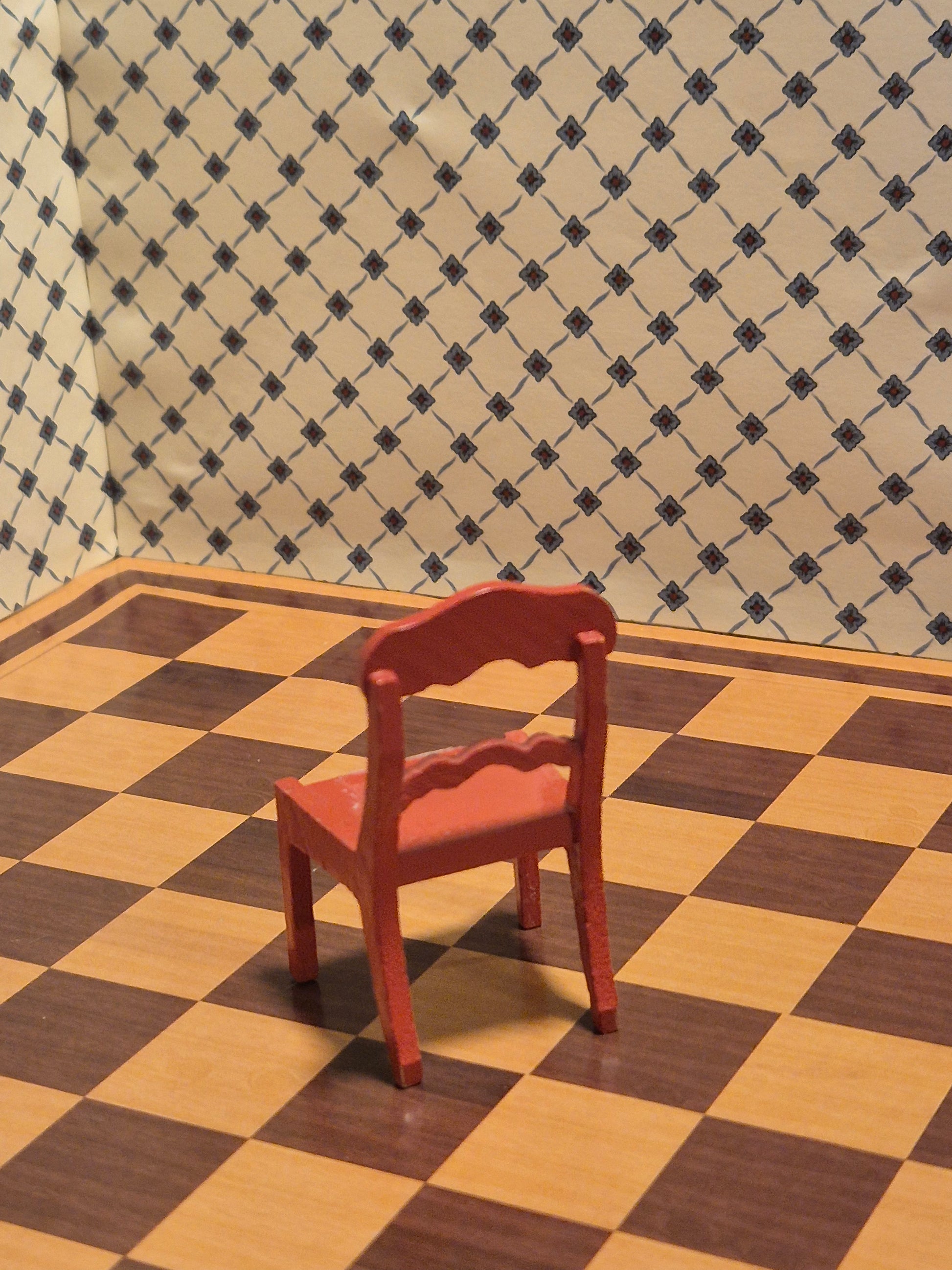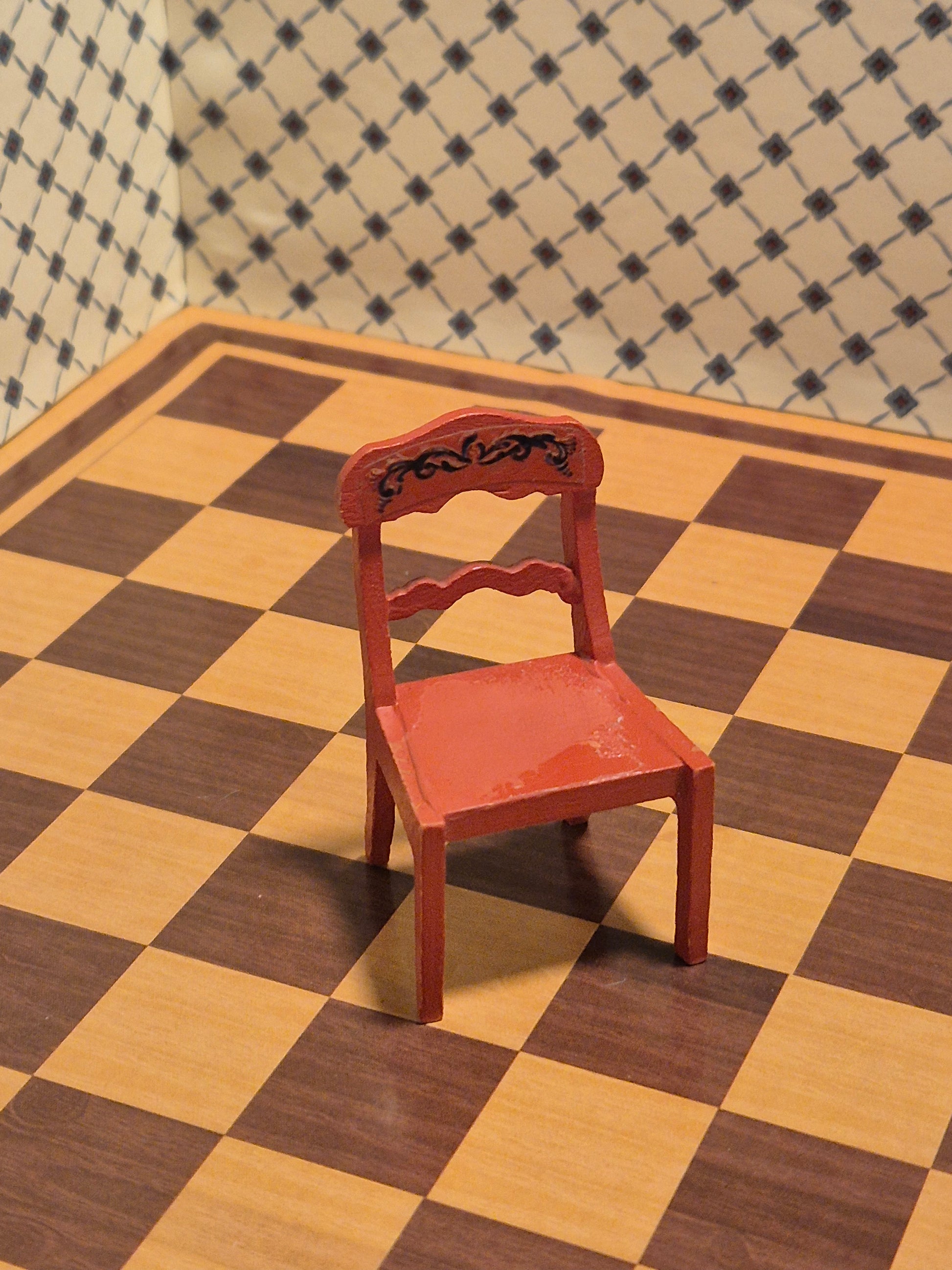God Lisa af Danmark stol i rød almue stil med pæne detaljer og udskæring. Den mangler sædepuden.
