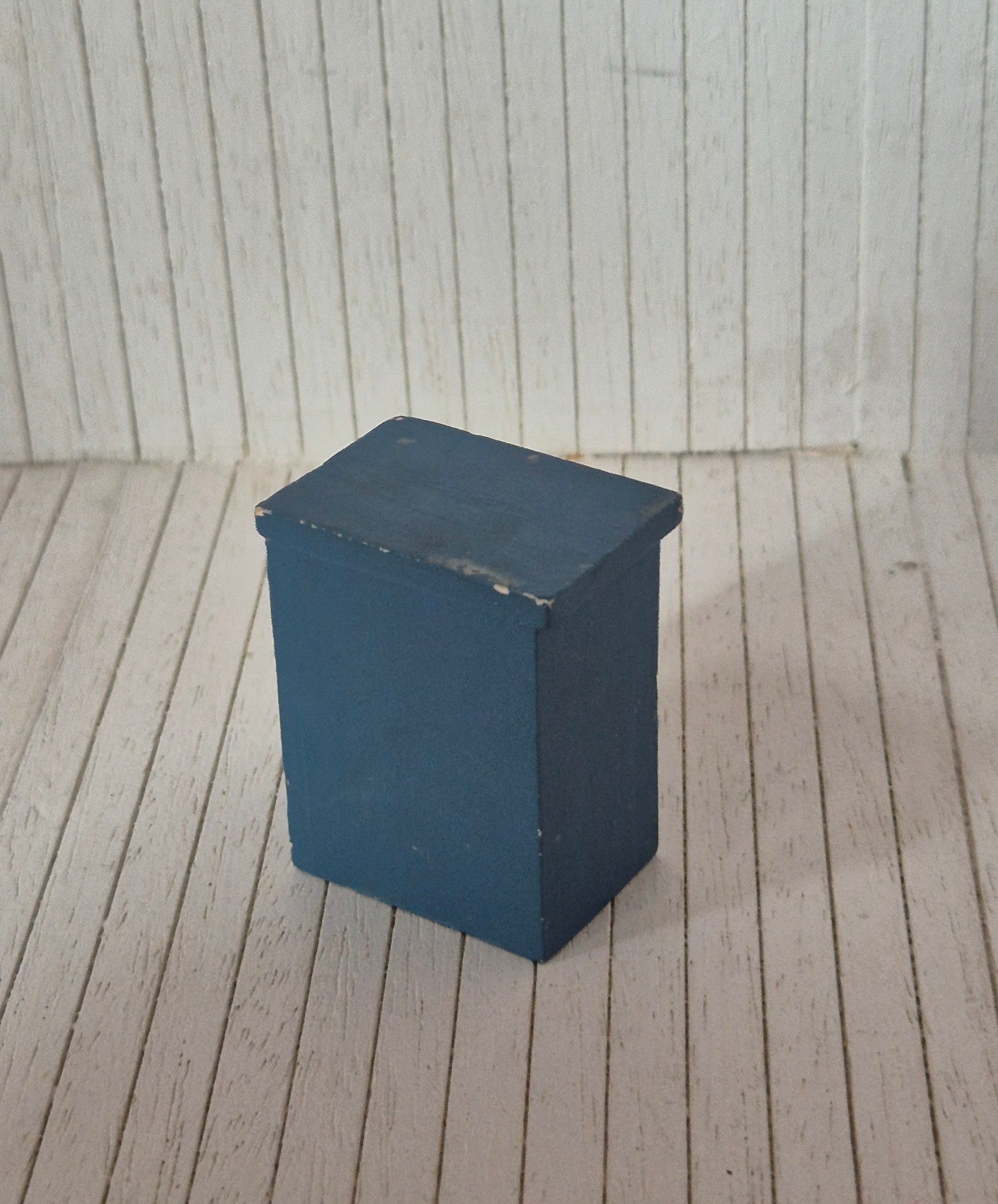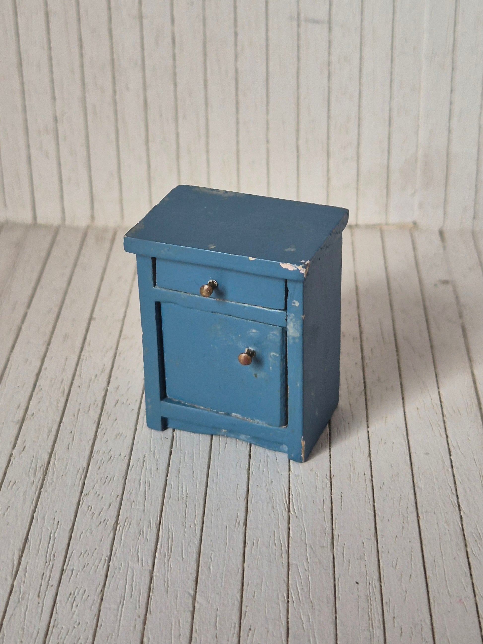 Lundby natbord i den blå landlige stil. Den har skuffe og skabslåge. Den er af træ og har en del patina og brugsspor.