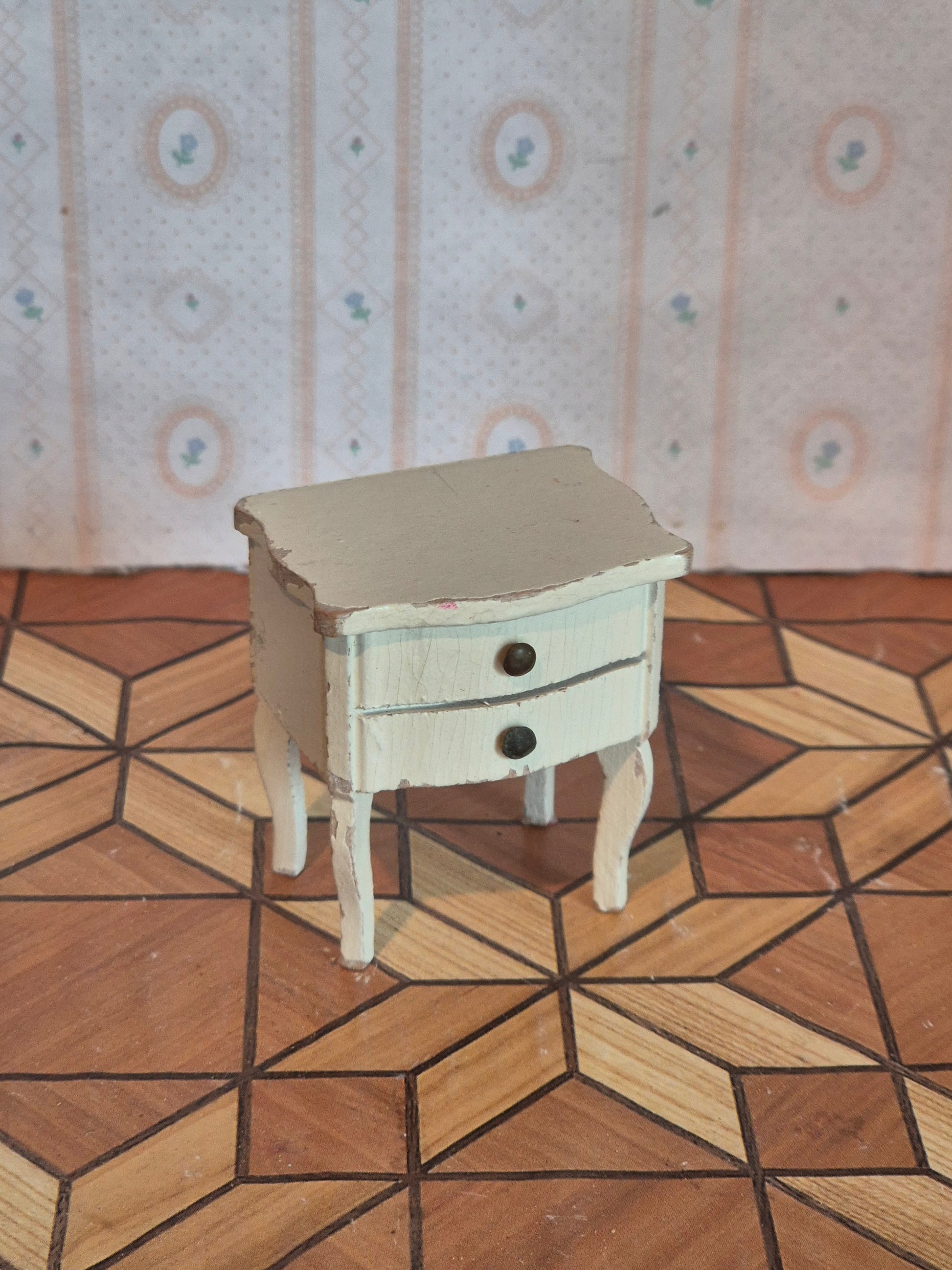 Pænt Lundby natbord af træ i hvid rokoko stil fra 1950erne.