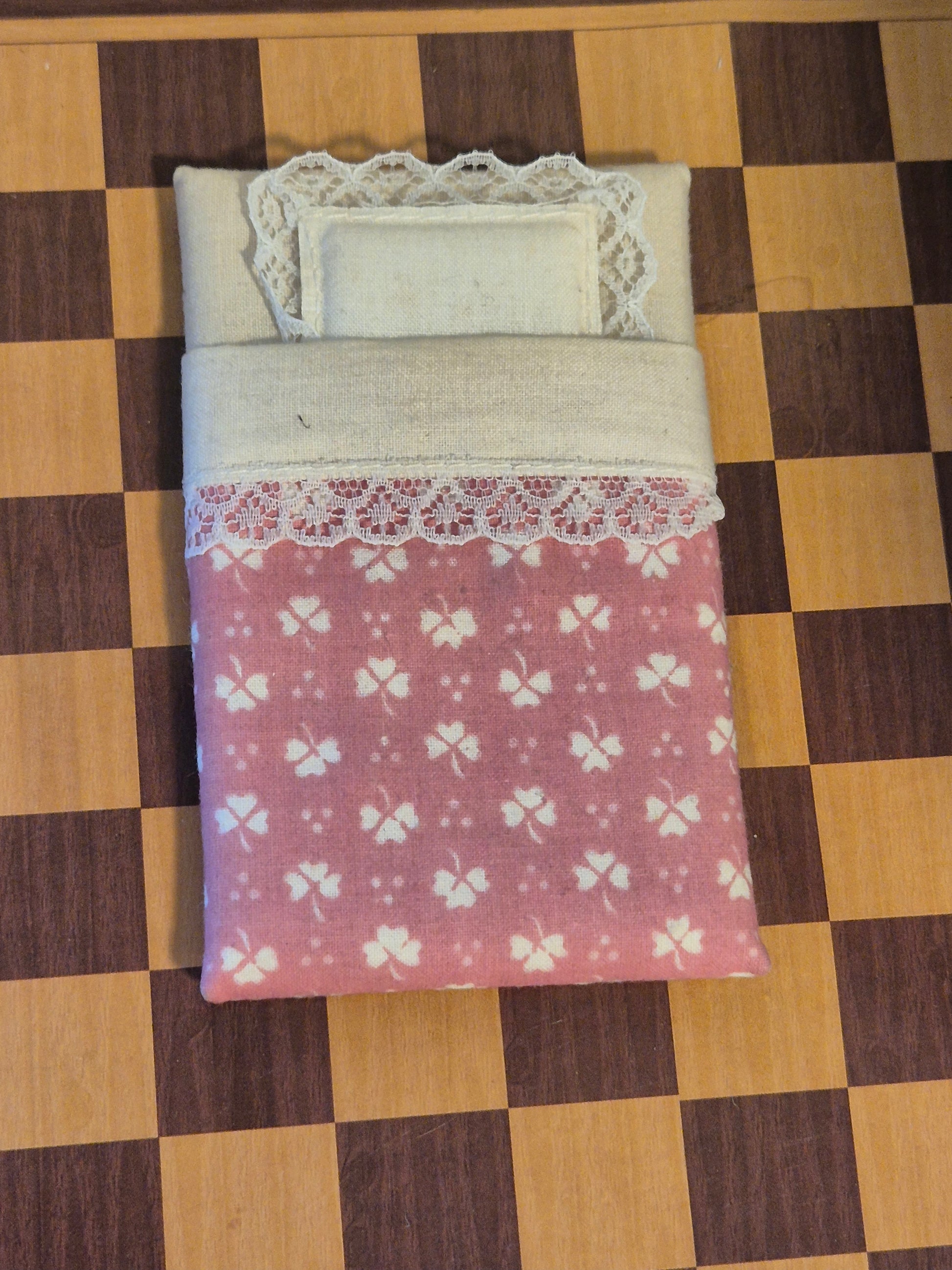 Pænt Lundby sengesæt, madras med dyne og hovedpude til bred dukkehus seng (omtalt som prinsesse-seng).