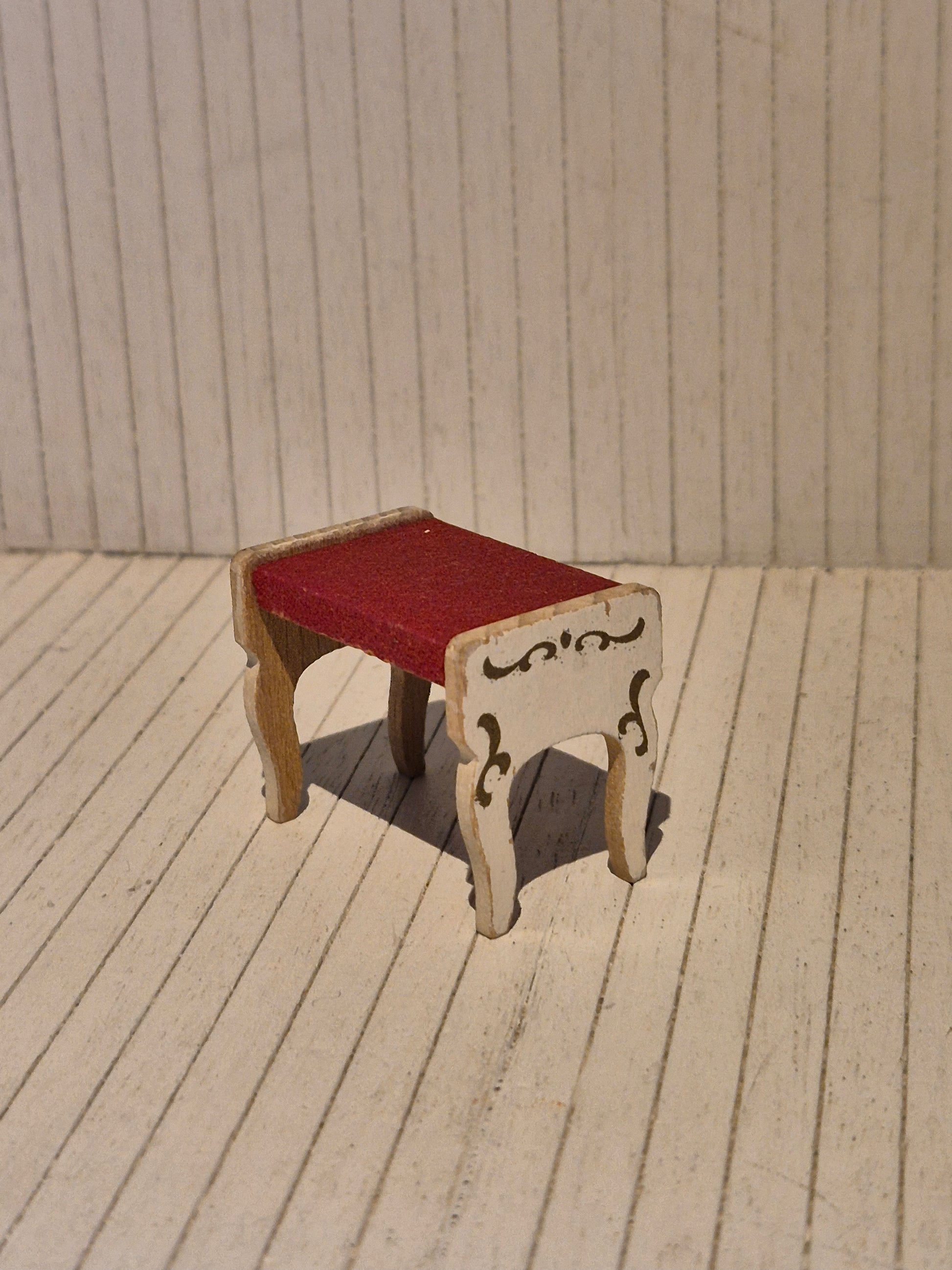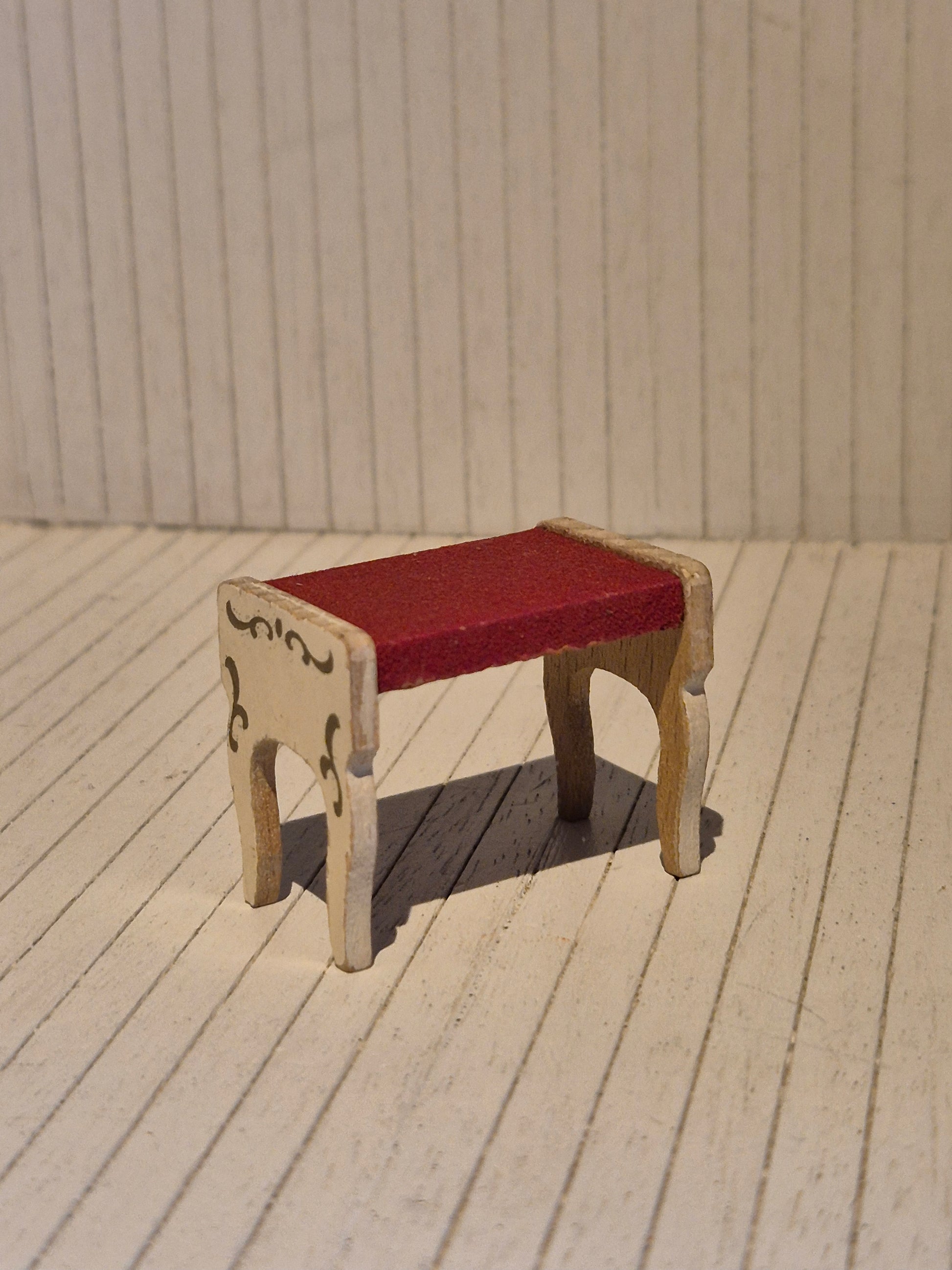Pæn og fin lille Lundby rokoko skammel med rødt sæde, fra 1960erne. Der er noget royal stil over den.