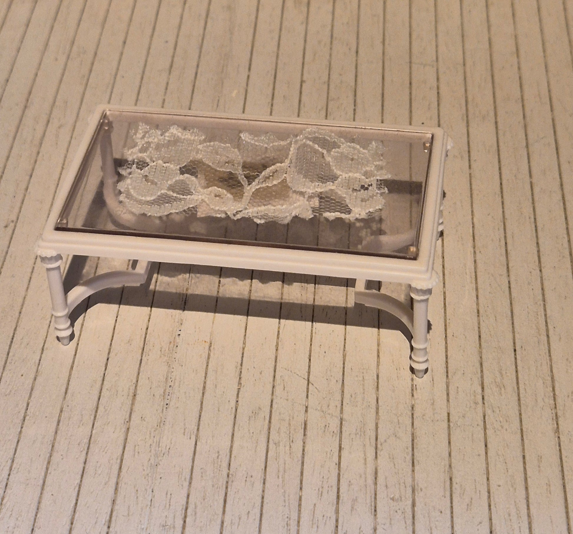 Lundby sofabord med blondedug. Det er i rigtig pæn stand og intakt, original stand. Det er af plast.