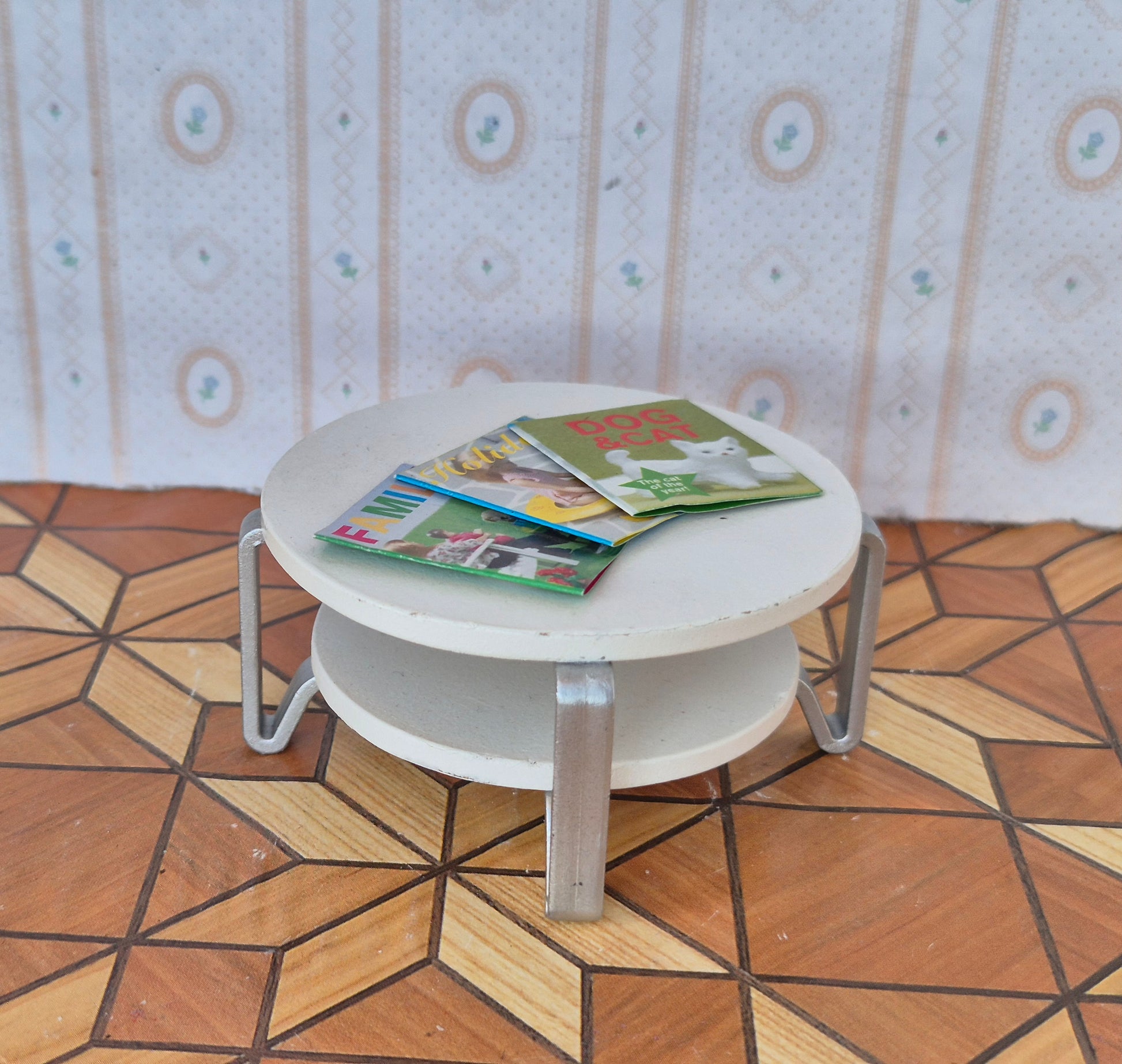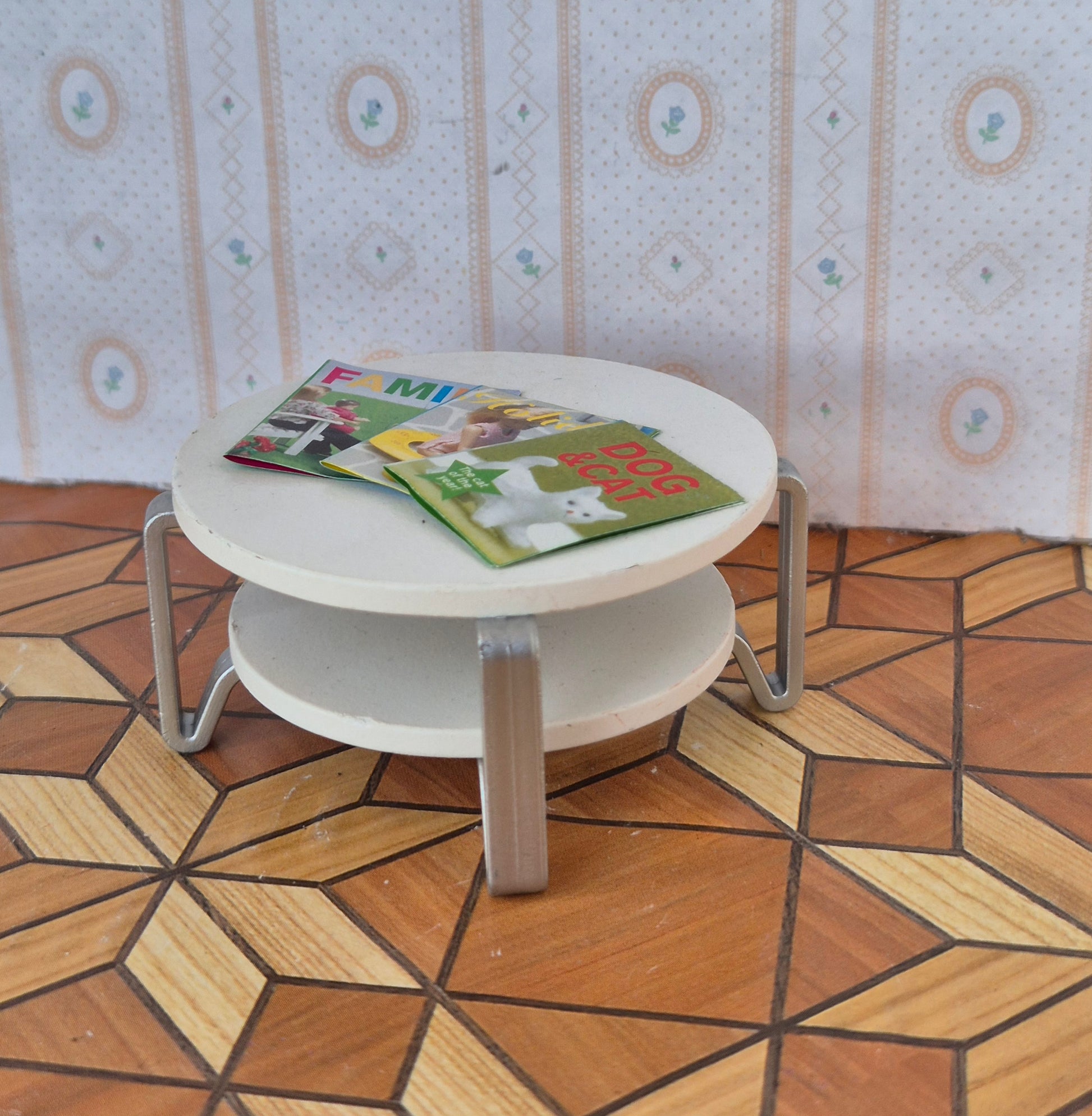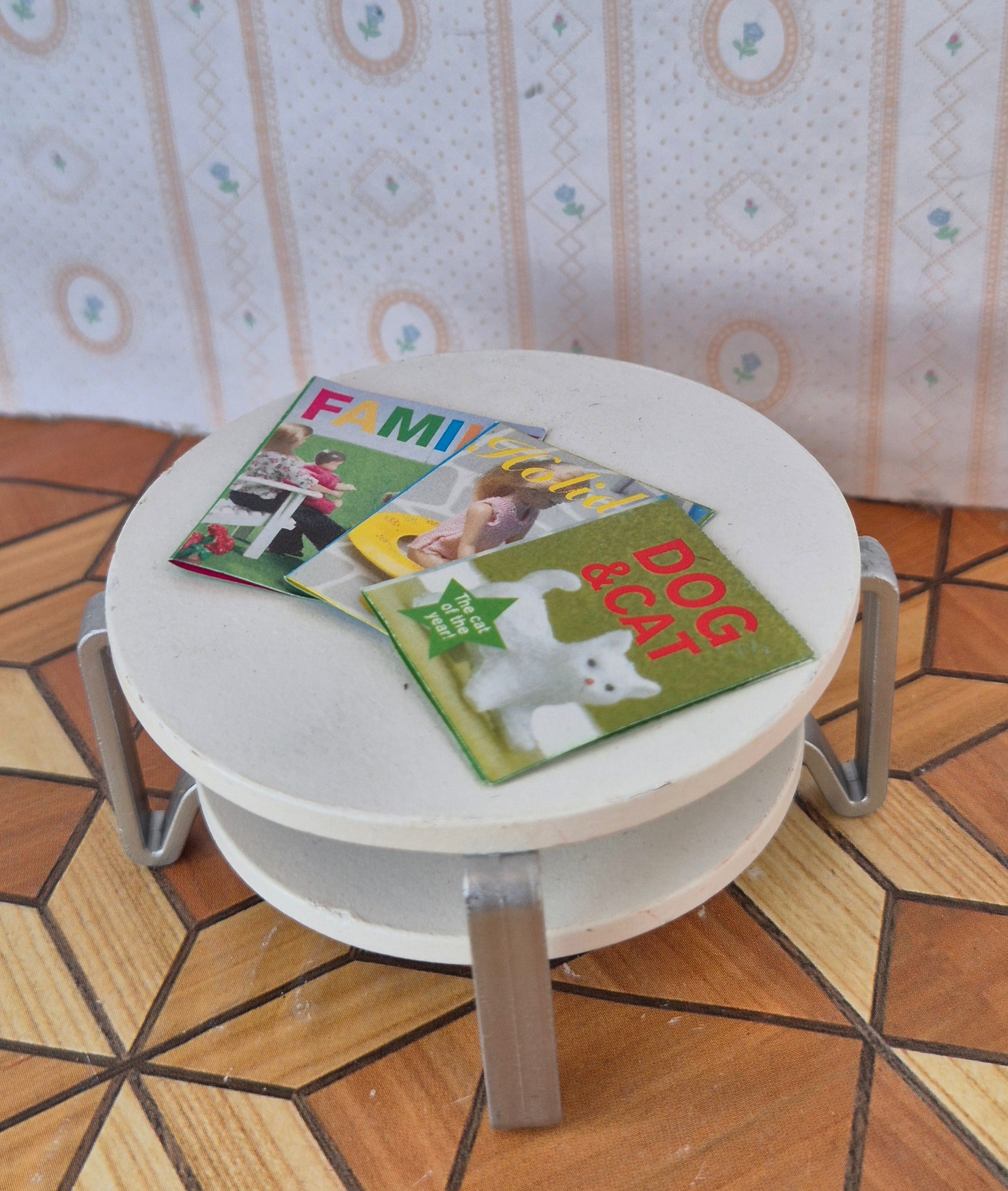 Pænt og fint Lundby sofabord med tidsskrifter og magaziner, der sidder fast på bordpladen.