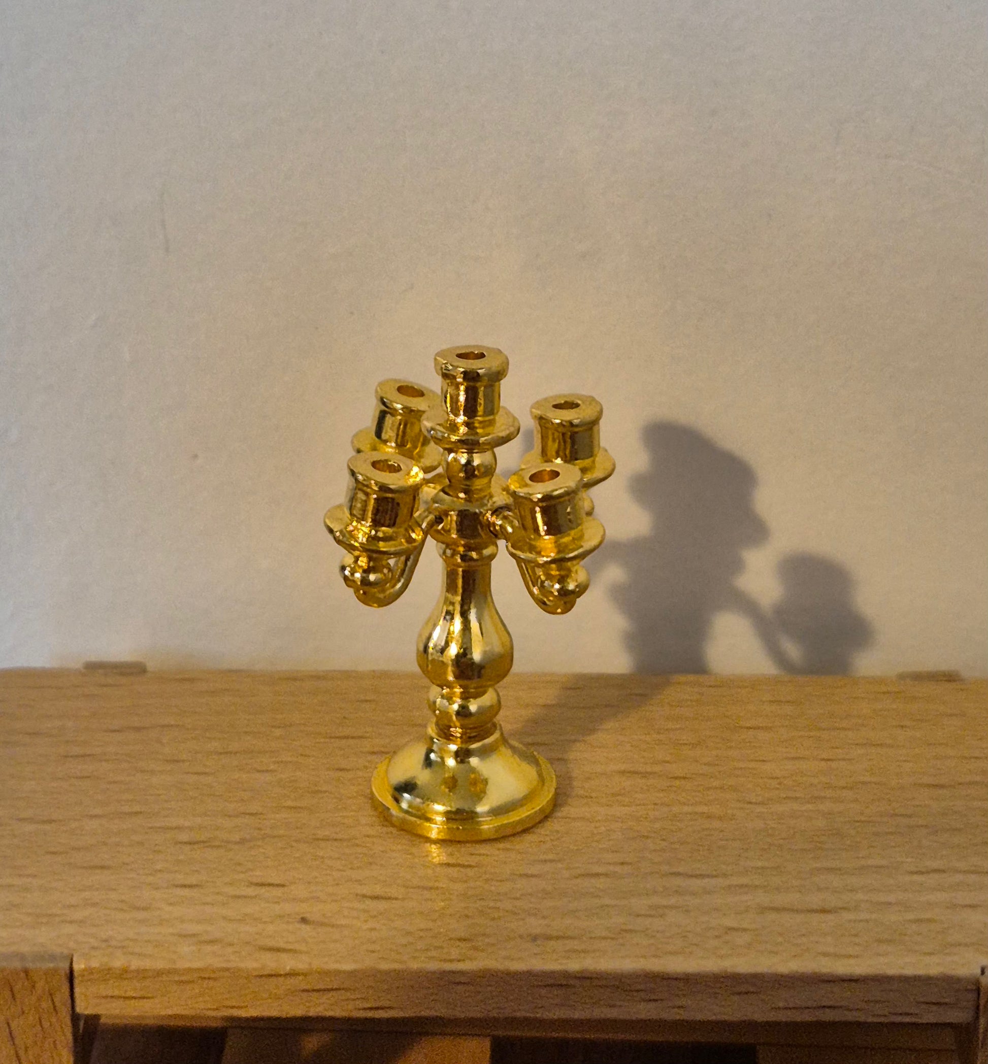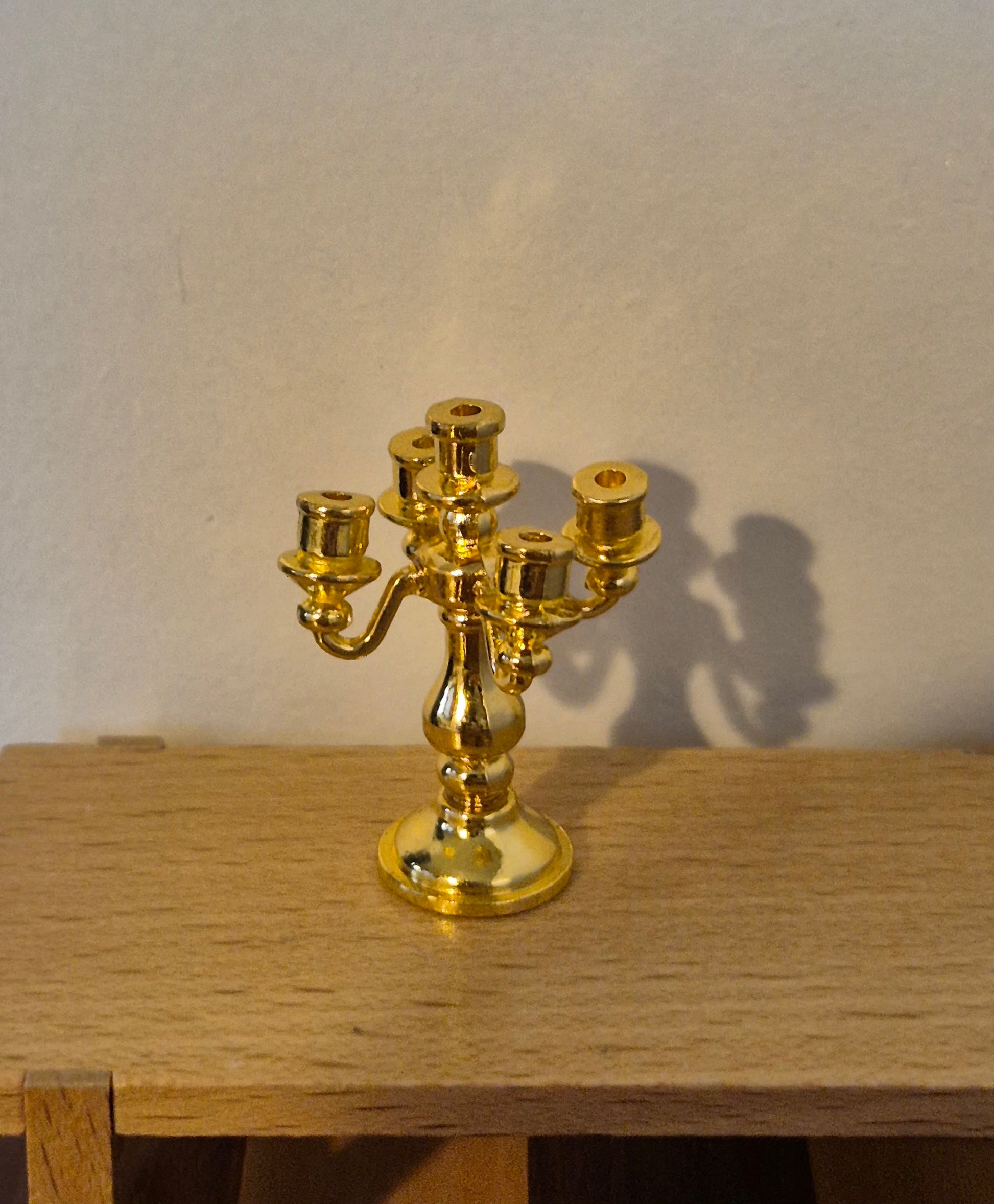 Pæn gylden fem-armet lysestage, hvor armene er lidt skæve.