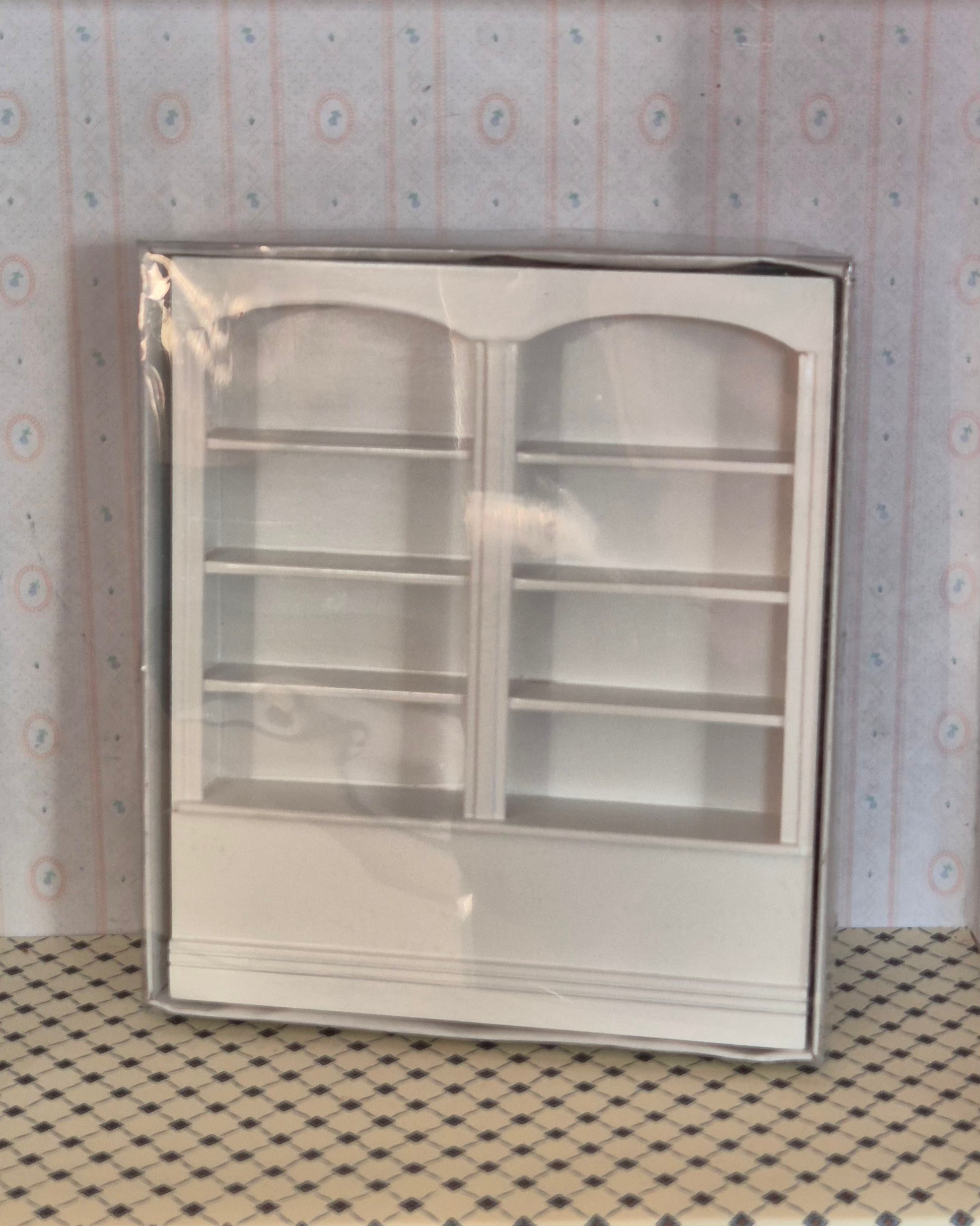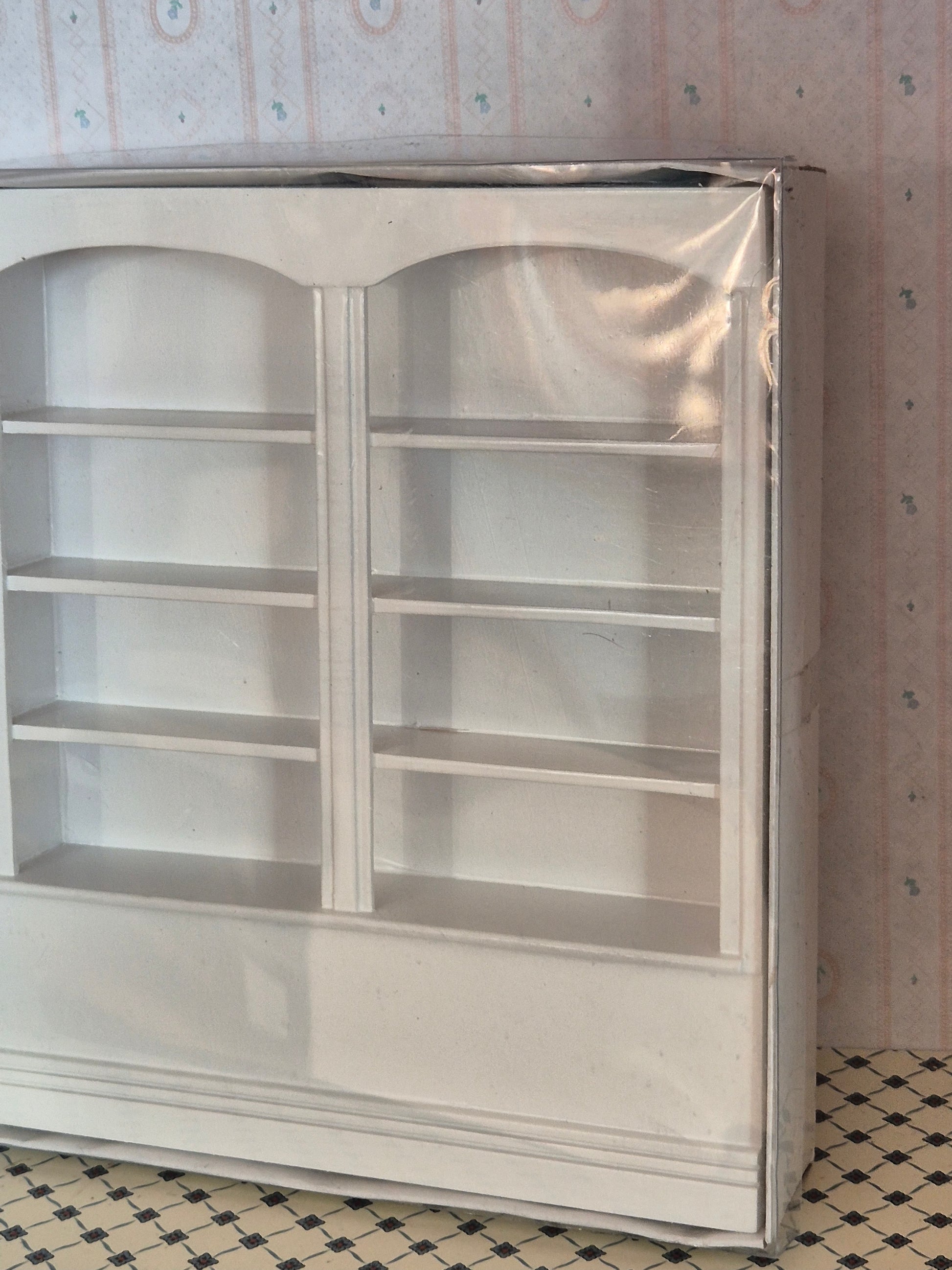Pæn ny 1:12 dobbelt reol i hvid træ. Den er i emballage, som er lidt bulet og bøjet.