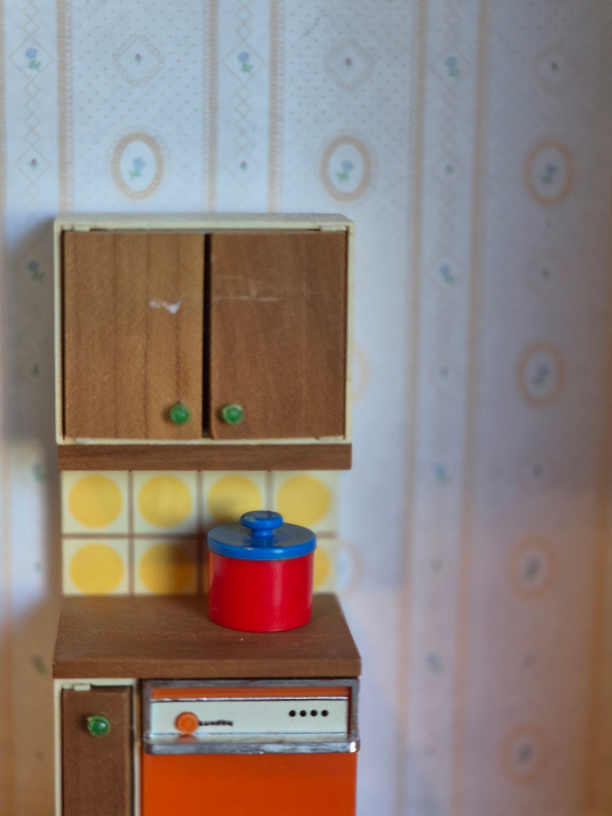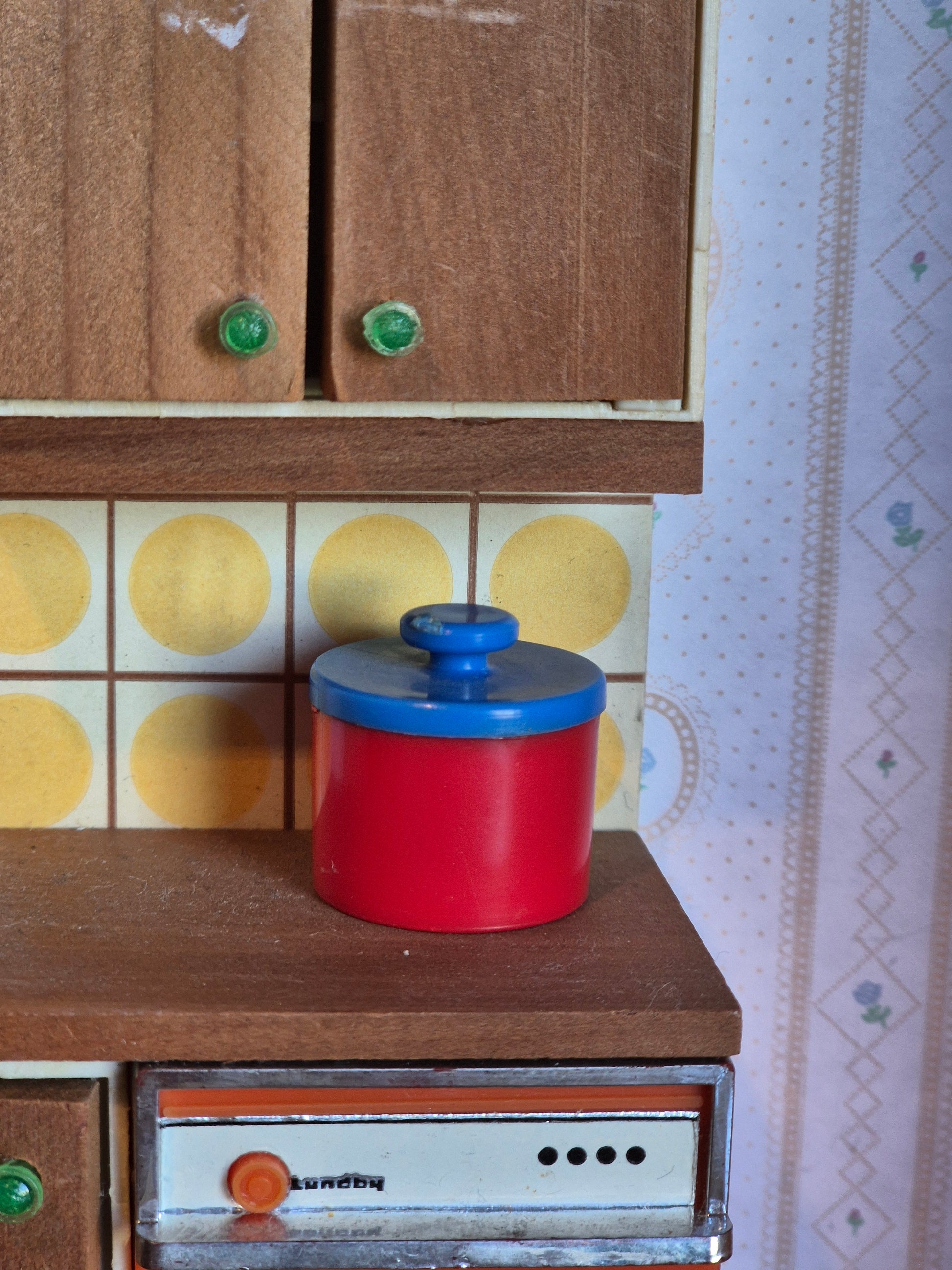 Pæn retro bøtte i rød med blåt låg. Opbevaringbøtte i plast. Passer til 1:16 - 1:12. Køkkenudstyr.