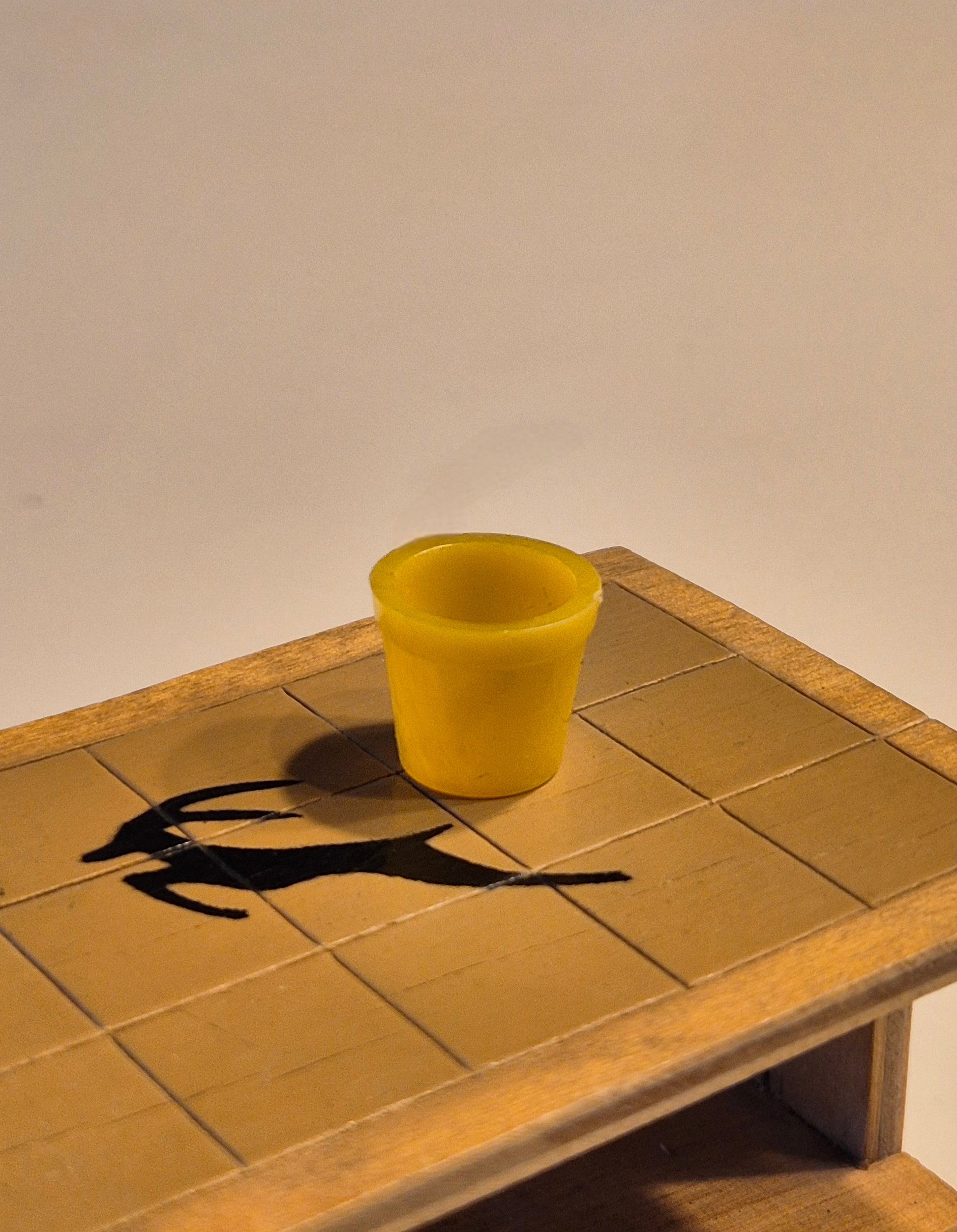 Fin gul vintage potteskjuler eller plast krukke. Den er af plast. Pæn. Ca 1,2 cm høj.