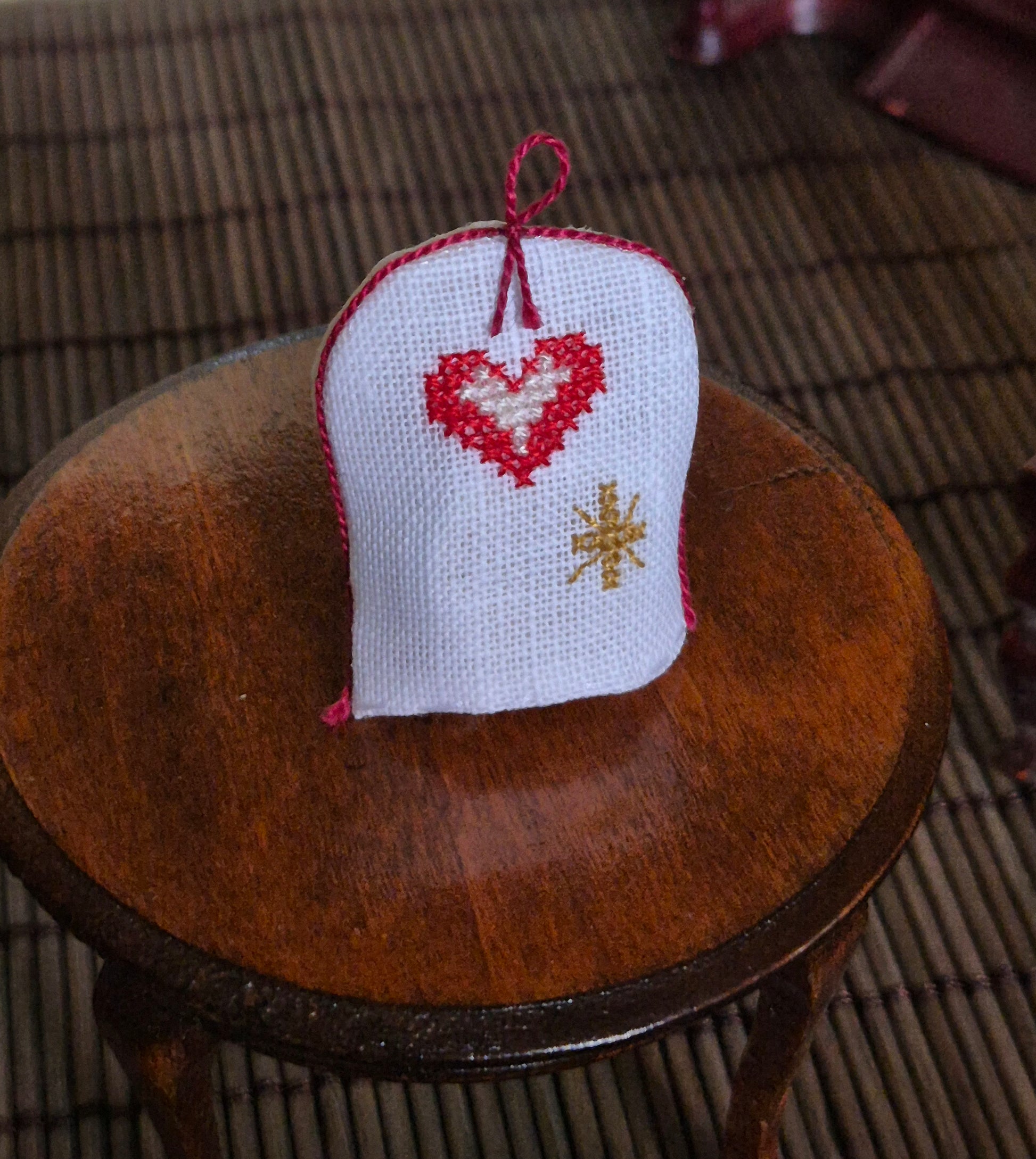 Fin tehætte med broderet mønster, hjerte og stjerne. Den er lavet af privat kunstner / designer.