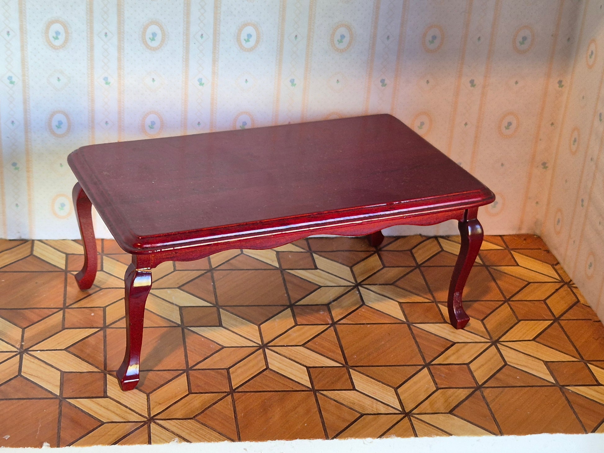 Fint 1:12 spisebord I rødbrun maghoni-look. Det ene ben er limet