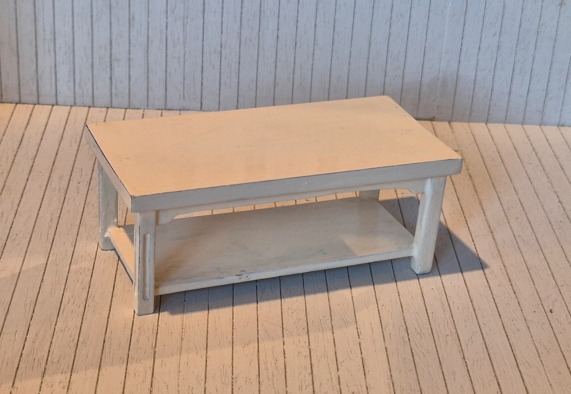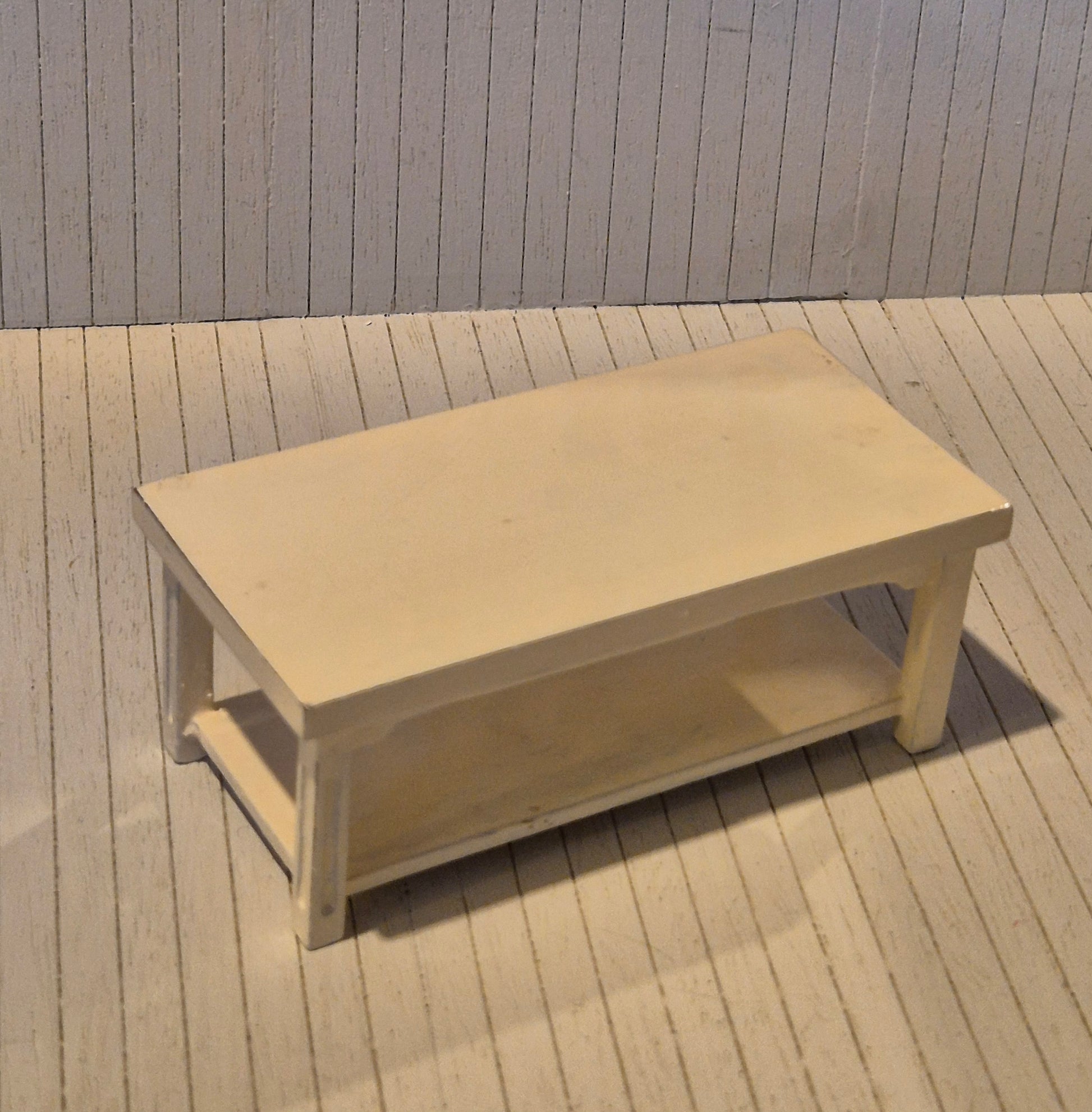 Pænt 1:12 sofabord i råhvid. Det er rektangulært med en hylde.