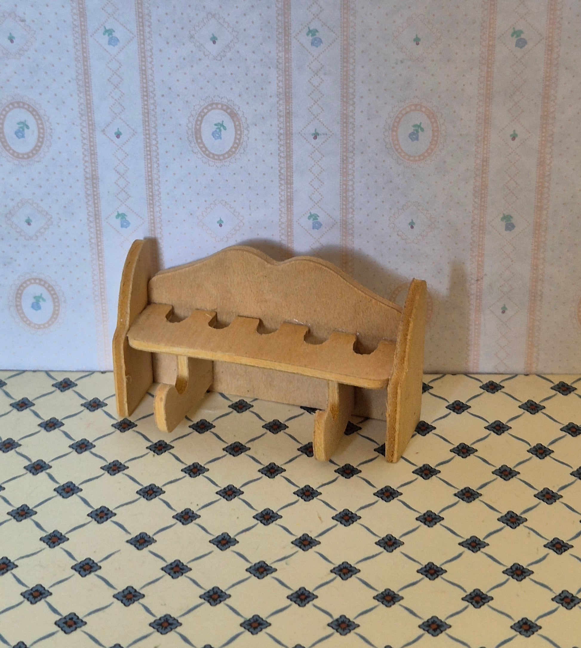 Pæn hylde af træ med plads til redskaber. Den er 1:12.