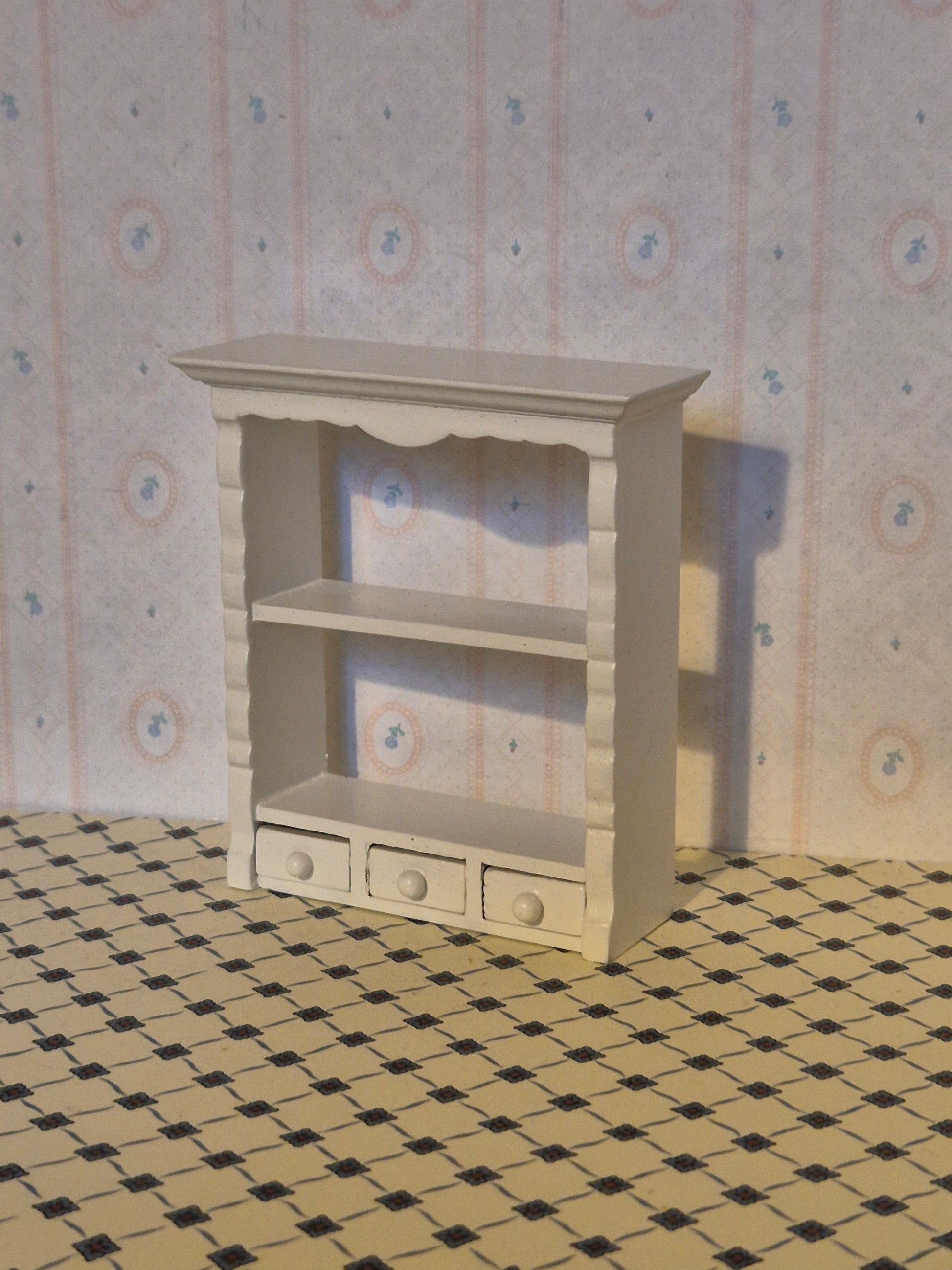 Pæn hvid 1:12 hylde med 3 små skuffer. Udmærket stand.