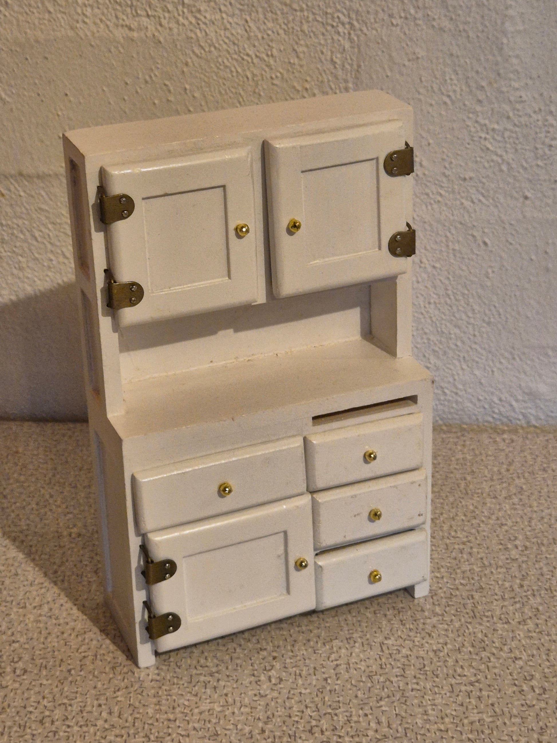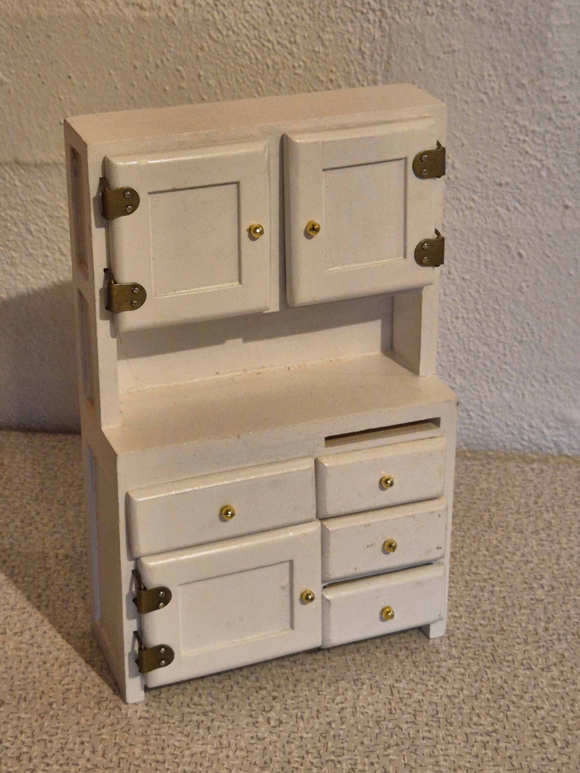 1:12 dukkehus køkken skab i hvidt træ med låger, synlige metal hængsler og bordplade-del.