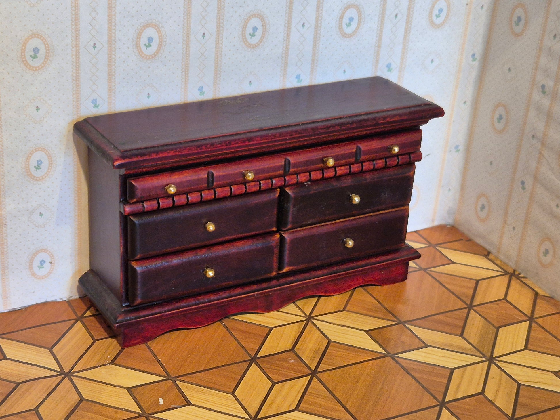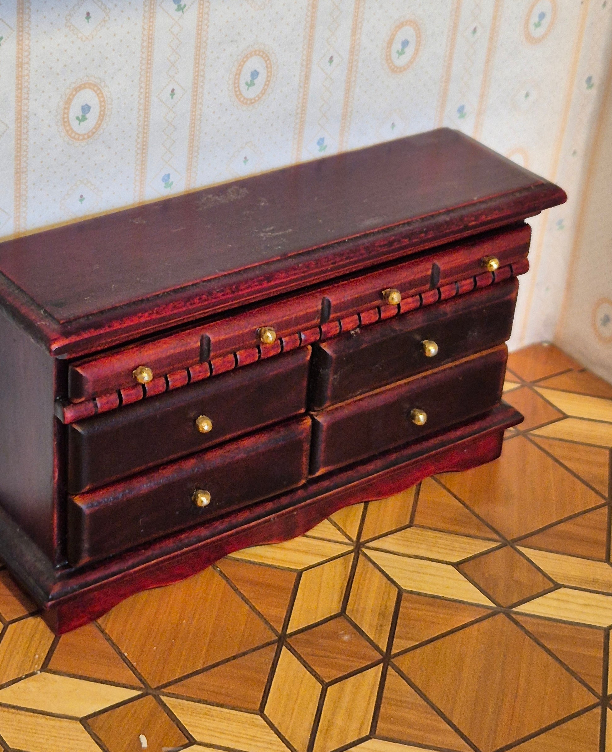 Mørkebrun med rødlig undertone kommode af træ i str 1:12. Pæn og fin. Få brugsspor eller patina. Den kan også klassificeres som skænk.