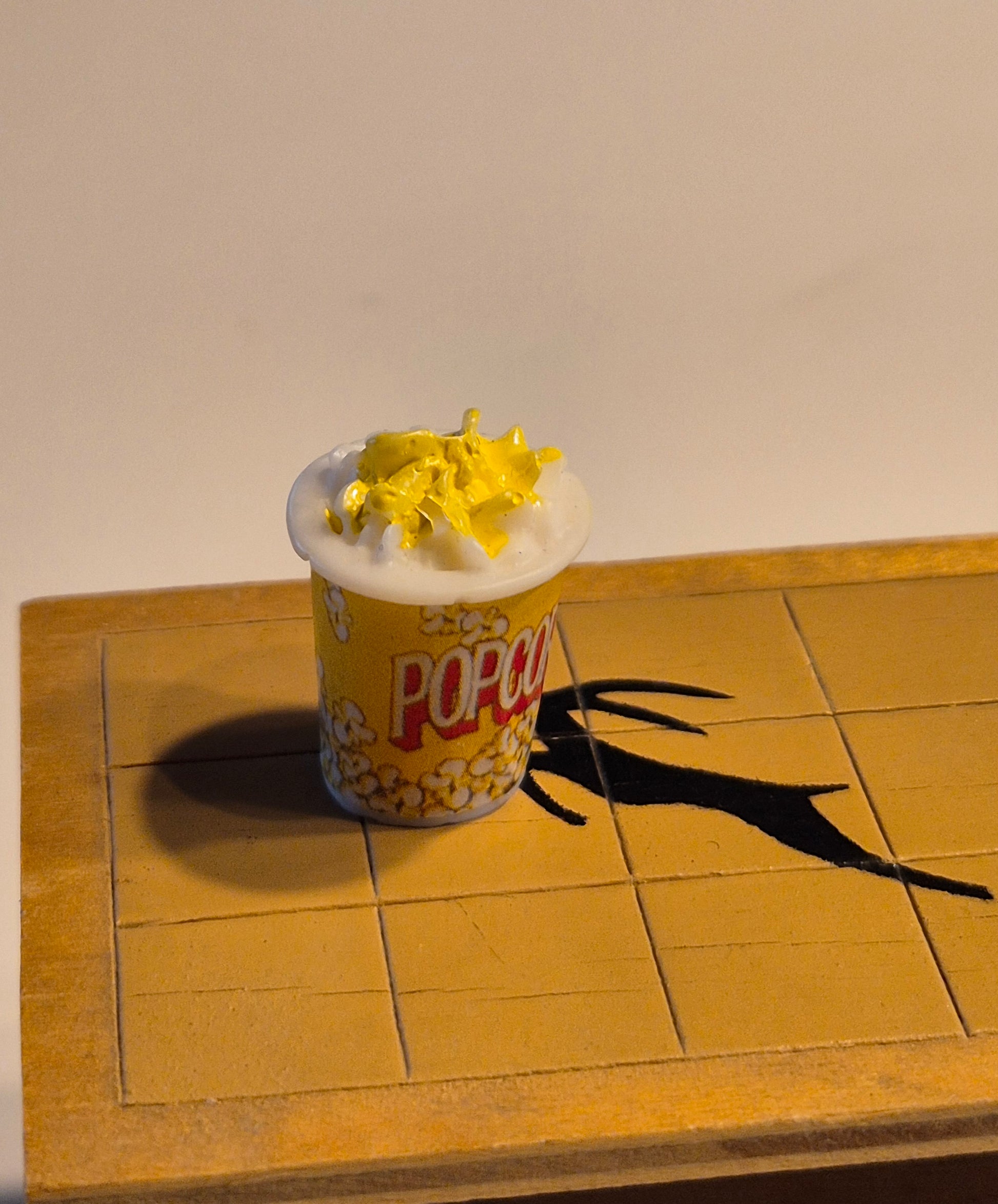 Pæn fuldstøbt popcorn bøtte i gul 1:12. Den er af plast.
