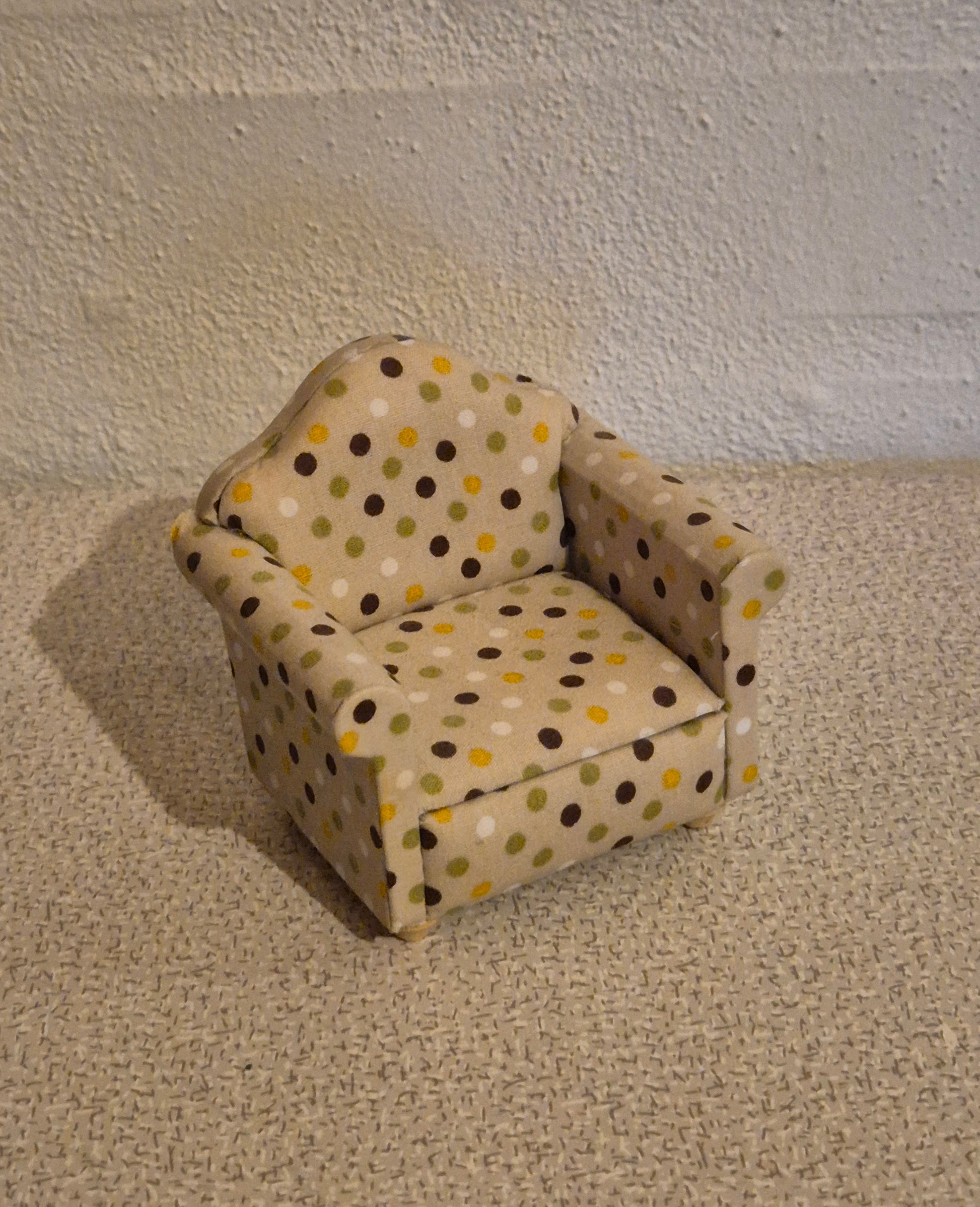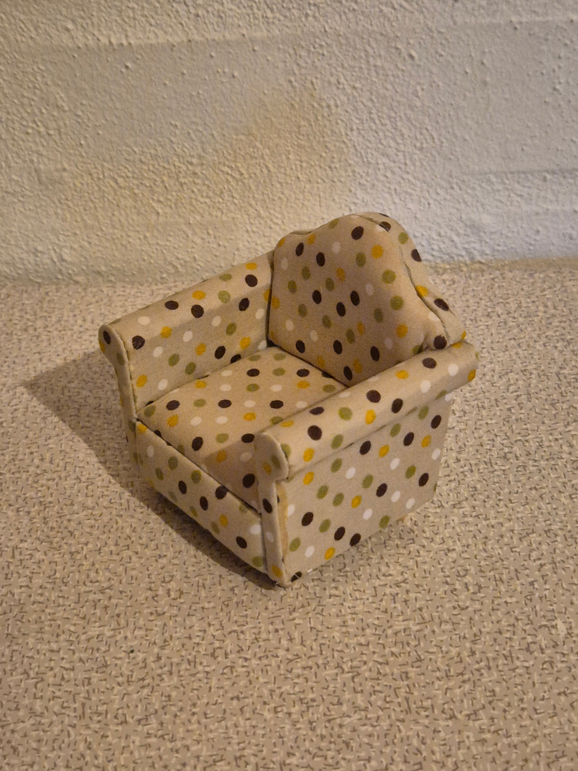 1:12 dukkehusmøbel, pæn lænestol I prikket lyst stof, betræk. Den er brugt med enkelte brugsspor, ellers i pæn stand.