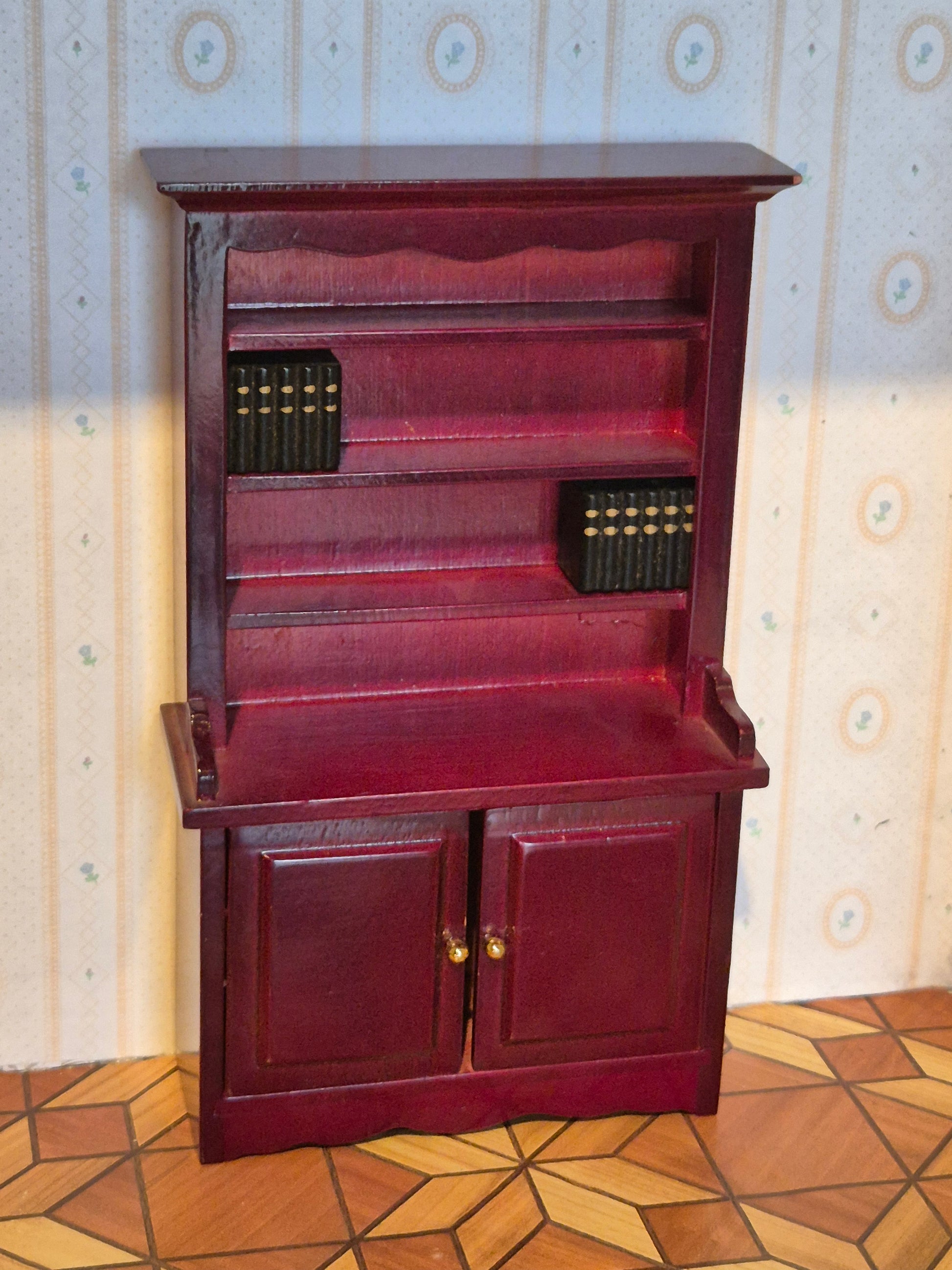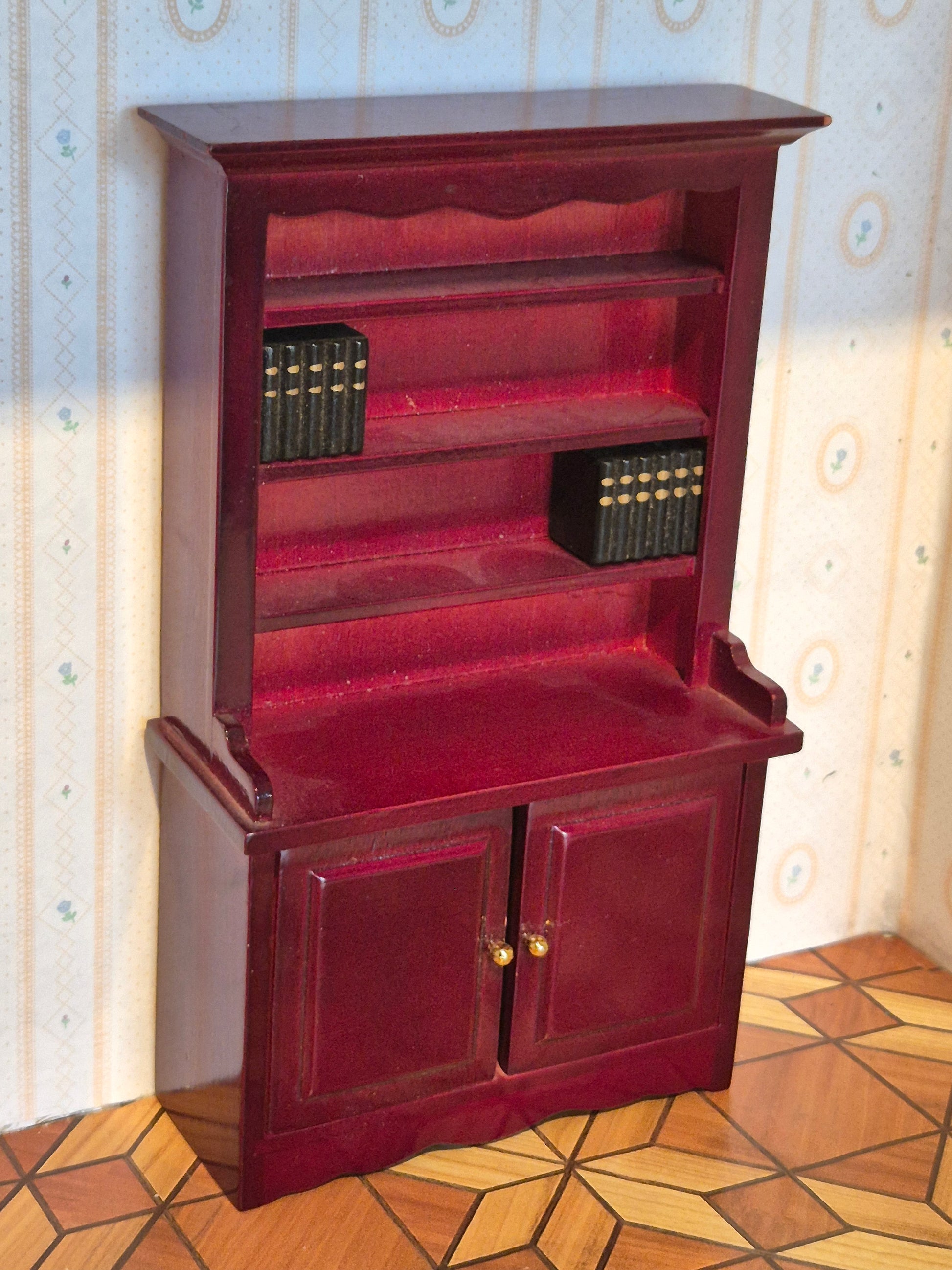 1:12 reol i Rødbrun nuance i maghoni-look med kunstige bog-blokke. Pæn stand.
