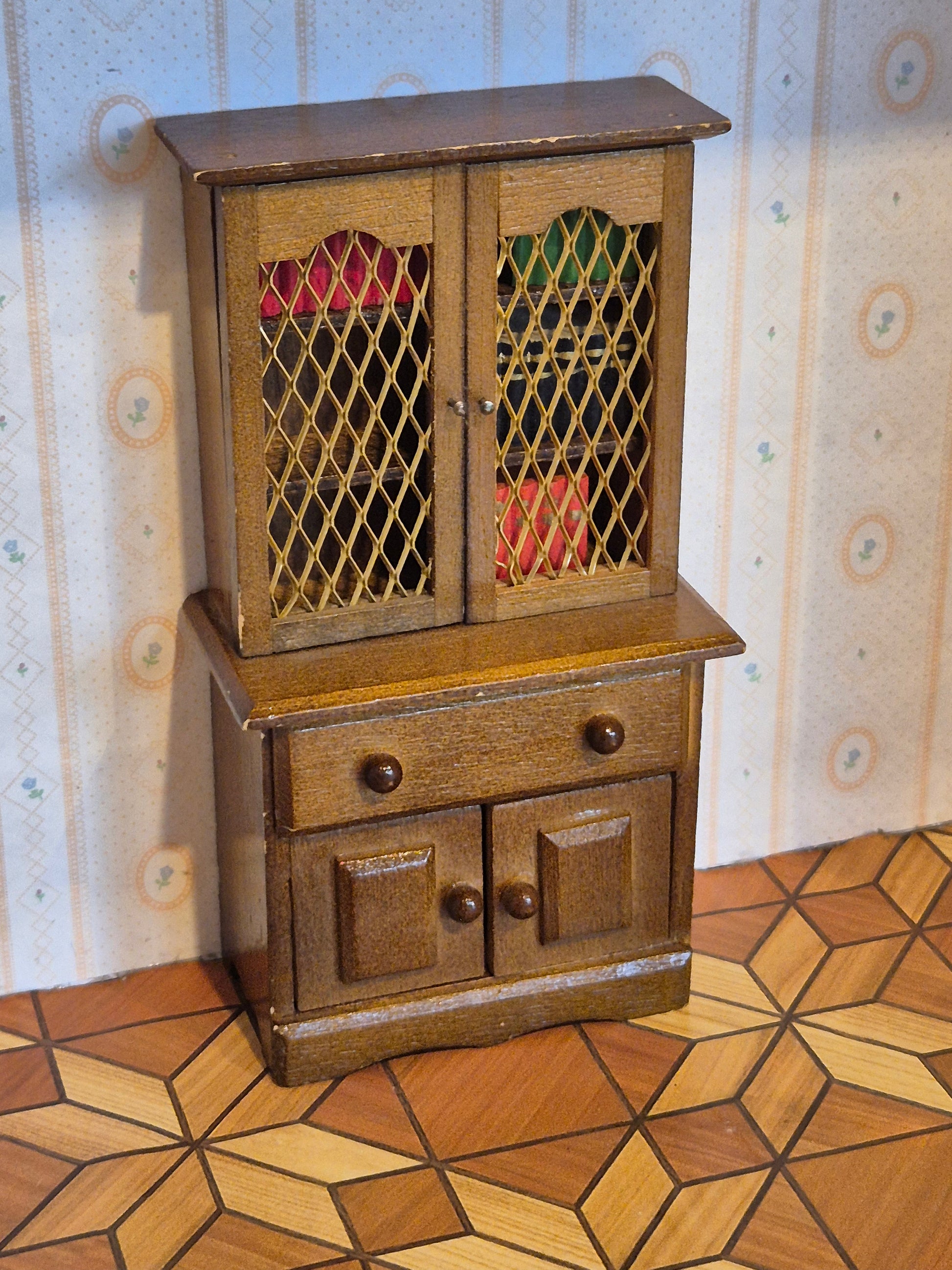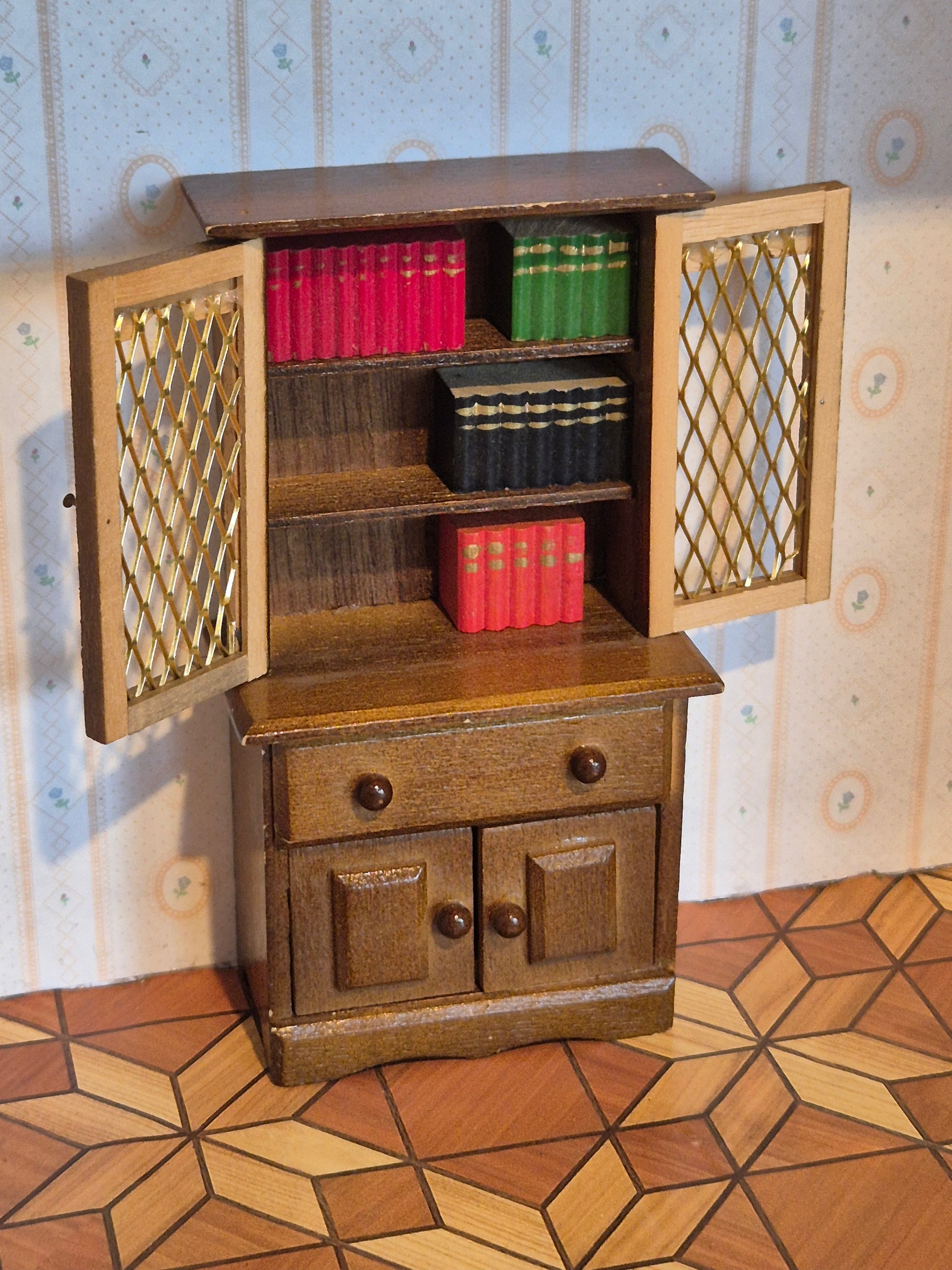 Bogreol eller skab til dukkehuset, kontor eller stue. Pænt med fine låger og bøger-blokke i pæne farver.