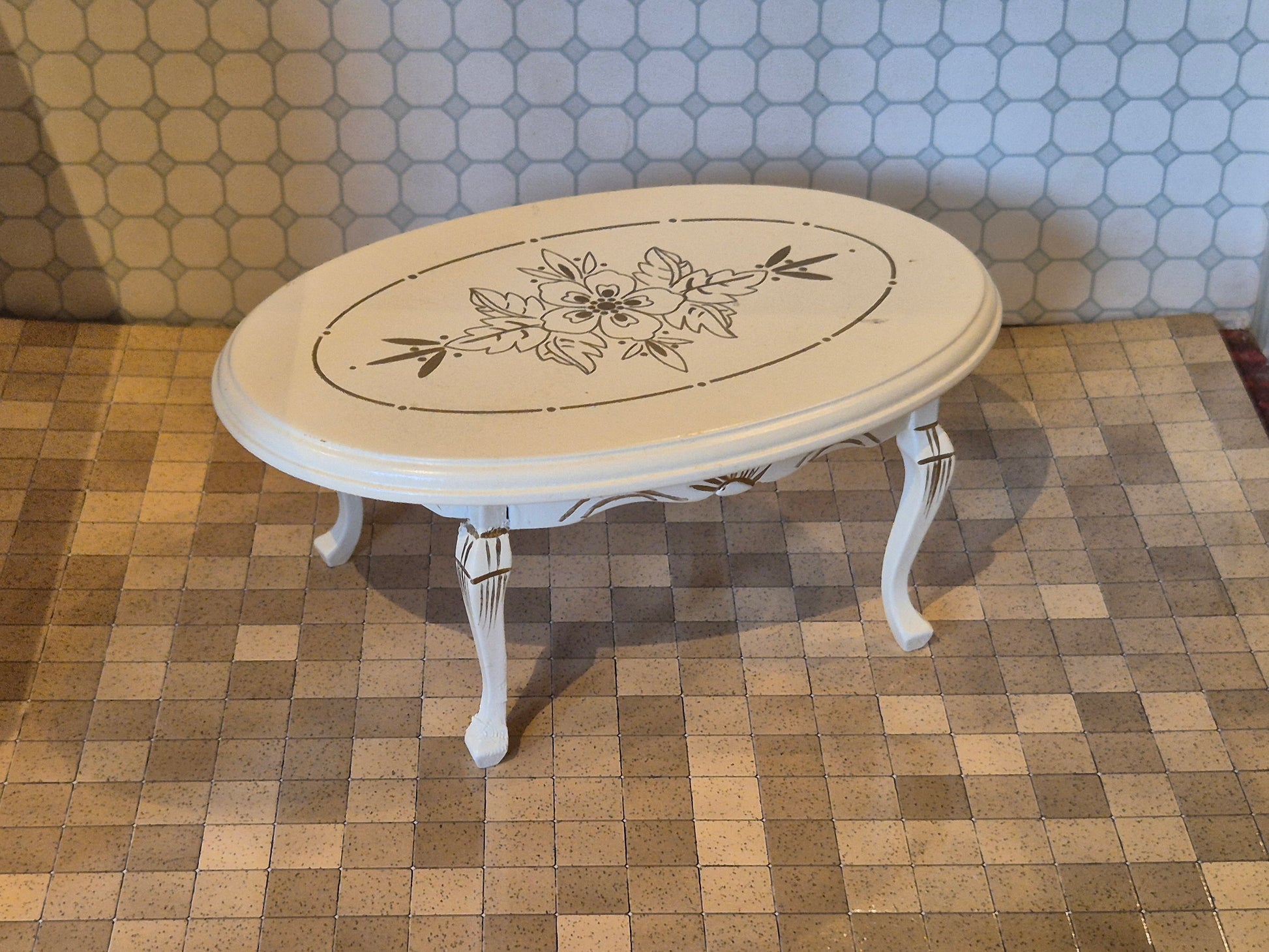 Nice large oval dining table for the dolls house in size 1:12. It is made of white wood with a gold pattern motif on the table top. It is rococo style with fine carvings and details, for example on the table legs.