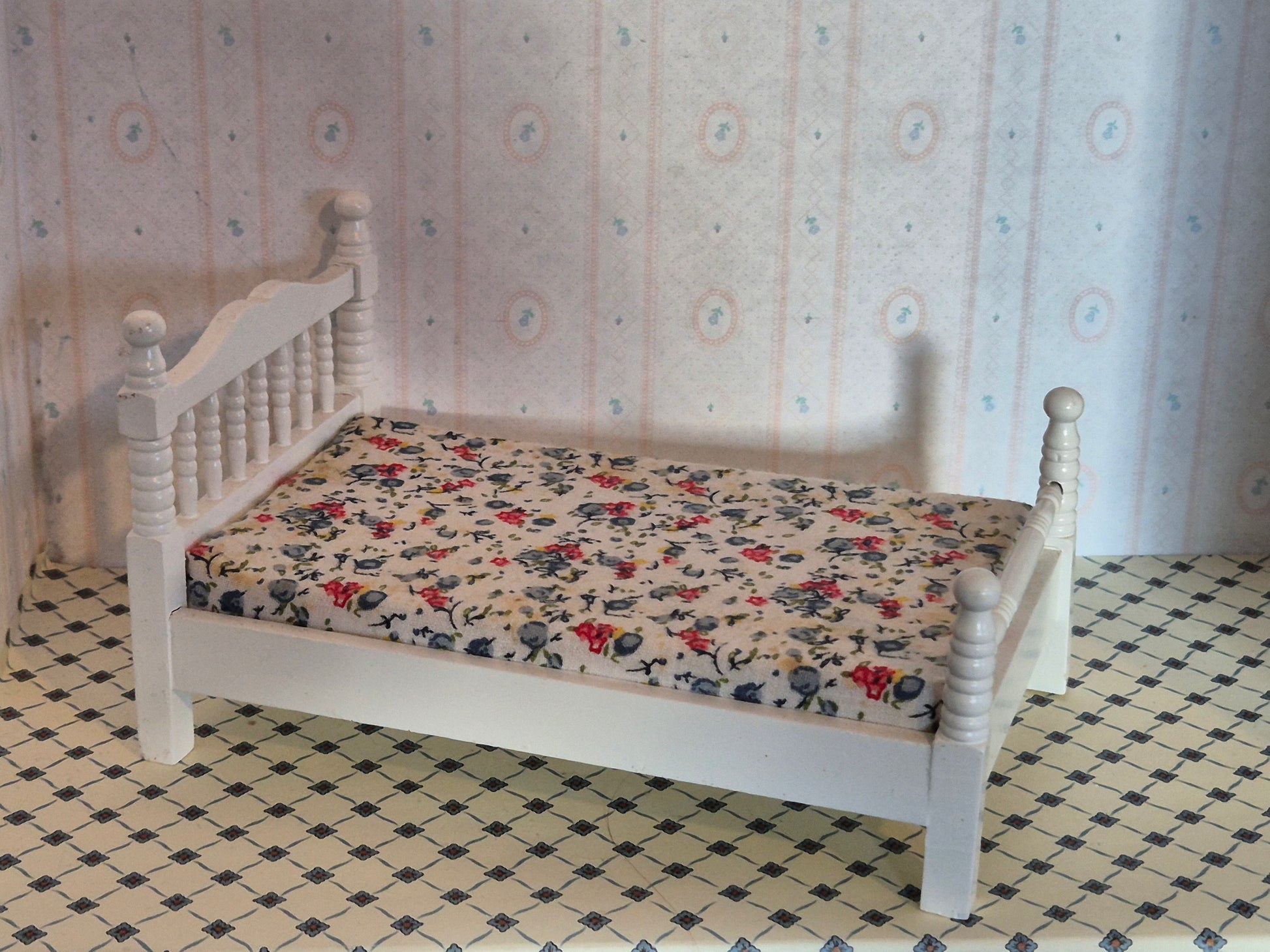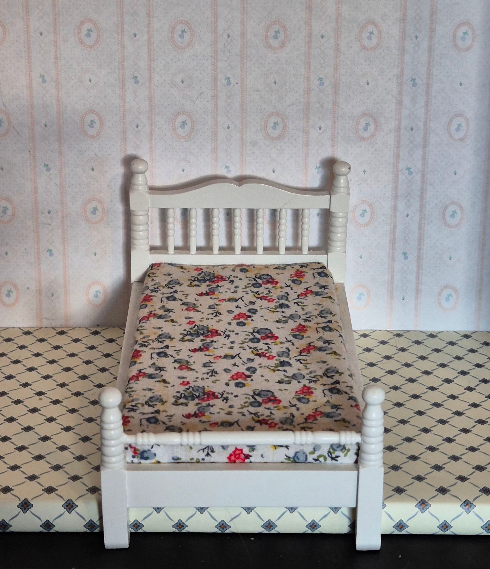 1:12 rummelig enkeltseng til dukkehuset. Det er hvid træ med blomster-mønstret madras. Udmærket stand.