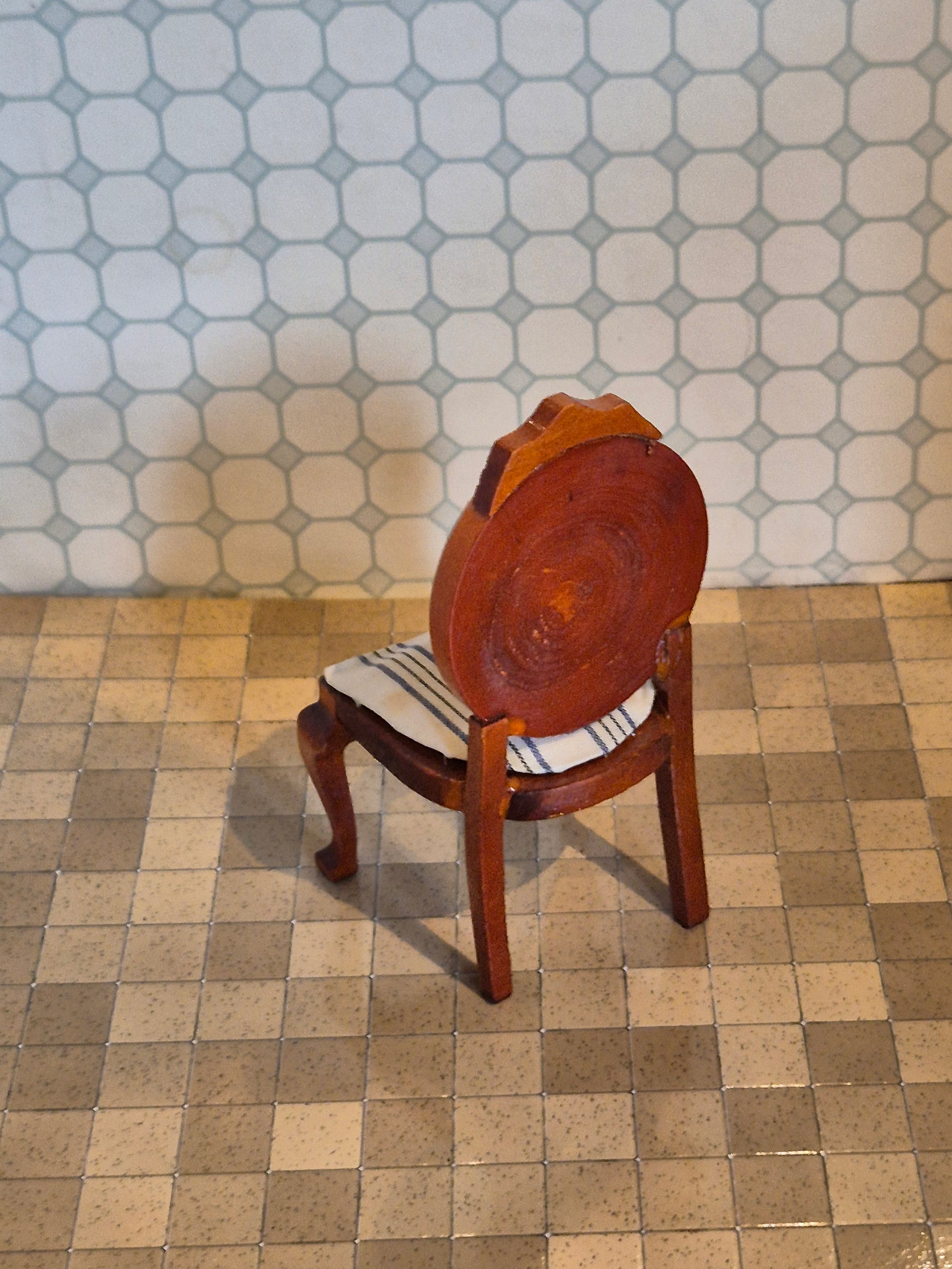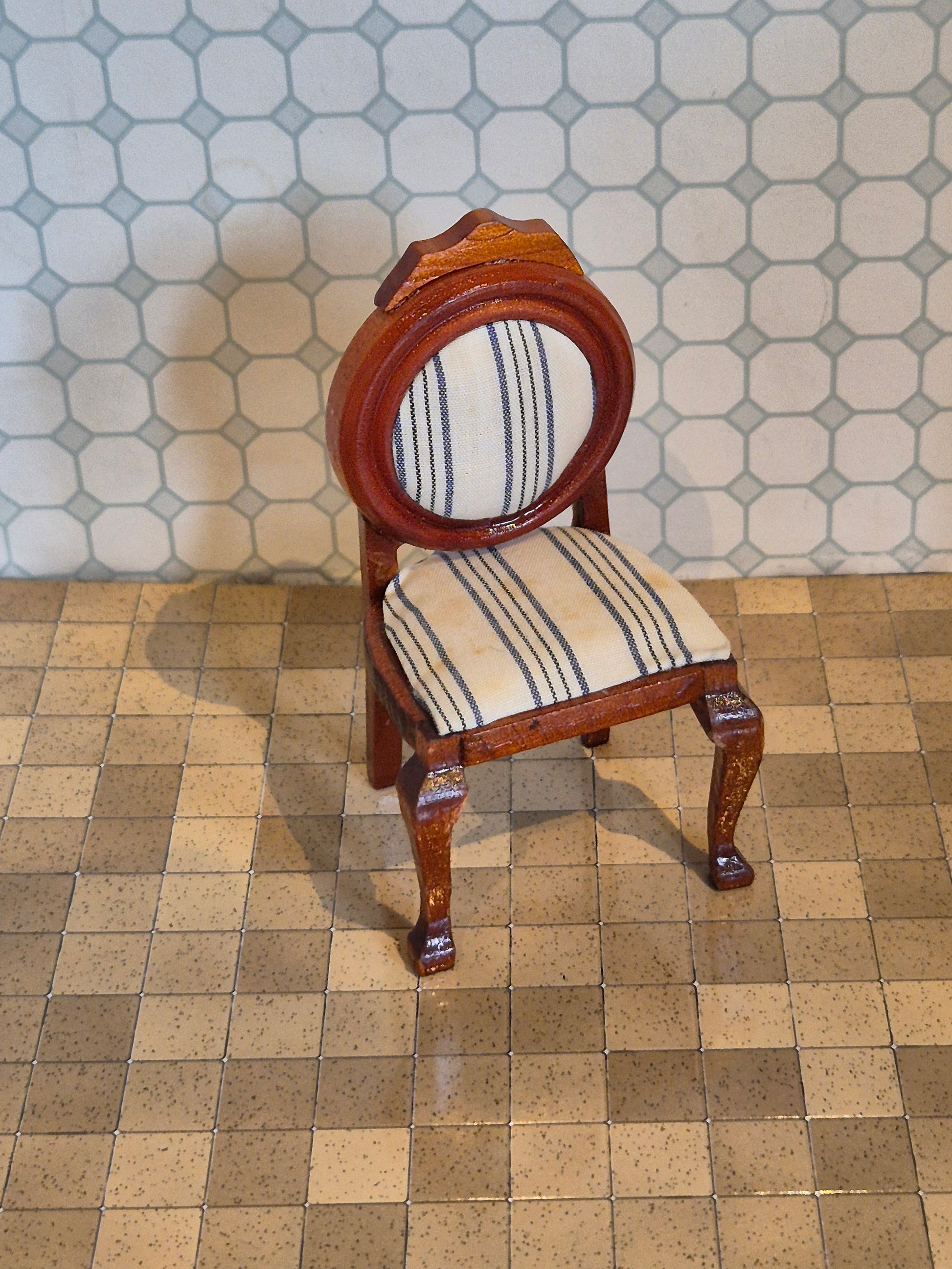 Beautiful chair for the dollhouse, size 1:12. It is made of wood, walnut, with a fine double-striped seat cover.
