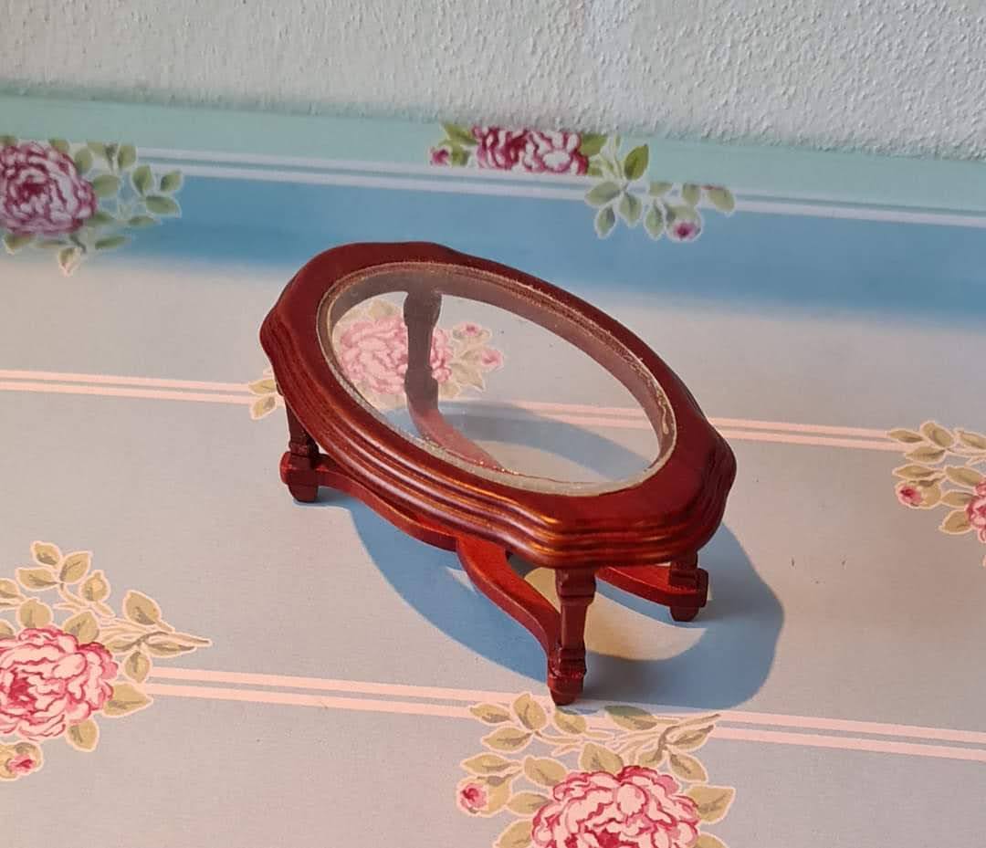 Nice coffee table, dollhouse furniture size 1:12. It is oval, made of wood in a mahogany look and with a "glass" table top.