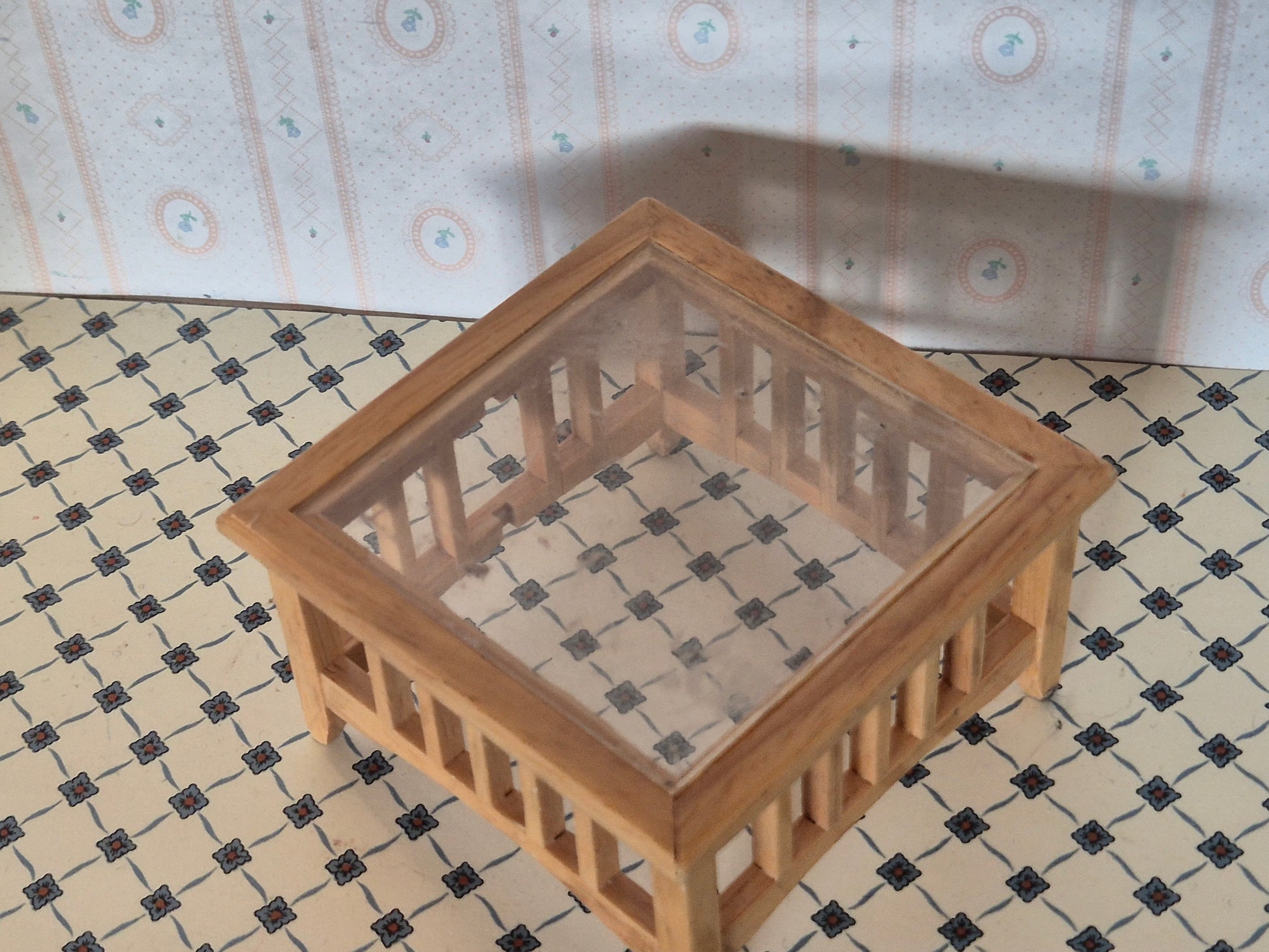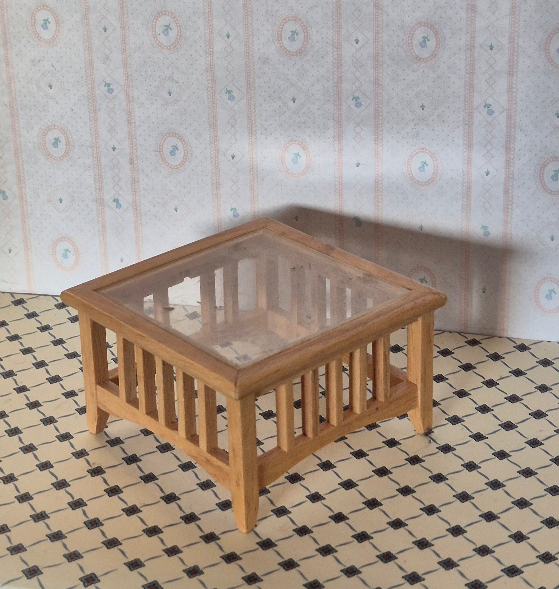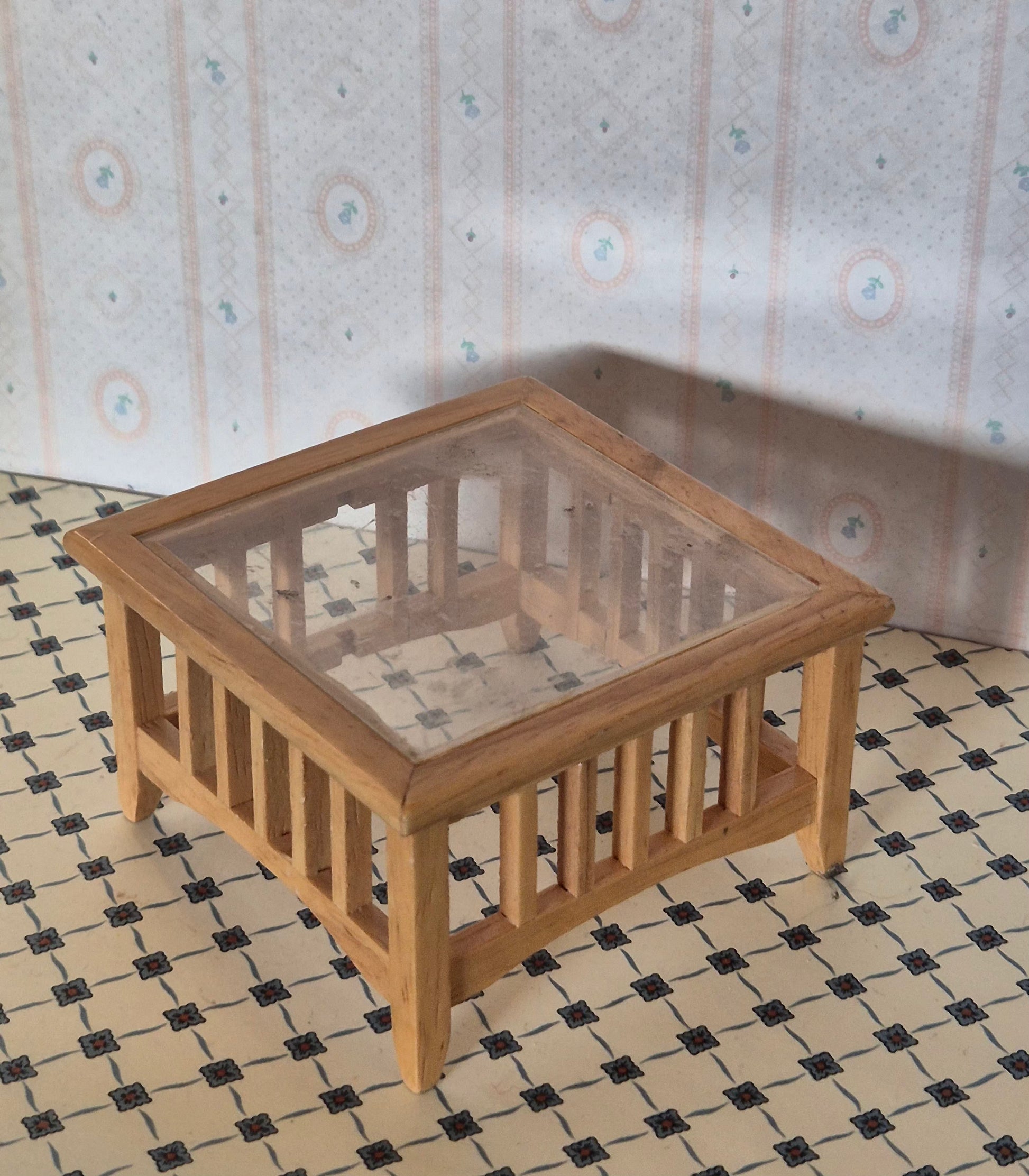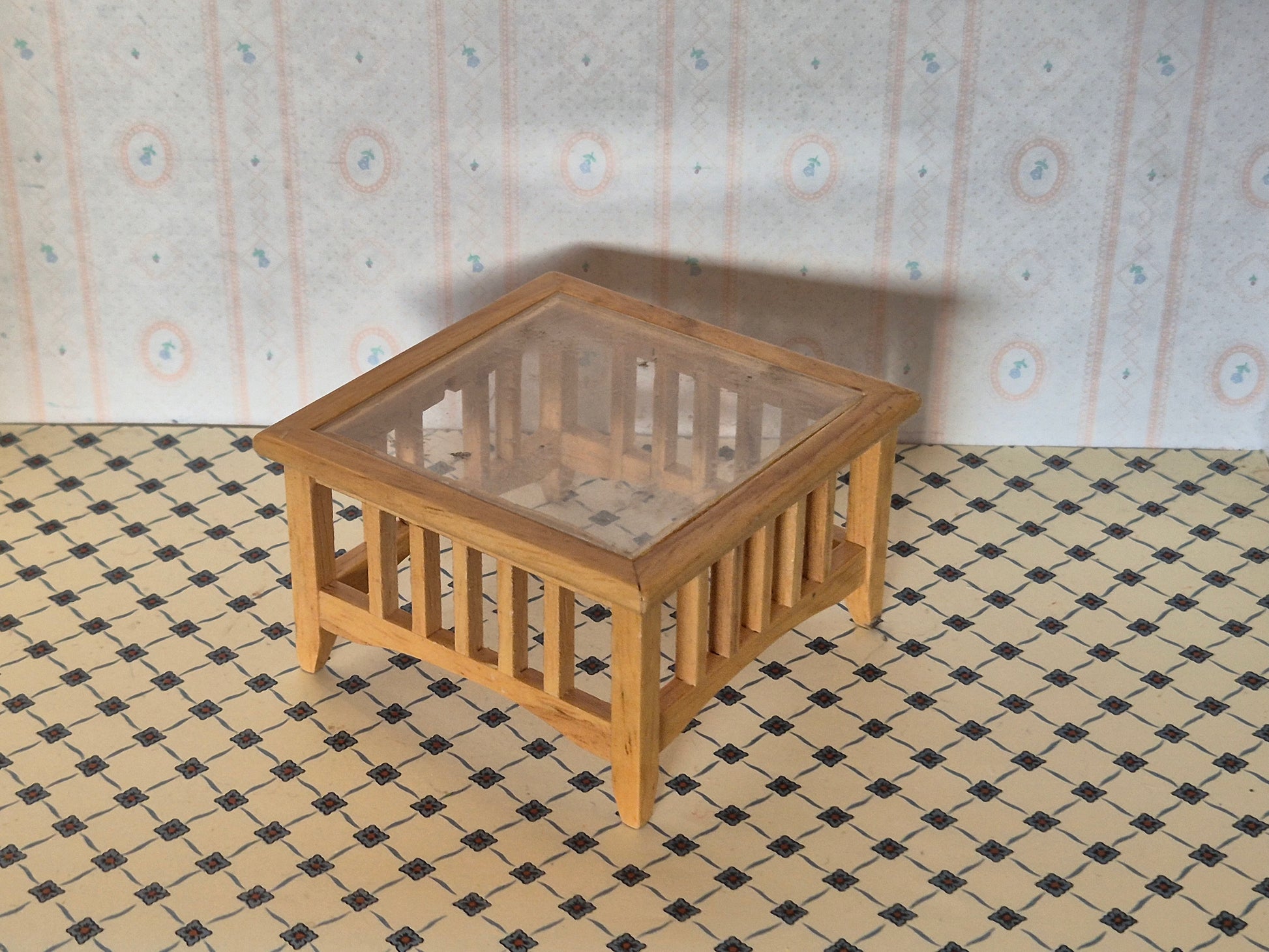 1:12 sofabord i lyst træ med plastik bordplade. Det er kvadratisk. Udmærket stand dog er der en del brugsspor og patina, skrammer og lignende.