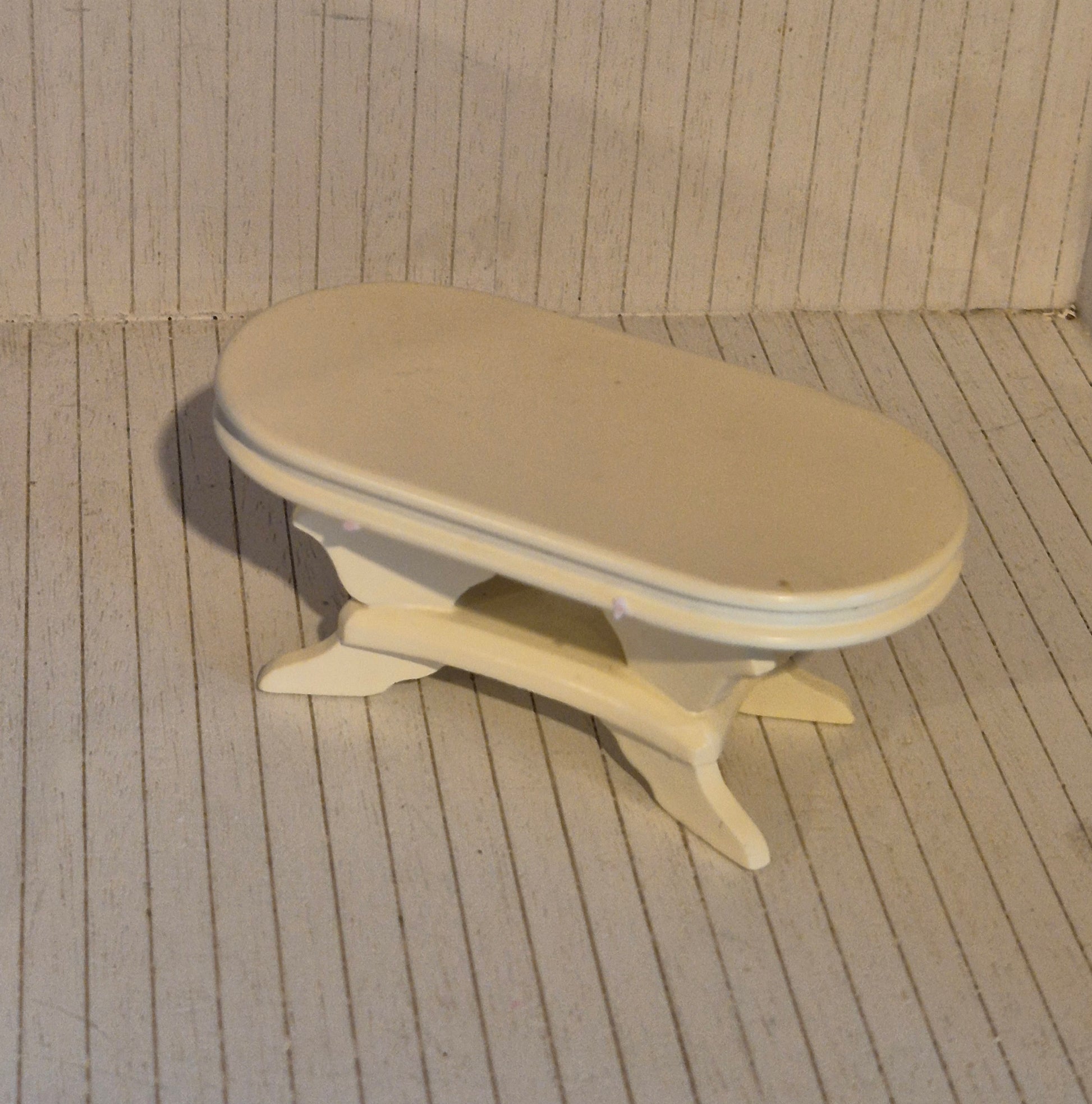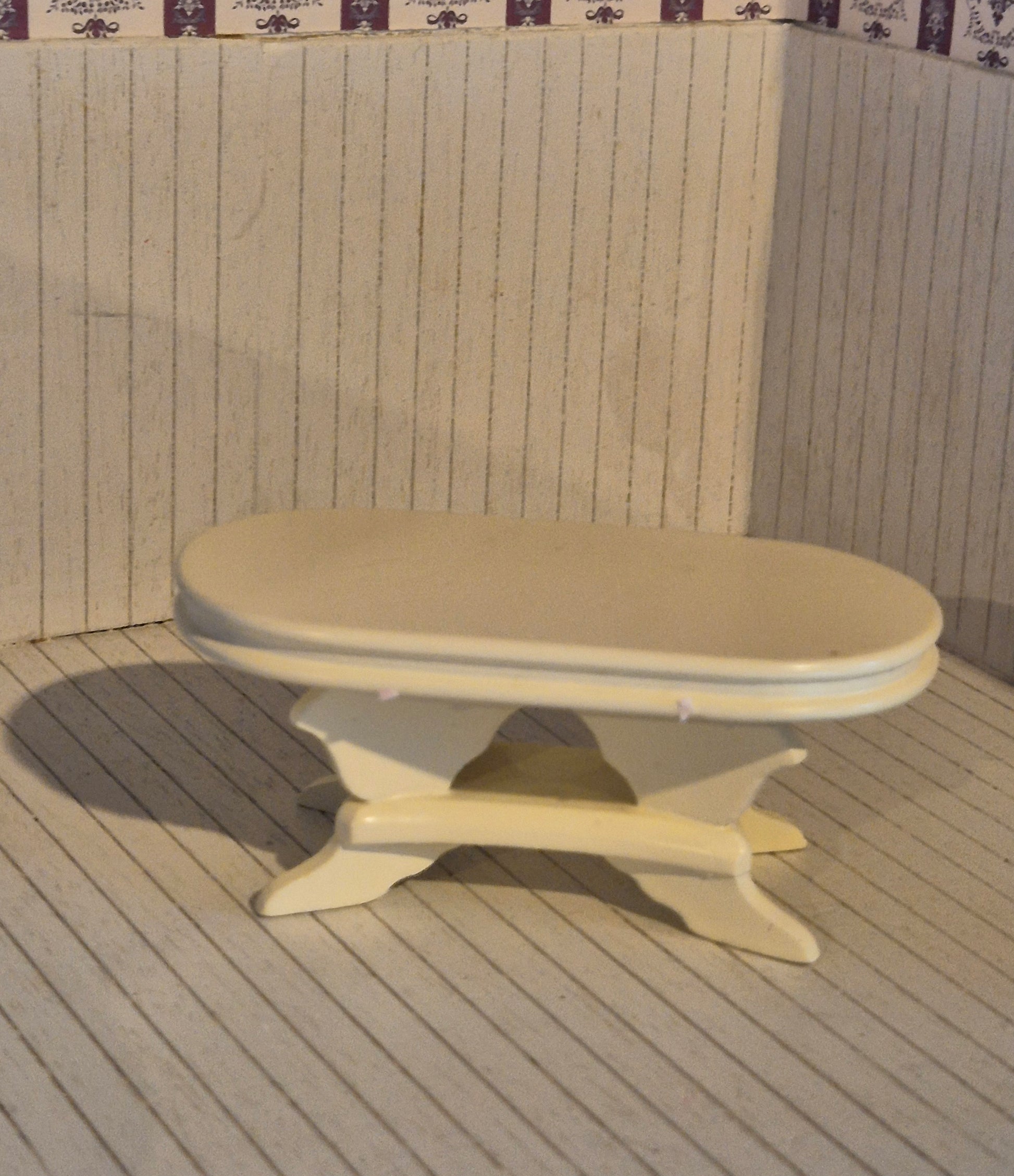 Ovalt hvidt sofabord str 1:12. Det er af træ.