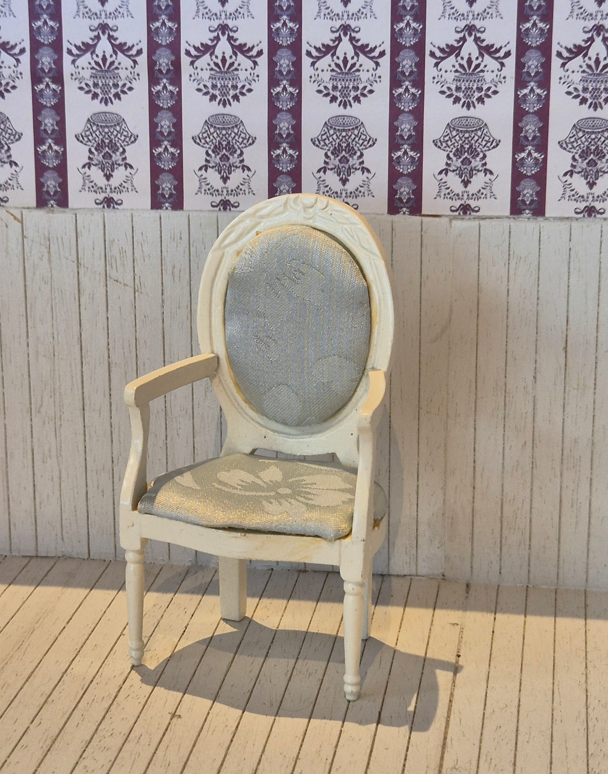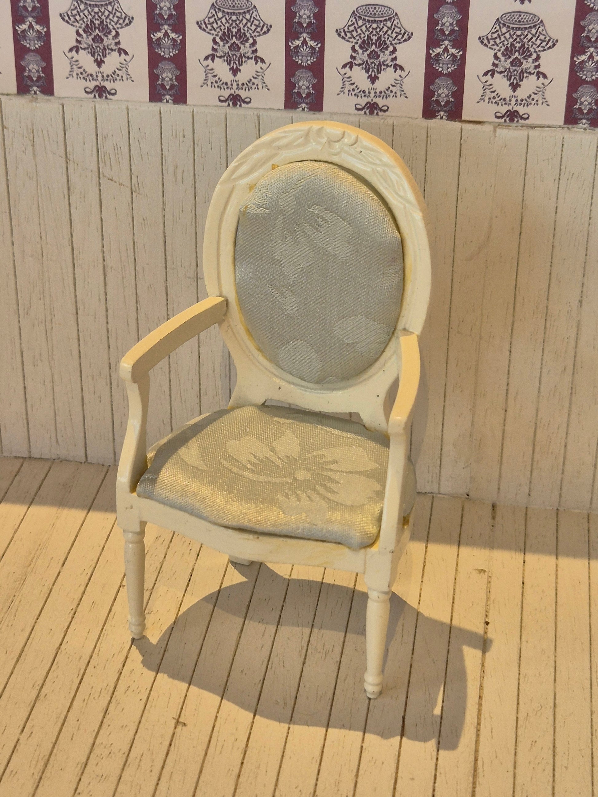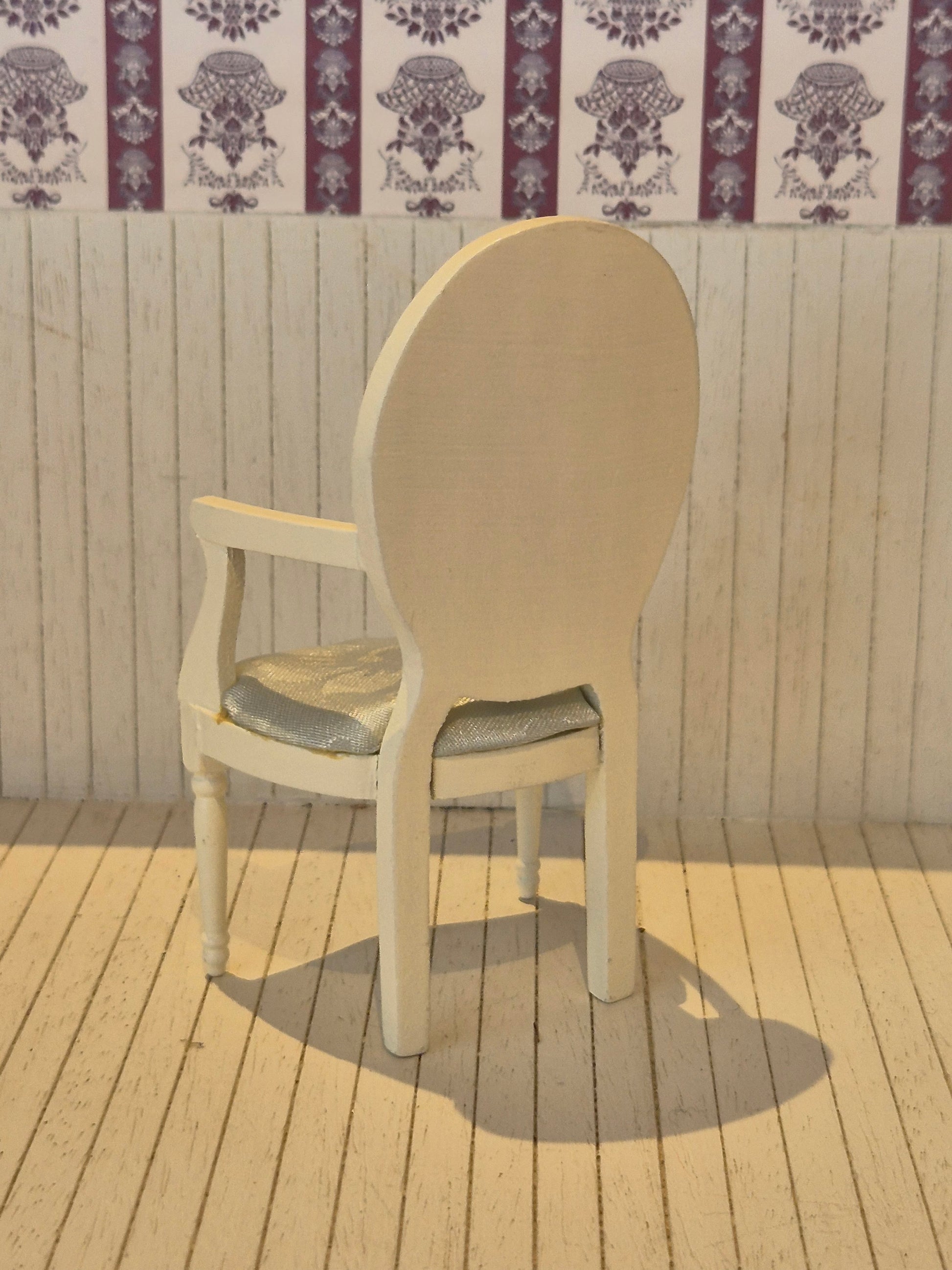 1:12 Nice white chair for the dollhouse. It is made of white wood with a silver satin flower print on the cover.