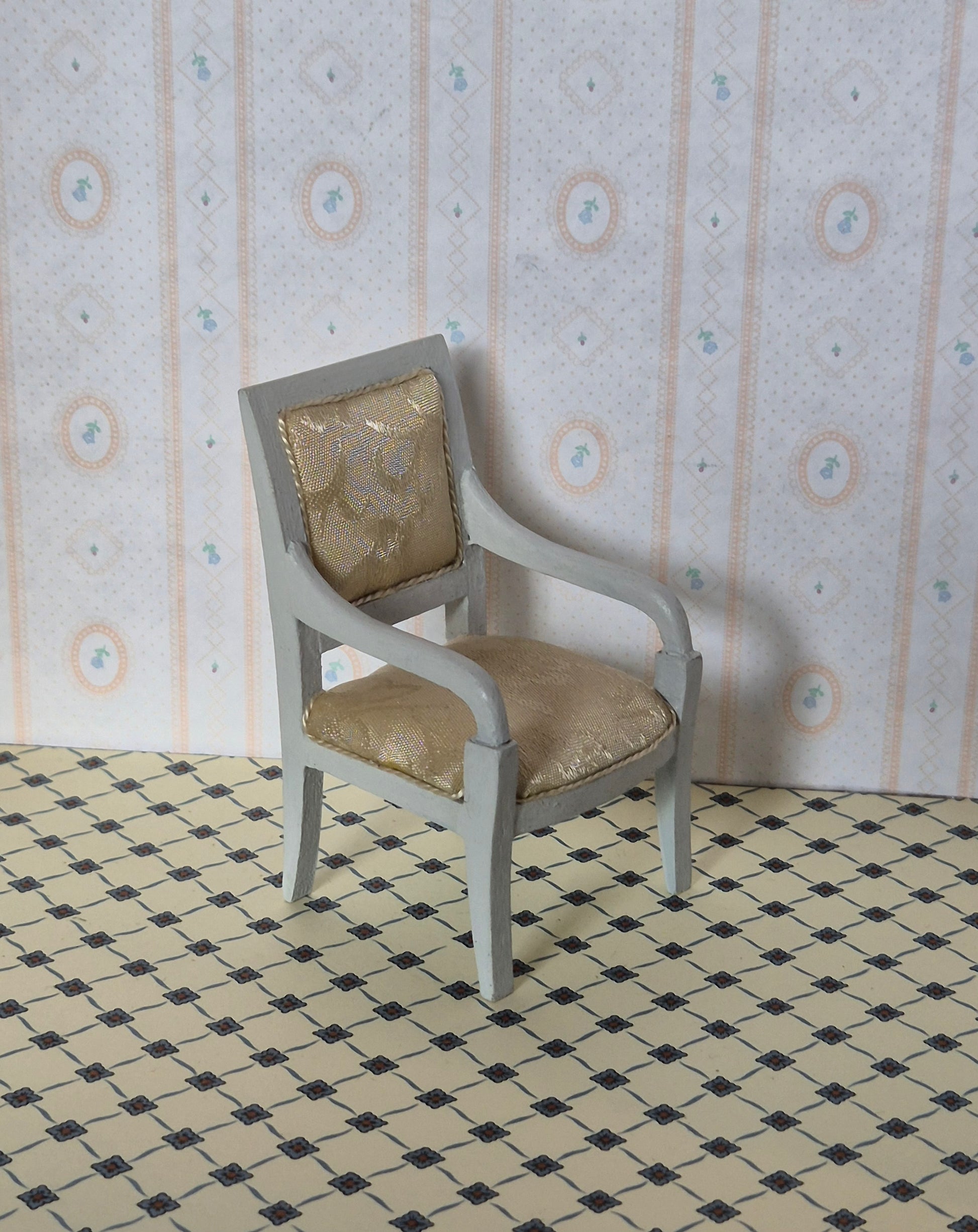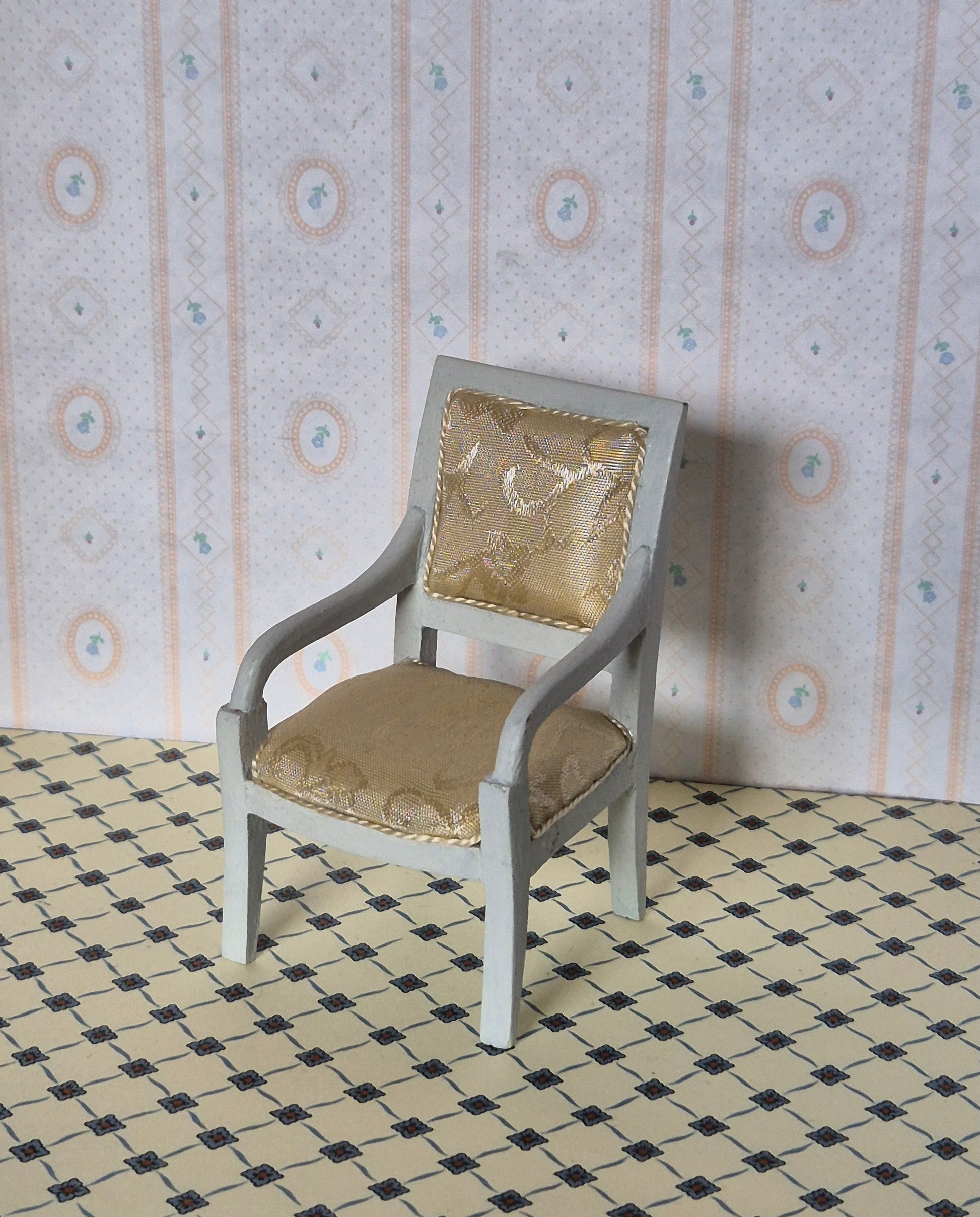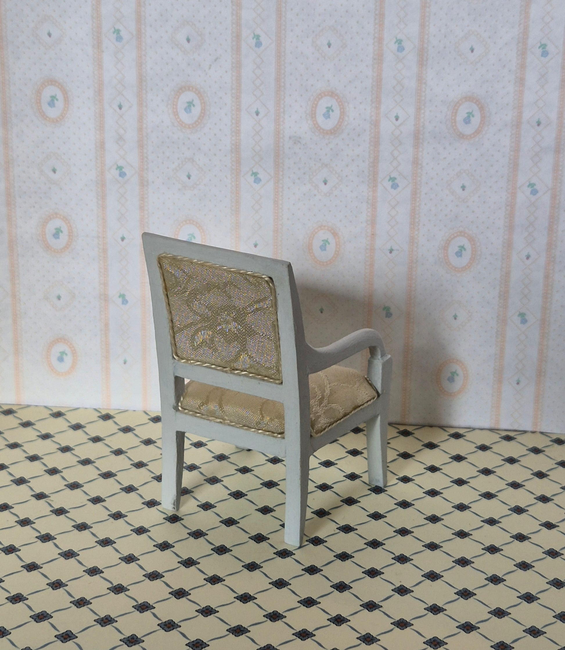 Stol der er malet og ombetrukket. Udmærket stand med patina og brugsspor, det kan ses at den er blevet renoveret. Det er 1:12.