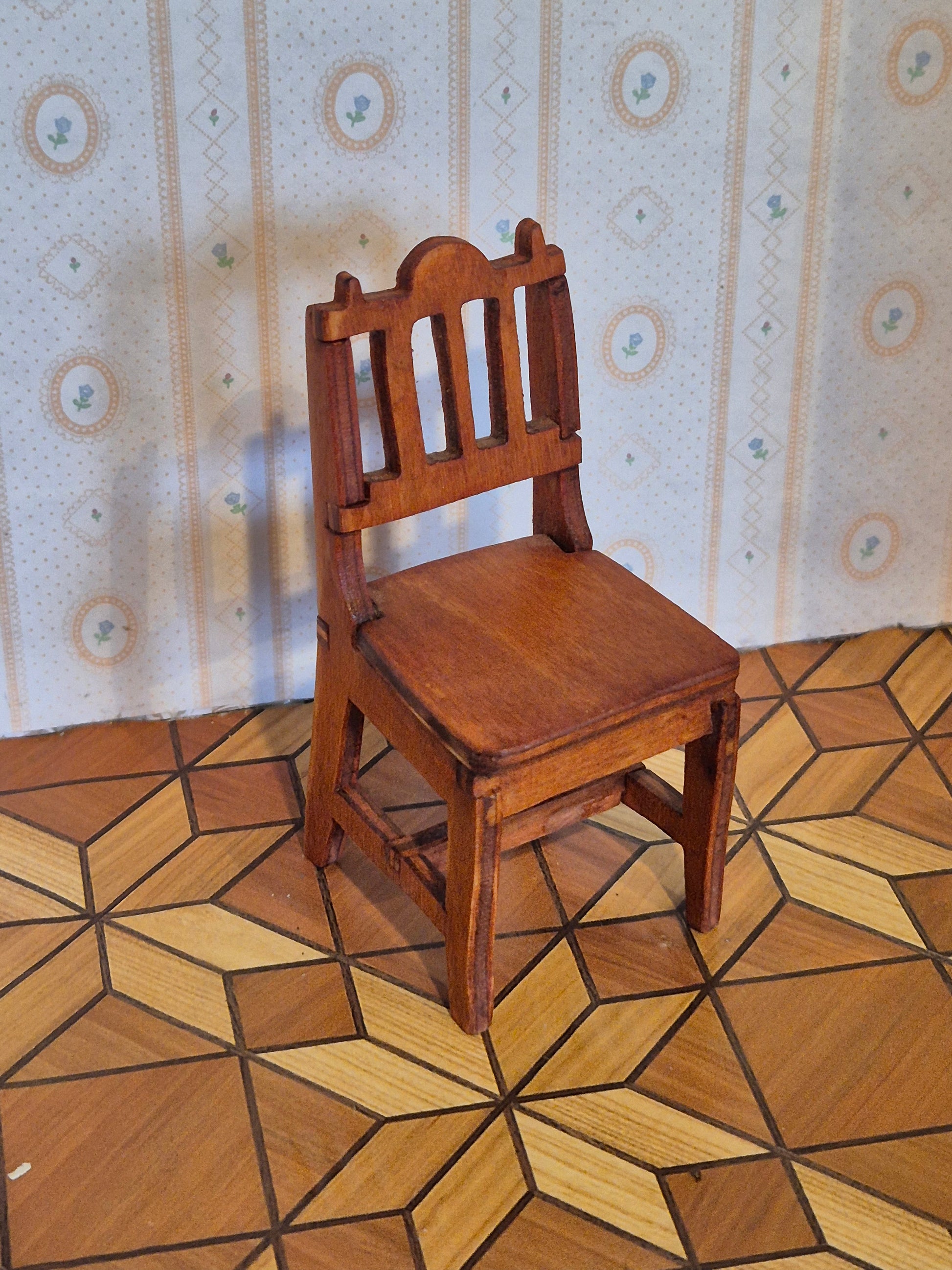 Stol af træ, der er blevet bejset eller lignende. Rustik stol 1:12