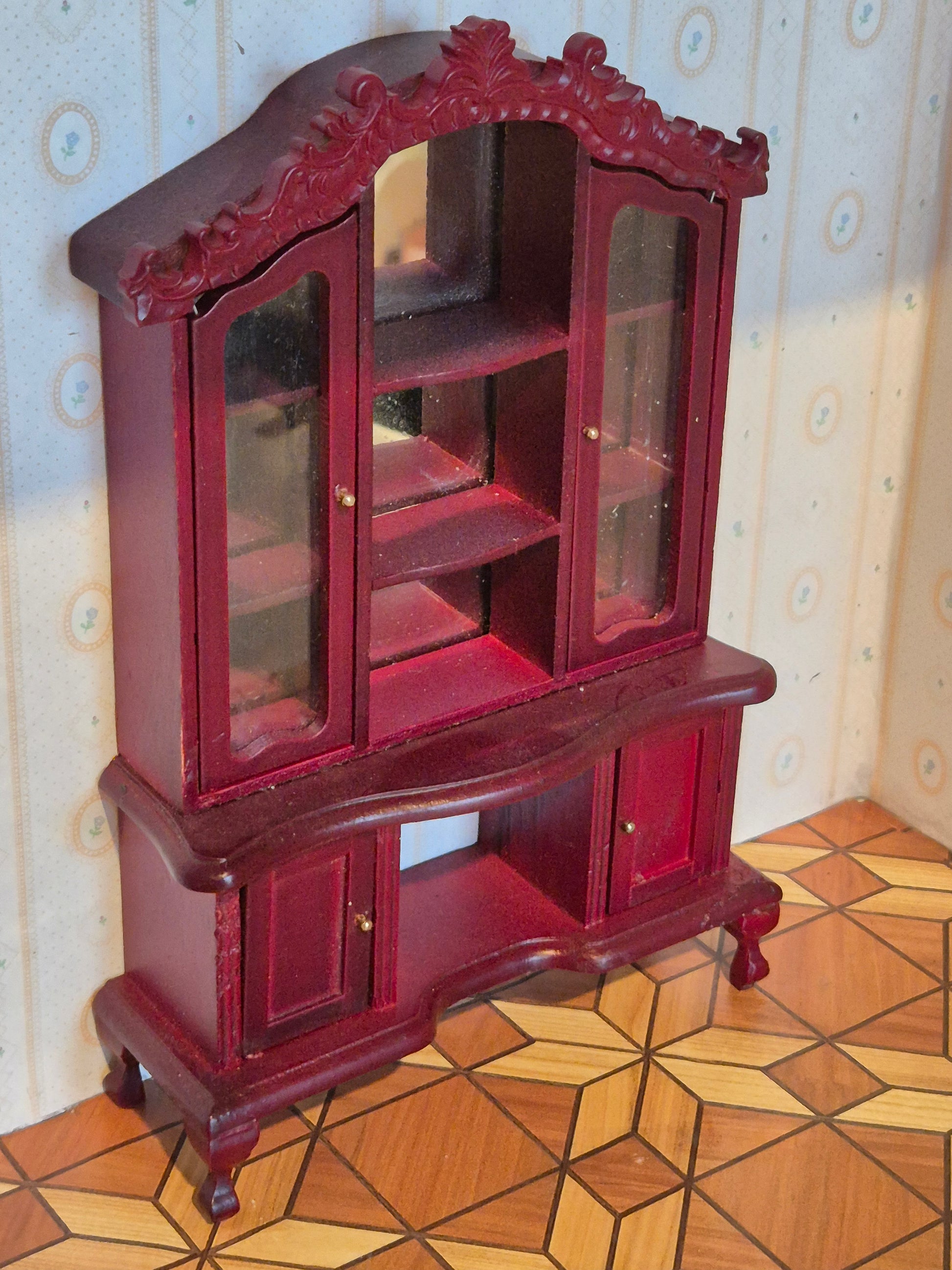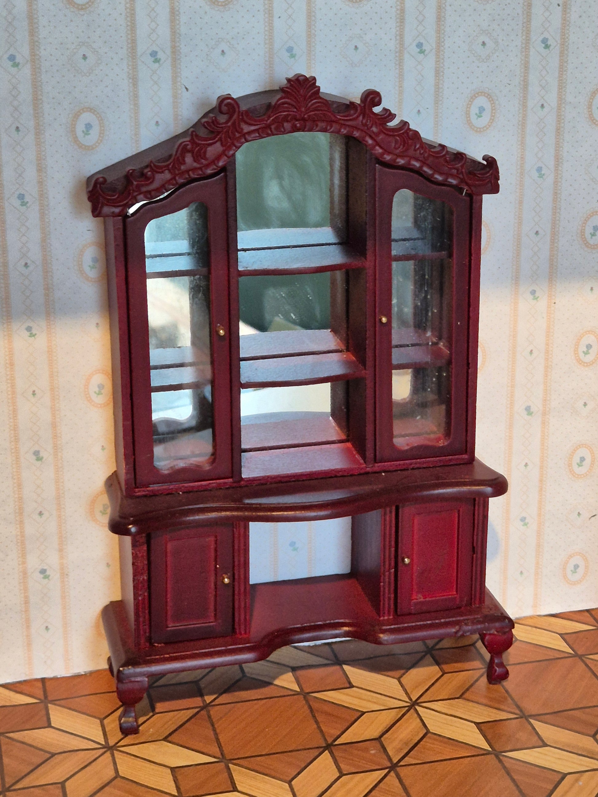 Stort flot og pænt Vitrine skab, dækketøjskabinet, i 1:12. Det er i rødbrun nuance i maghoni-look med bagvæg med spejl, fine detaljer og udskæringer.