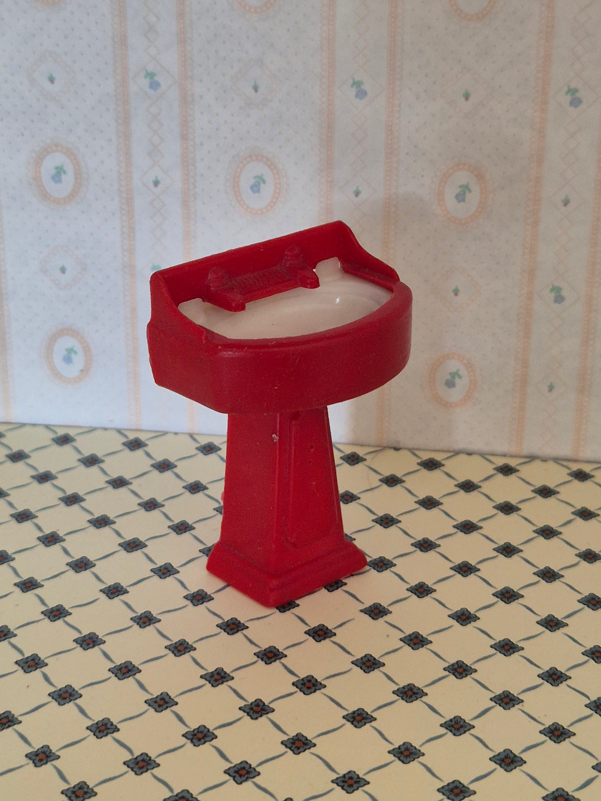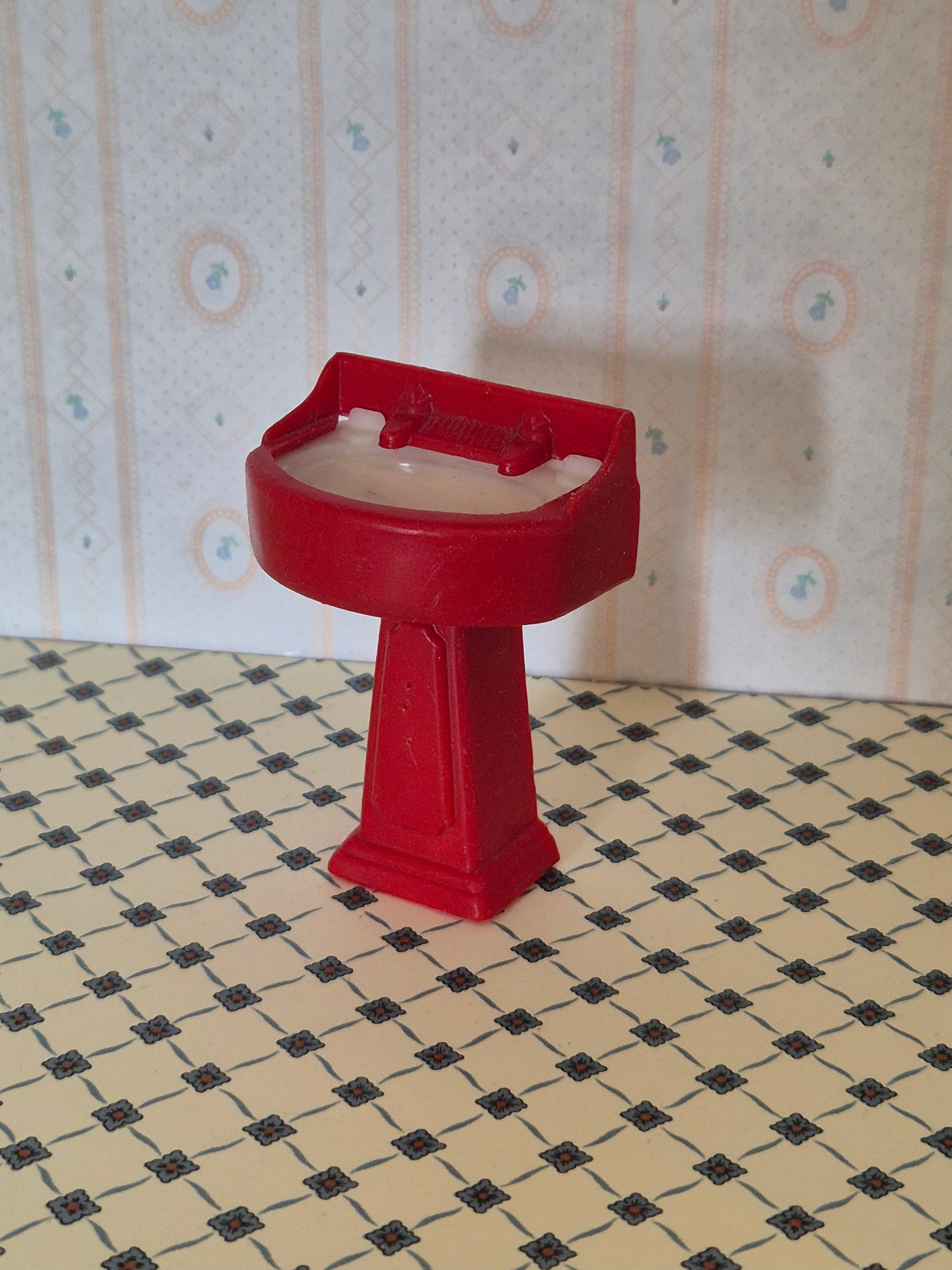 Fin 1:16 Kleeware håndvask til badeværelset. Udmærket stand. Rød og hvid håndvask.