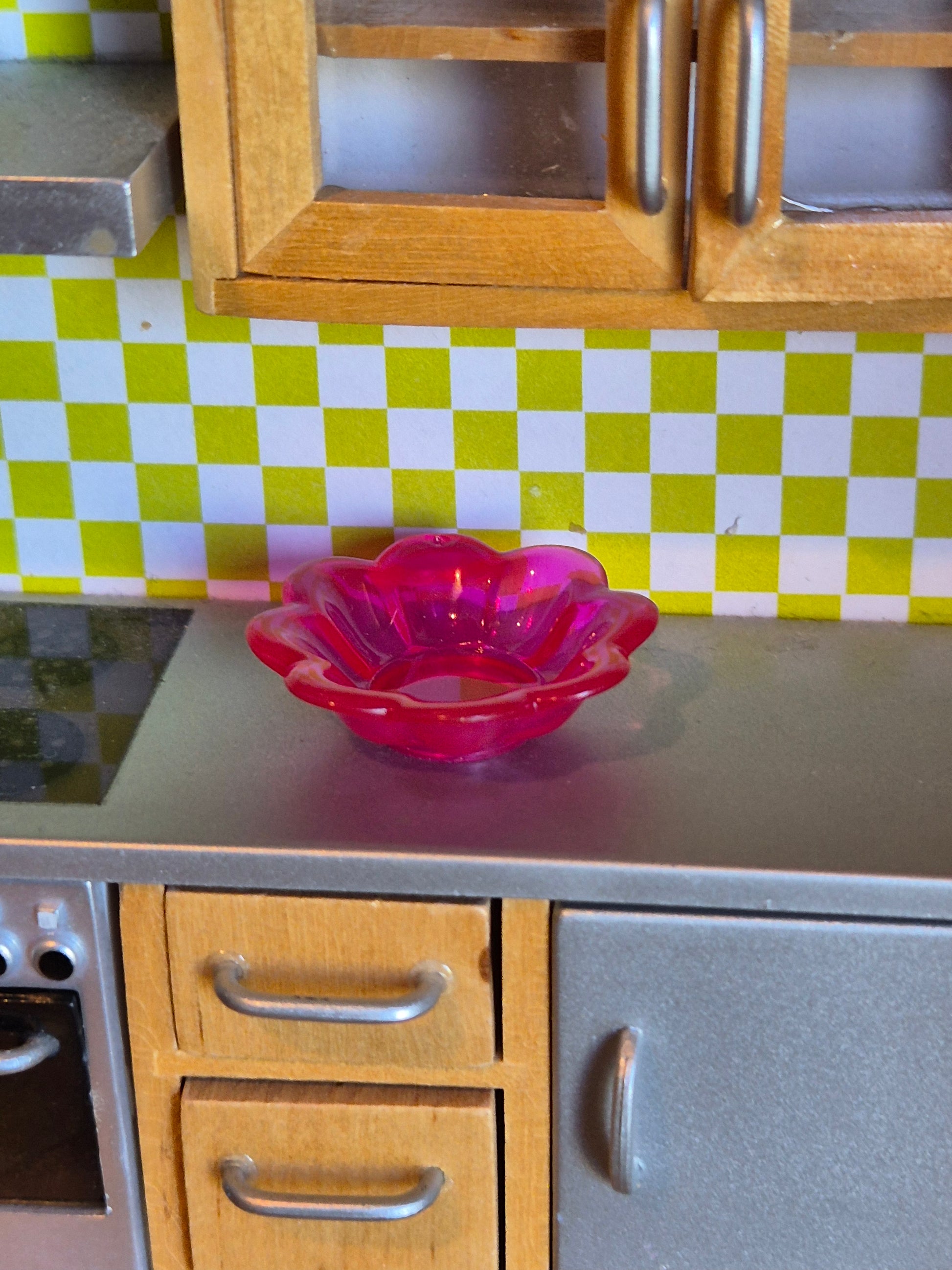 Pink skål 1:16. Den er af plast. Nærmest gennemsigtig. Ukendt mærke.