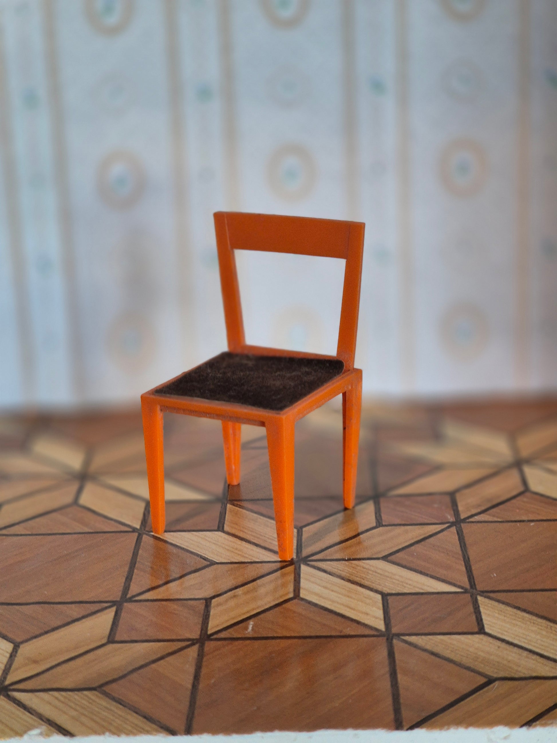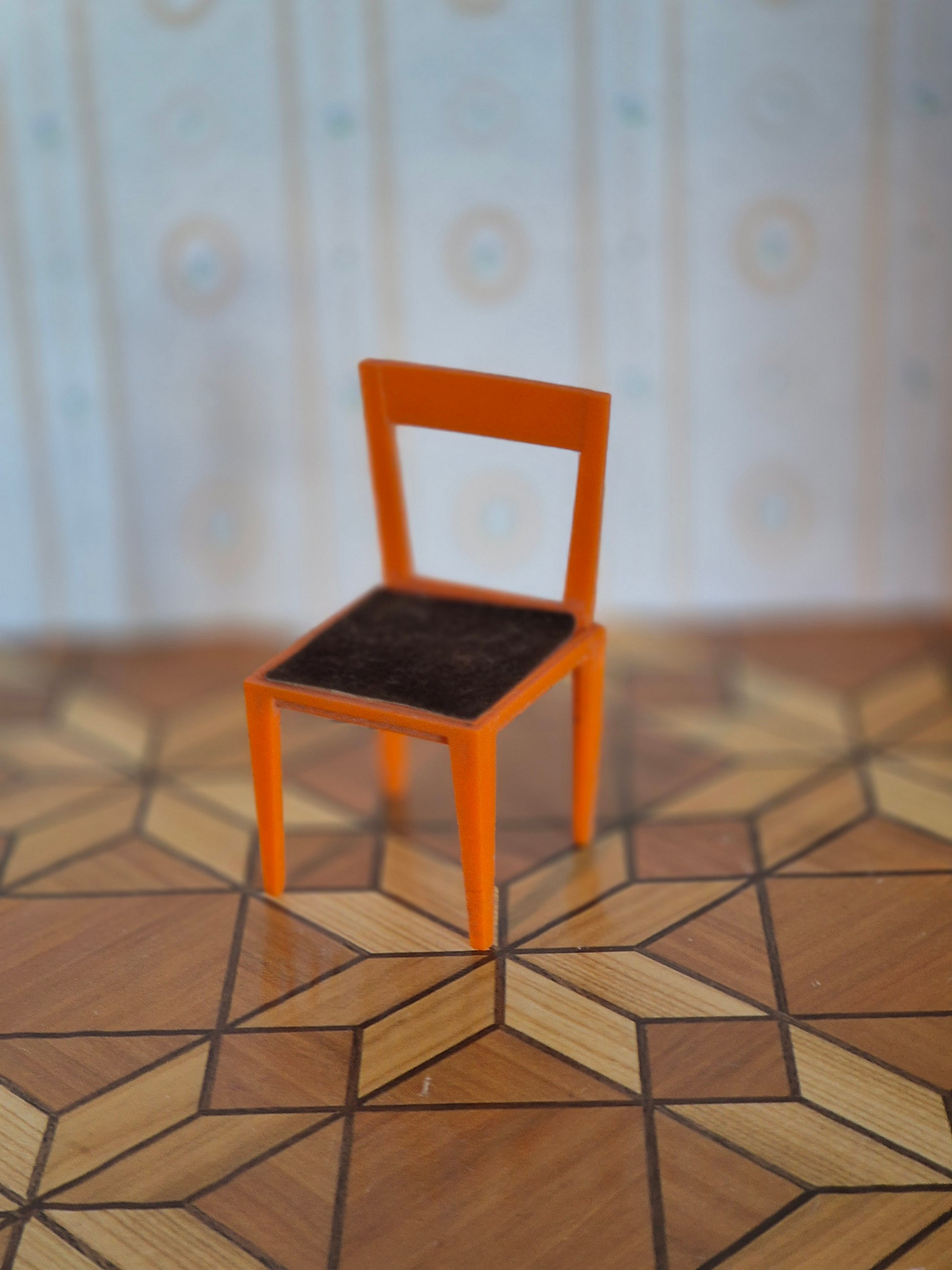 Dukkehus stol. Orange plastik stol med brunt sæde 1:16.