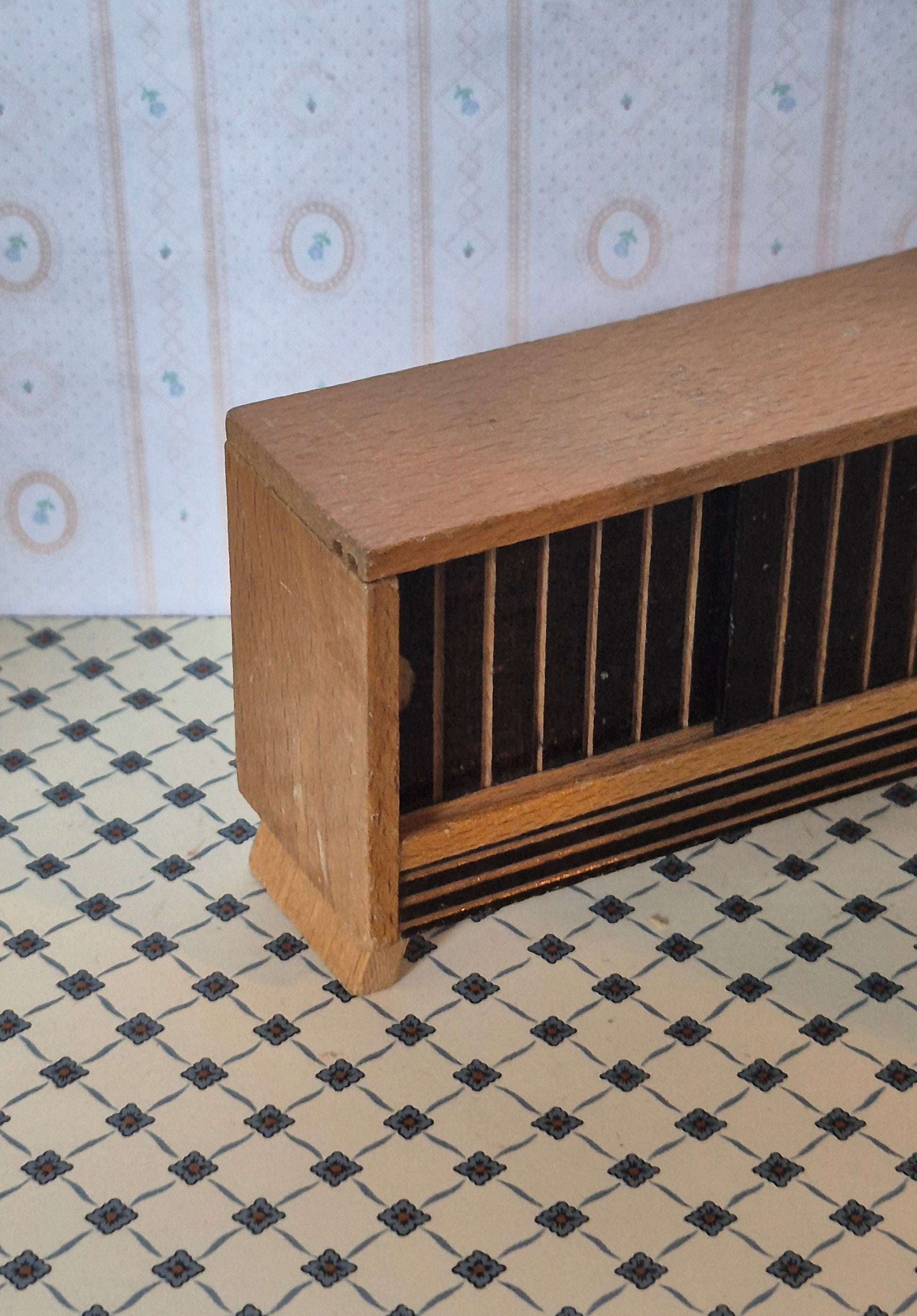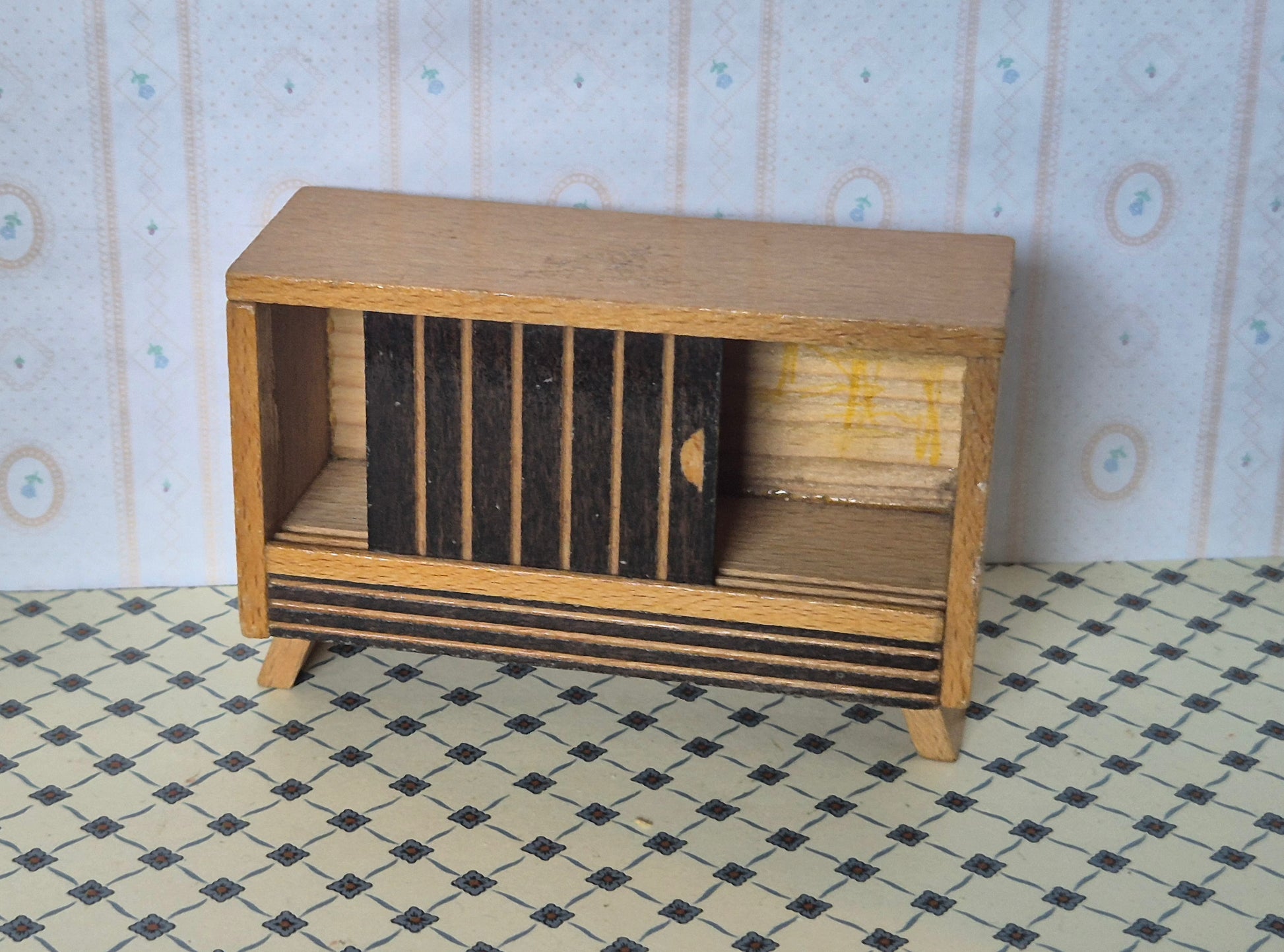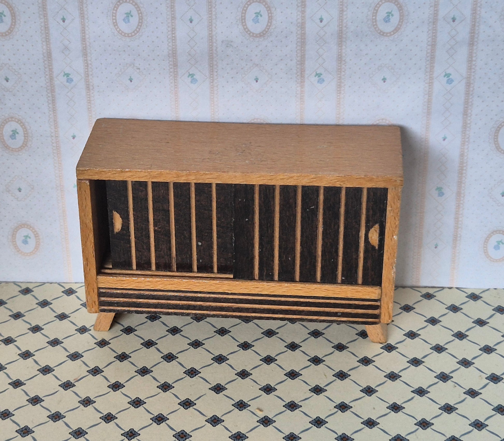 Pæn vintage skænk af træ med 2 skydelåger. God stand. Velholdt. Den passer bedst til 1:16, sog i den store ende af skalaen.