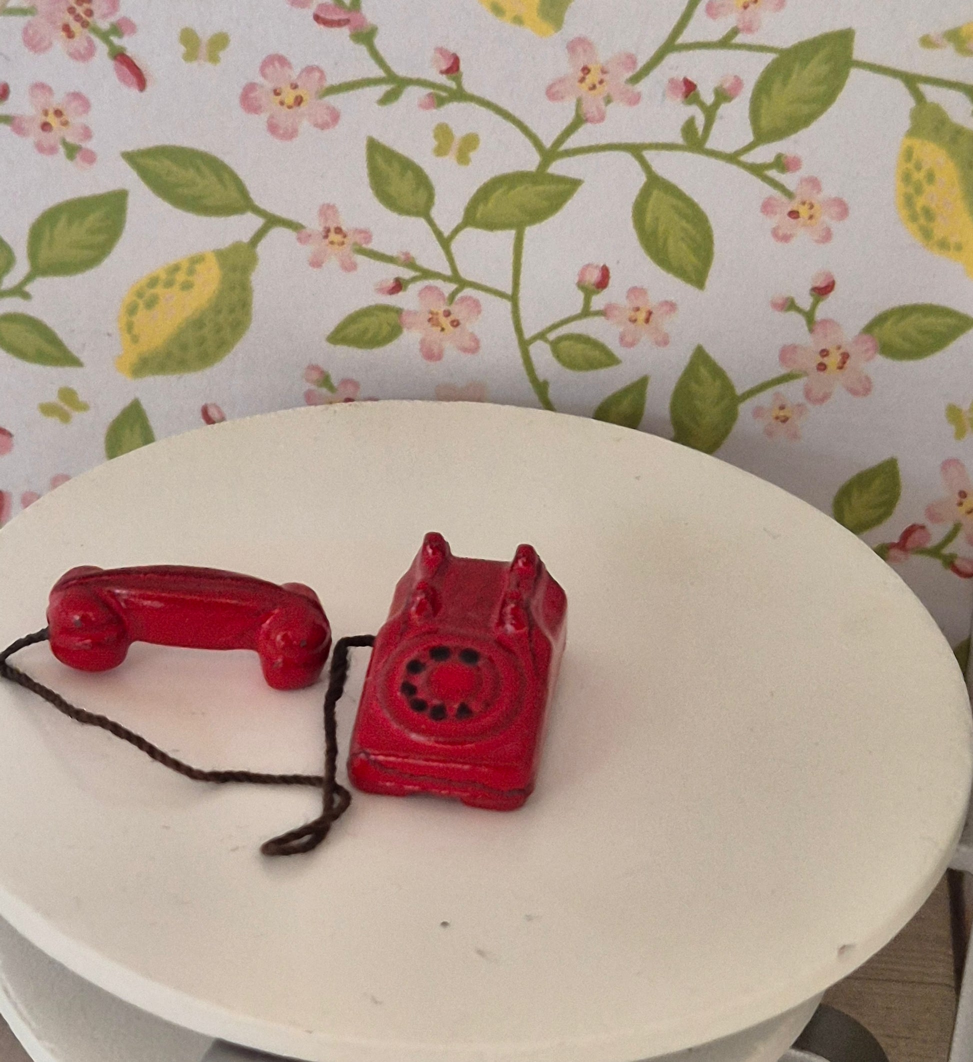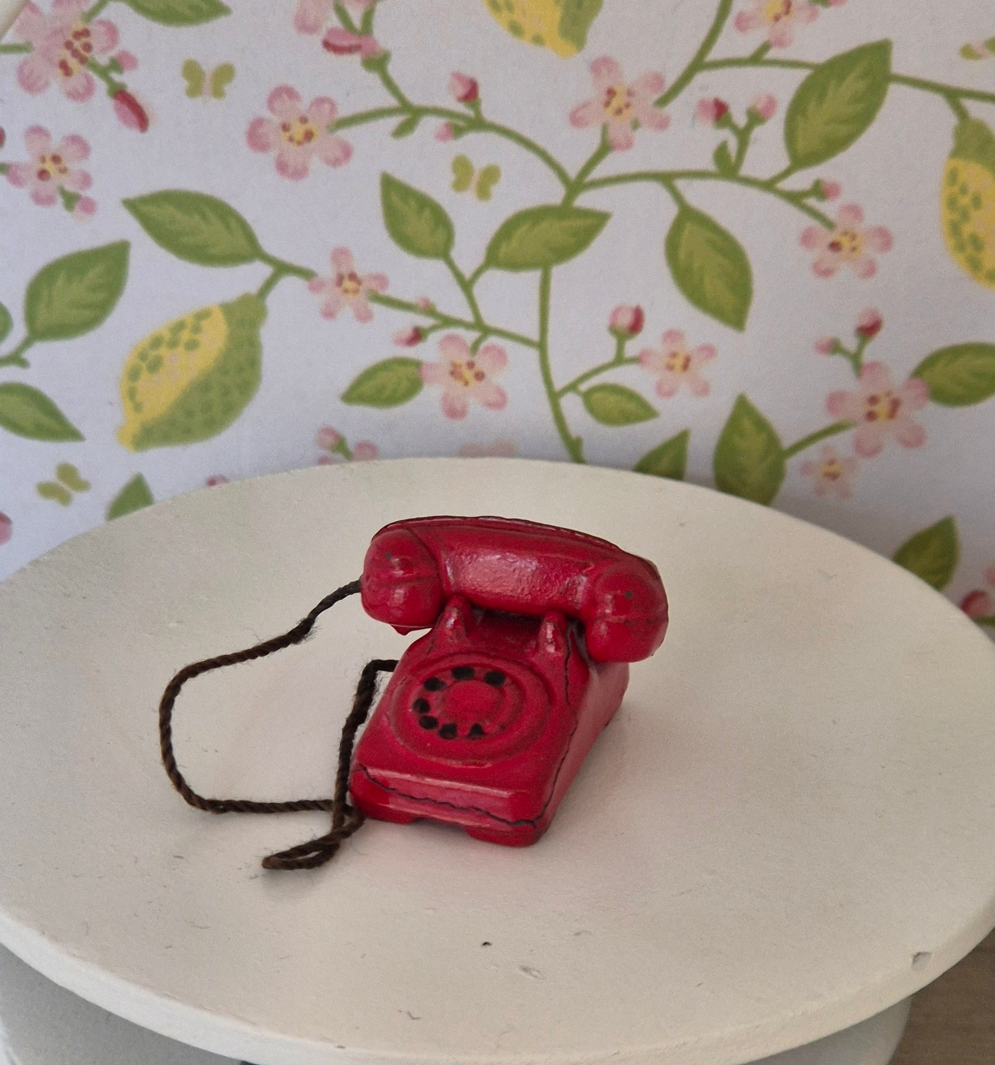 Rød vintage telefon af metal til dukkehus