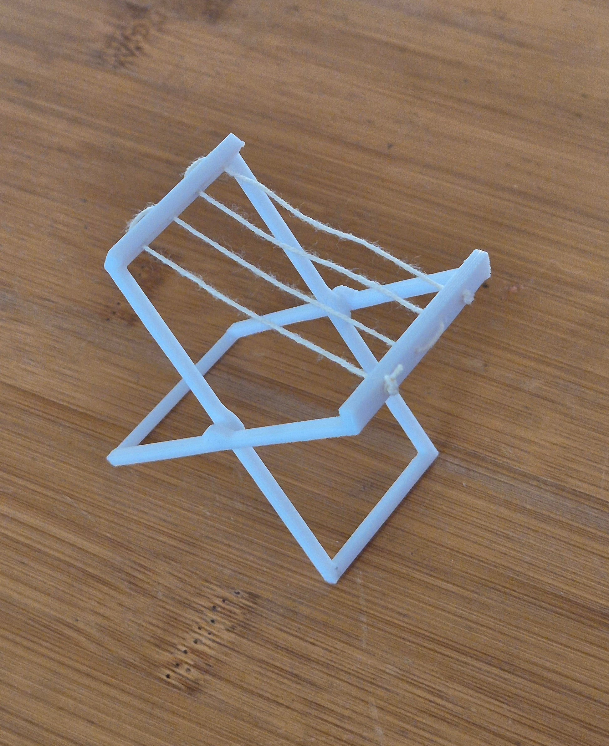 Nice white 3D printed drying rack with cords for the dollhouse residents' laundry. It fits scale 1:16 / 1:18.