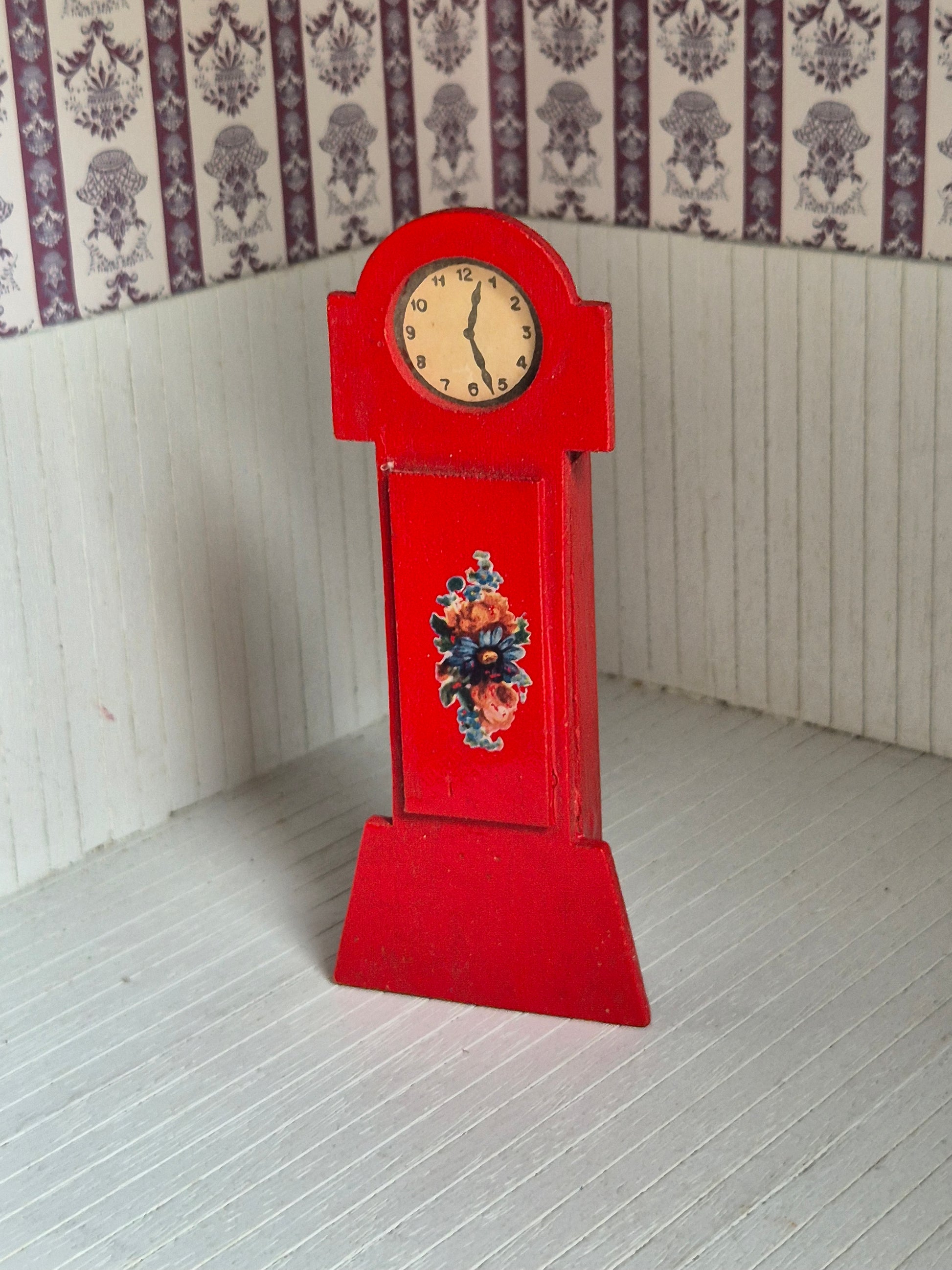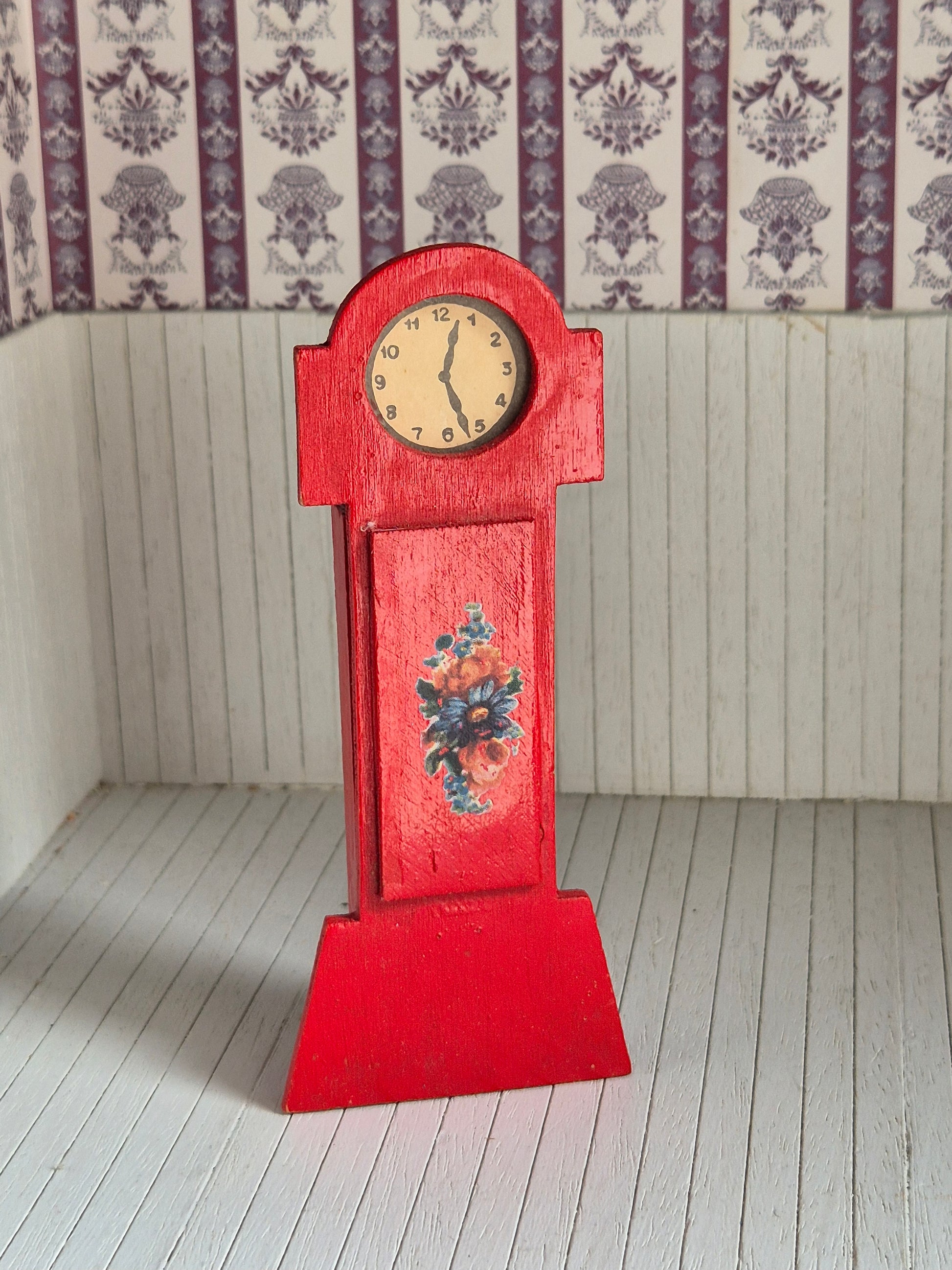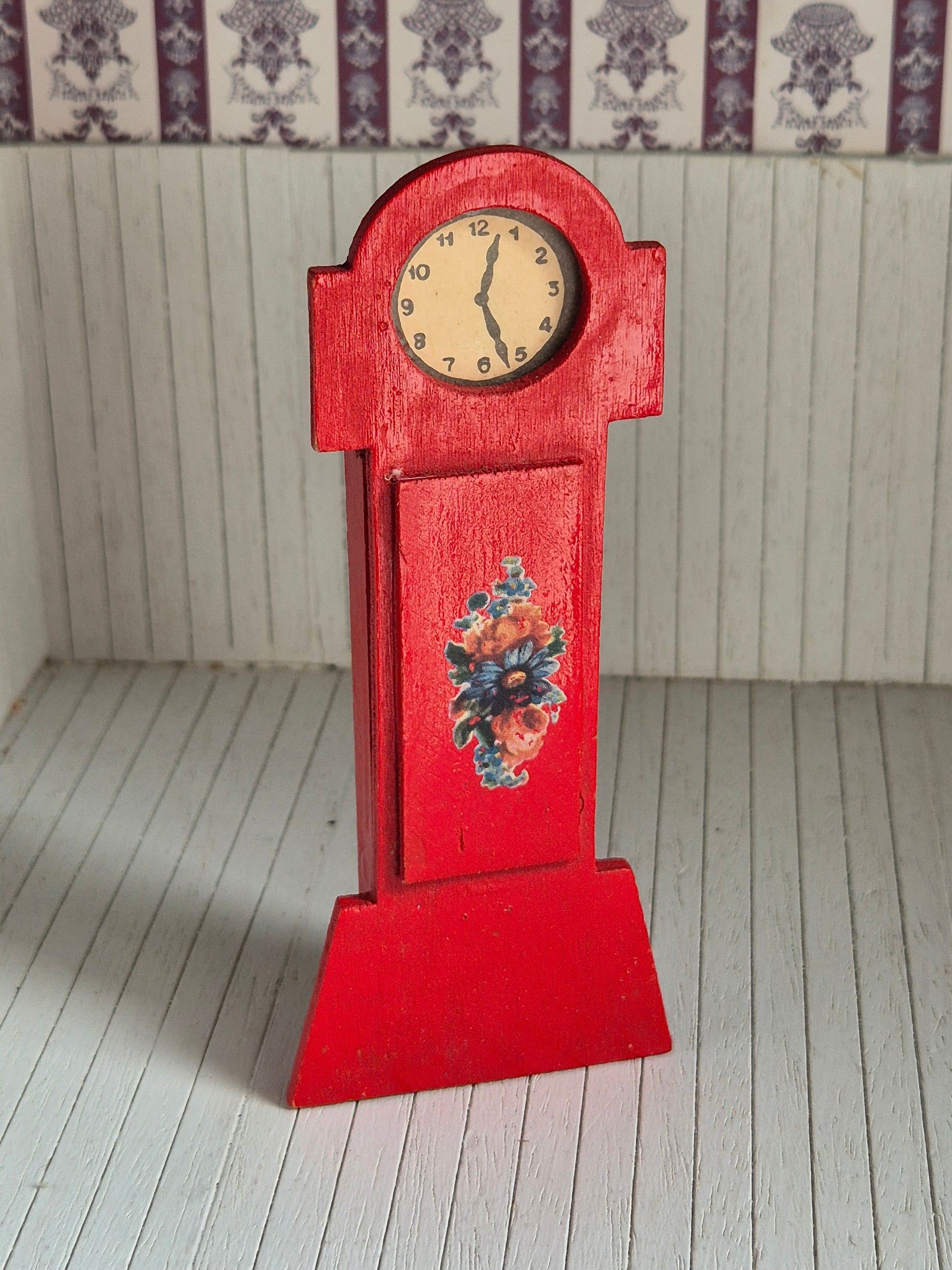 Rødt vintage ur, standerur, str 1:16. Det er af træ.