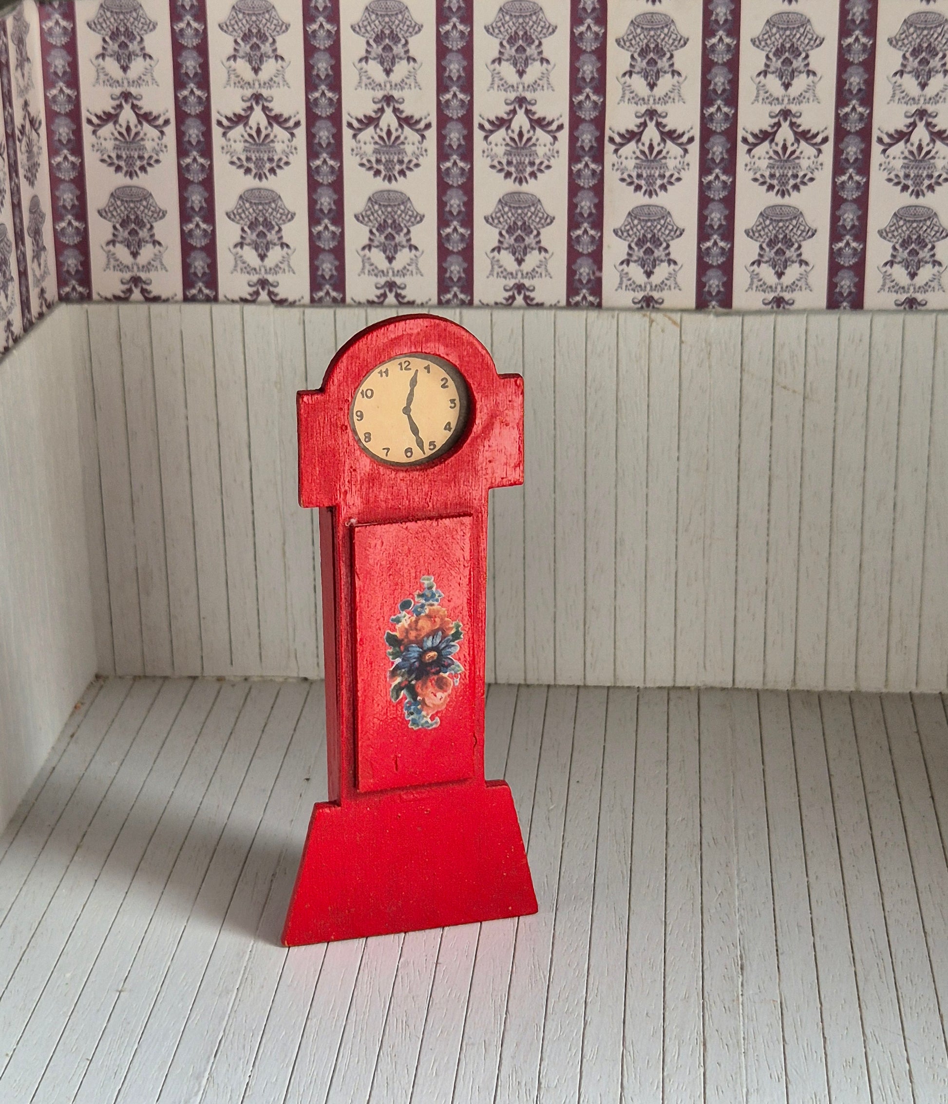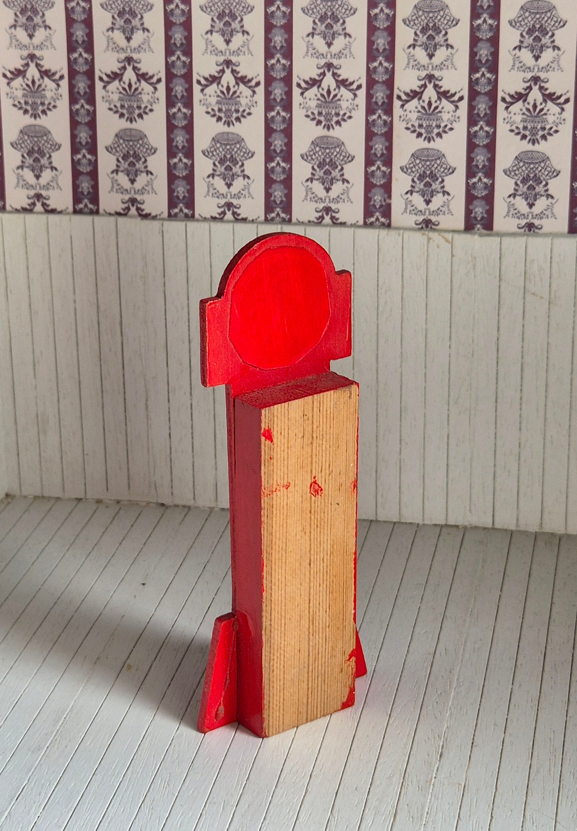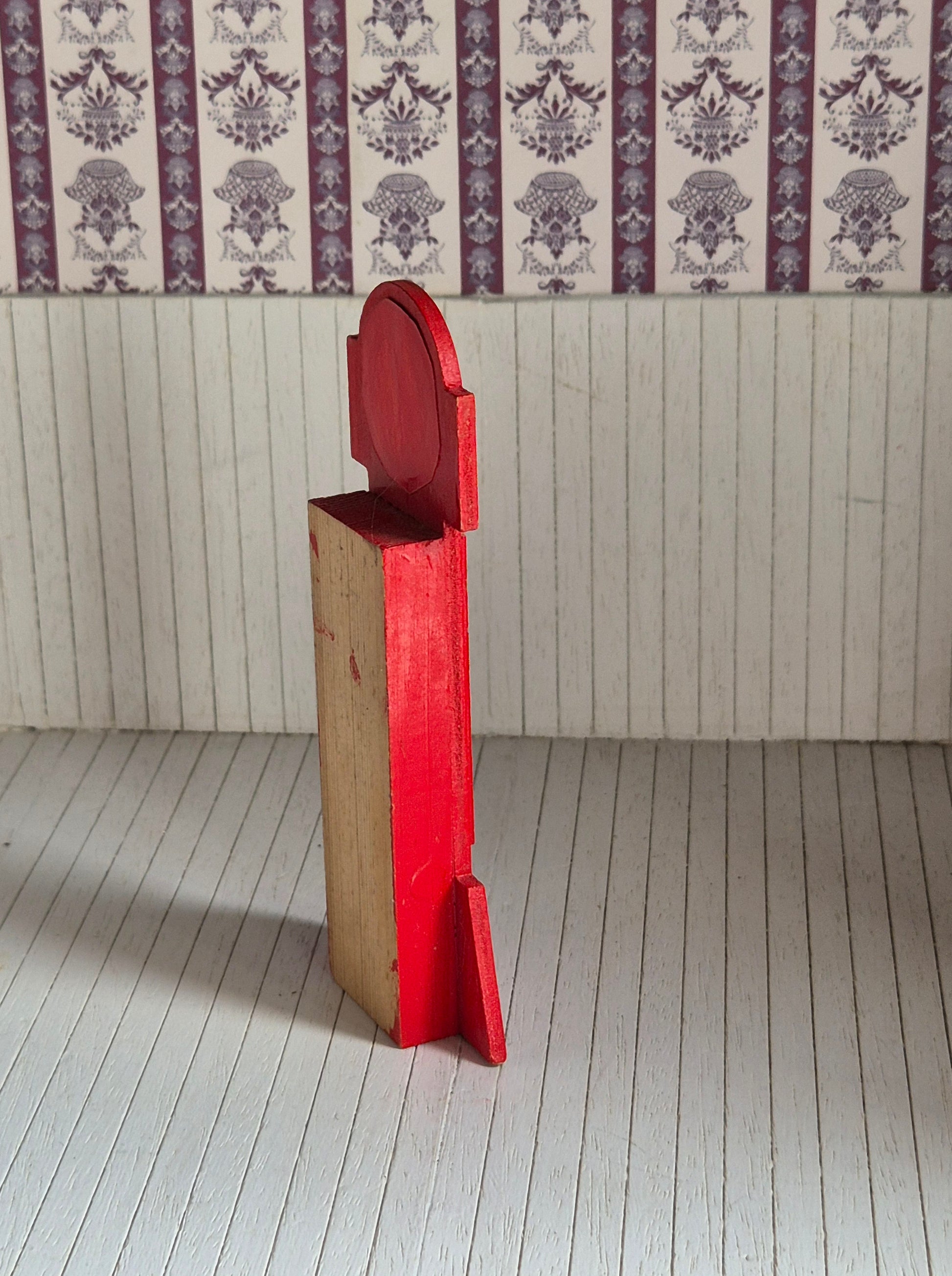 Rødt vintage ur, standerur, str 1:16. Det er af træ.