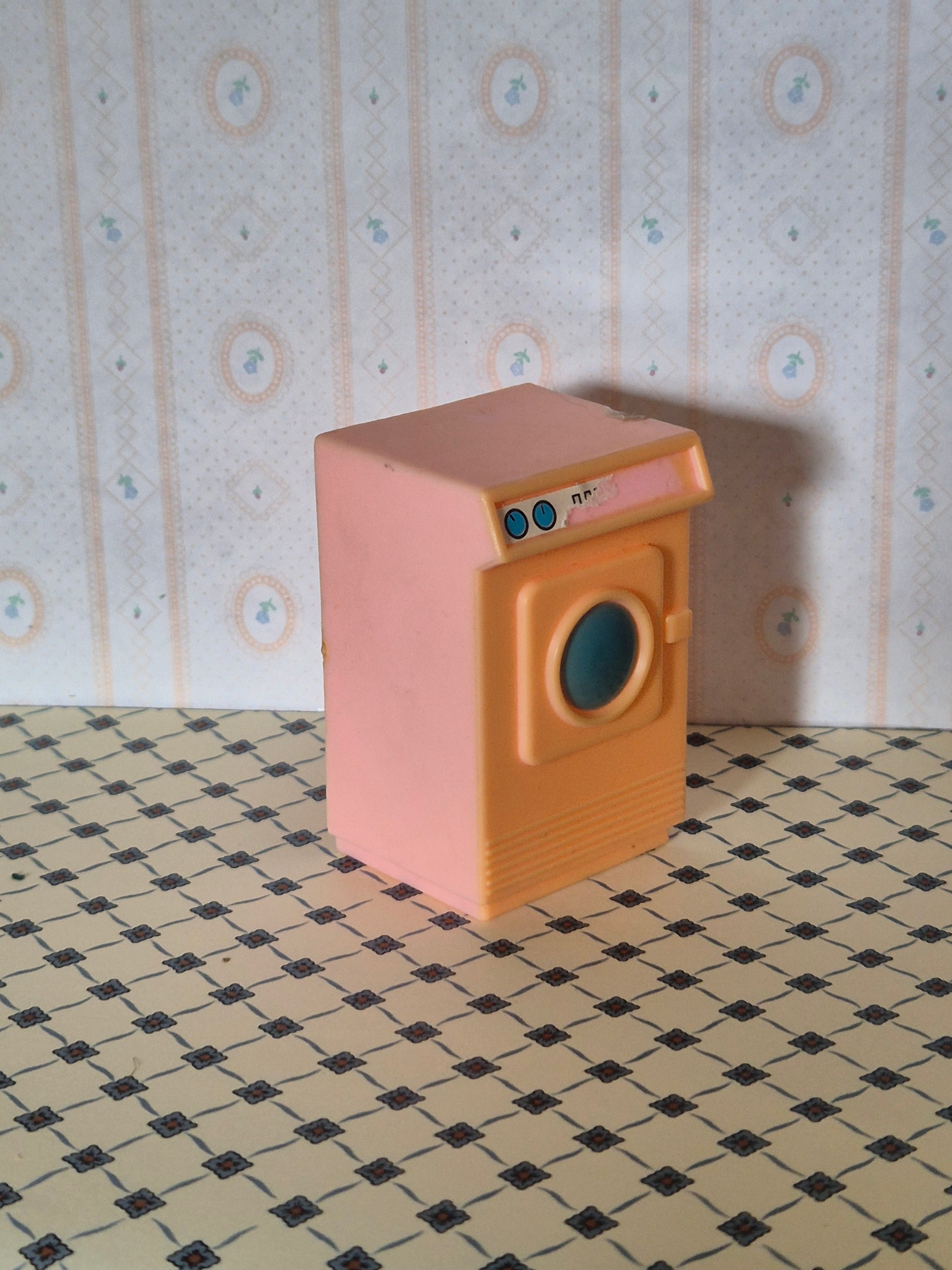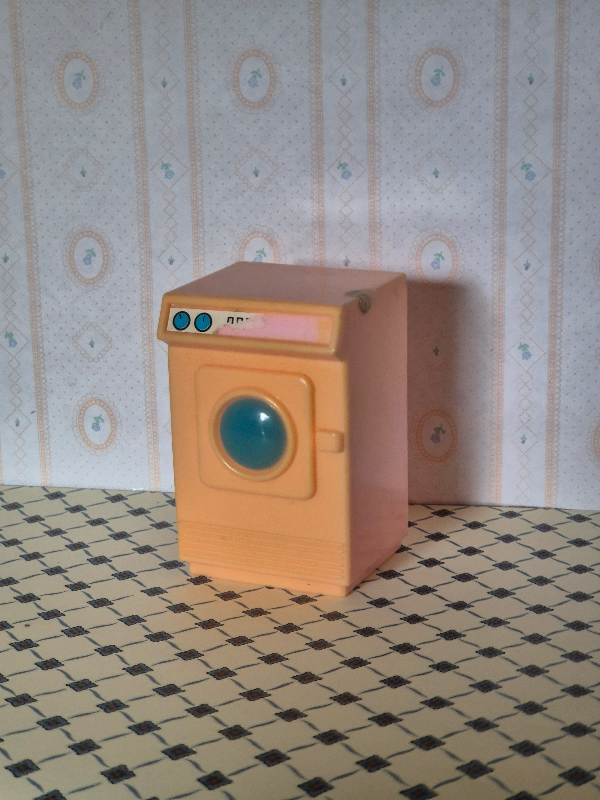Vintage / retro vaskemaskine af plast, der er gulnet. Den er 1:18 - 1:16. Der er patina og brugsspor.